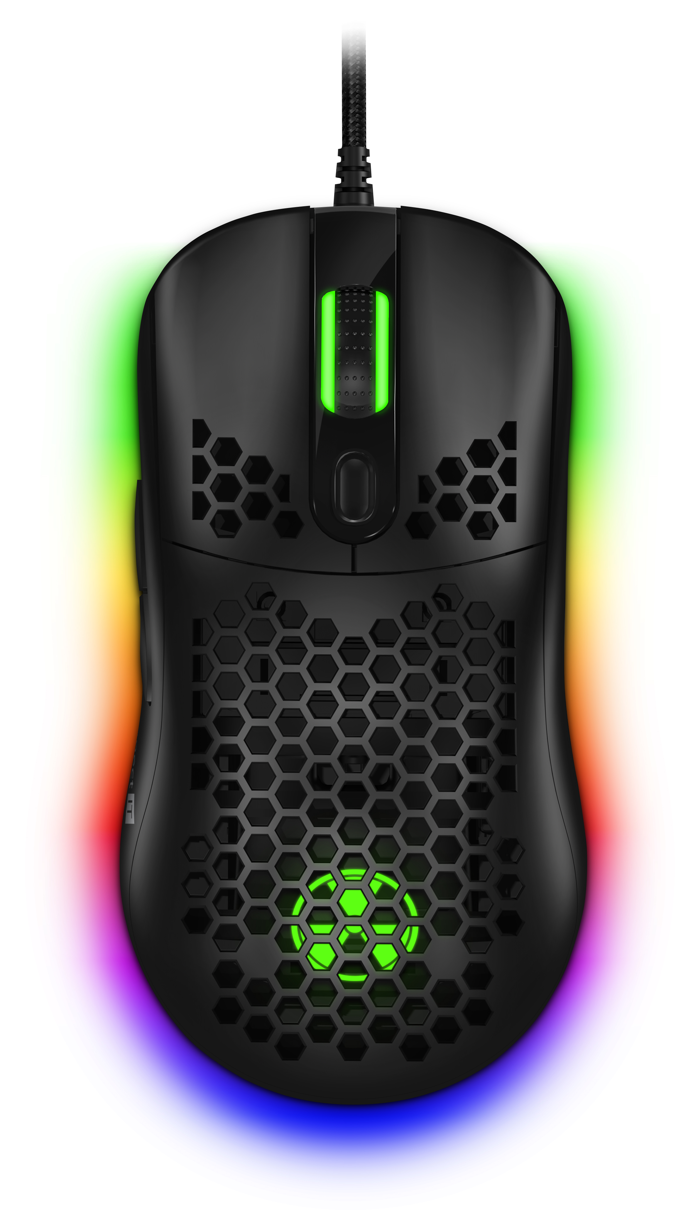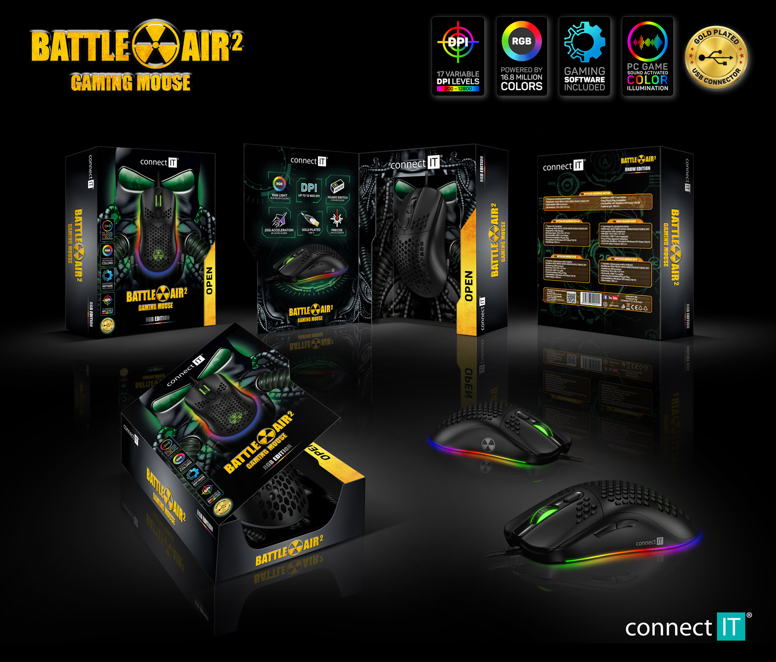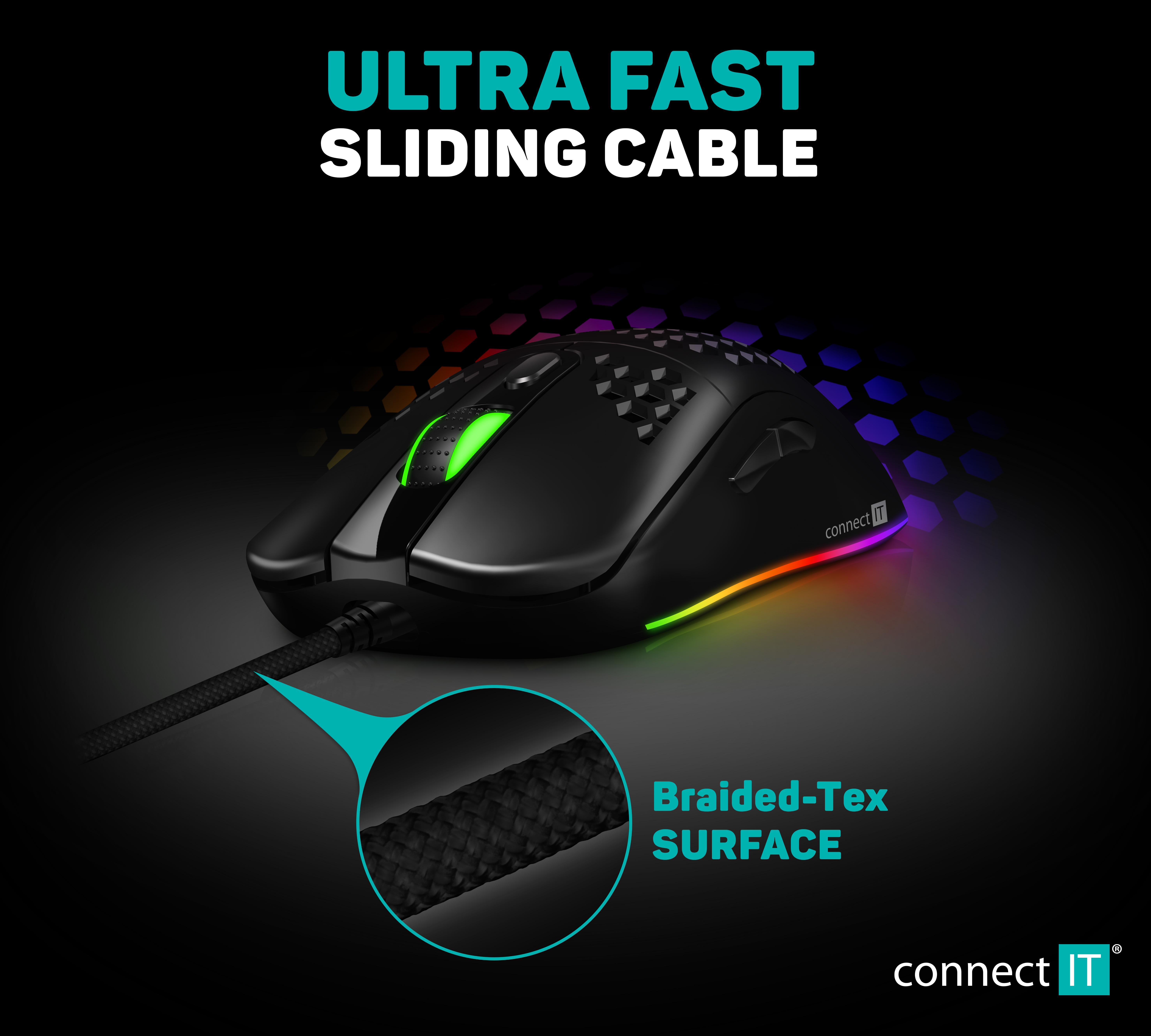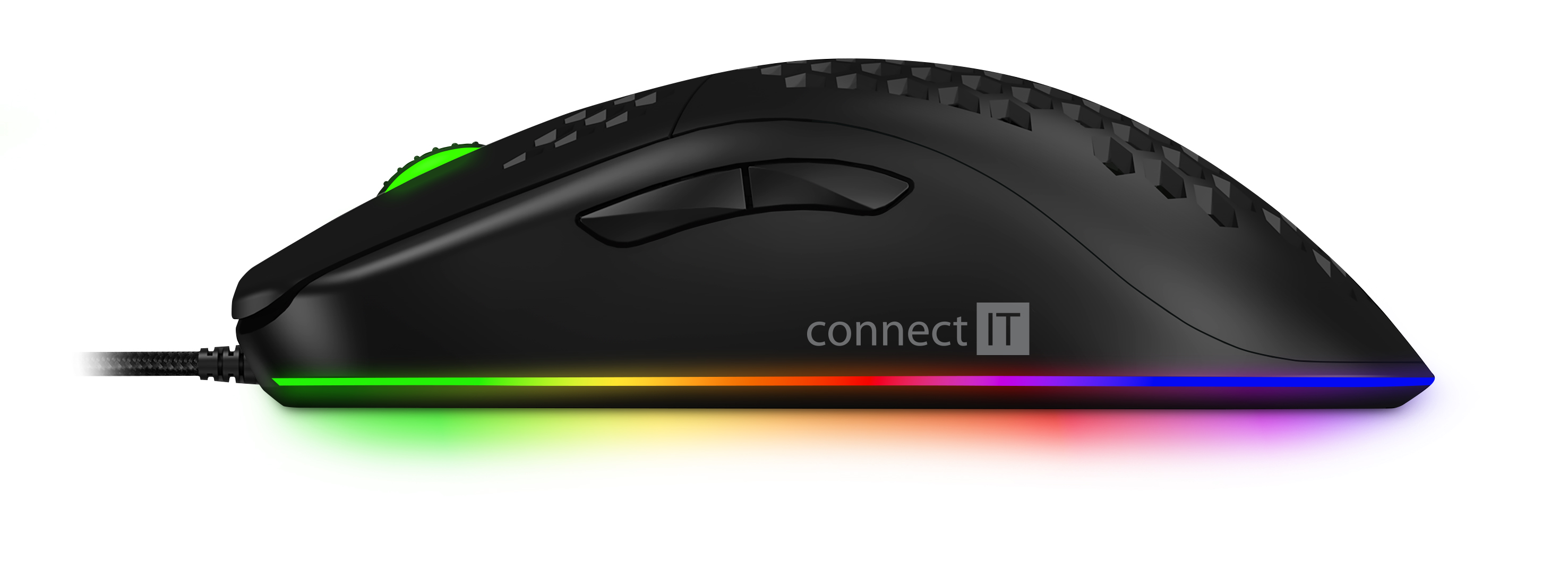 Výhody produktu: Kromě běžných funkcí je tato myš unikátní svojí odlehčenou konstrukcí. Díky perforaci těla myši a tlačítek speciálním hexagonovým tvarem, kterým došlo ke snížení váhy myši o 50%. Tento typ perforace zajistí maximální grip a stabilitu při dlouhodobém hraní. K této myši je dodáván software ke stažení zcela zdarma na stránkách www.connectit-europe.com. Samozřejmostí je u této série prémiový oplet přívodního kabelu a pozlacený USB konektor.