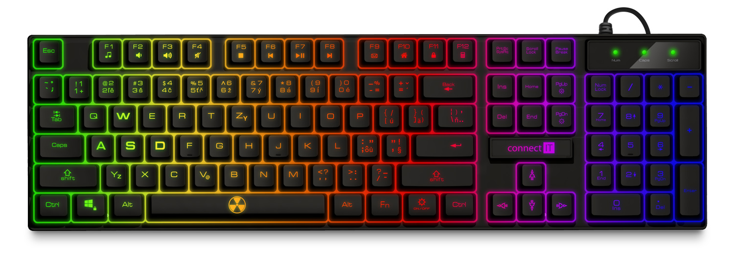 Technické údaje: Určena pro profesionální i amatérské hráče počítačových her; CZ + SK verze; Barevné RNBW LED podsvícení všech kláves i znaků pro použití večer, v noci nebo obecně za zhoršených světelných podmínek; 3 stupňová regulace intenzity světla; Možnost úplného vypnutí podsvícení; Klasické rozložení kláves.