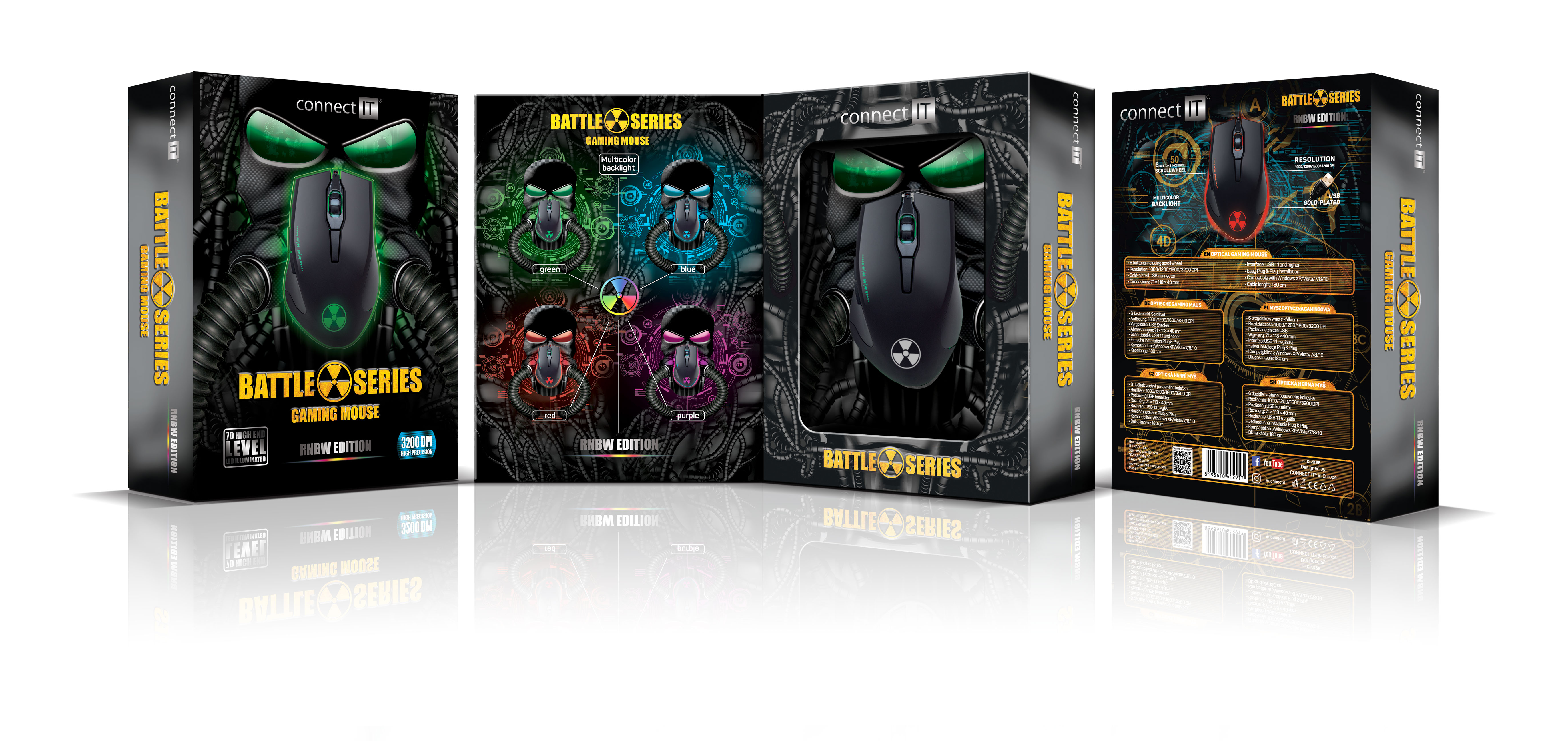 Klíčové vlastnosti: Optická herní myš BATLLE RNBW edition pro hráče počítačových her (pro amatérské i profesionální použití). Tato designová myš padne ihned do ruky a její vícebarevné podsvícení potěší každého náročného uživatele. Optický senzor myši má rozlišení až 3200 DPI s možností přepínání na nižší rozlišení 1600, 1200 a 1000 DPI podle potřeby. Myš je vybavena šesti tlačítky a rolovacím kolečkem, které zároveň slouží jako prostřední tlačítko. Myš stačí připojí k počítači pomocí USB rozhraní a bez jakékoliv zdlouhavé instalace můžete co nejdřív hrát.
