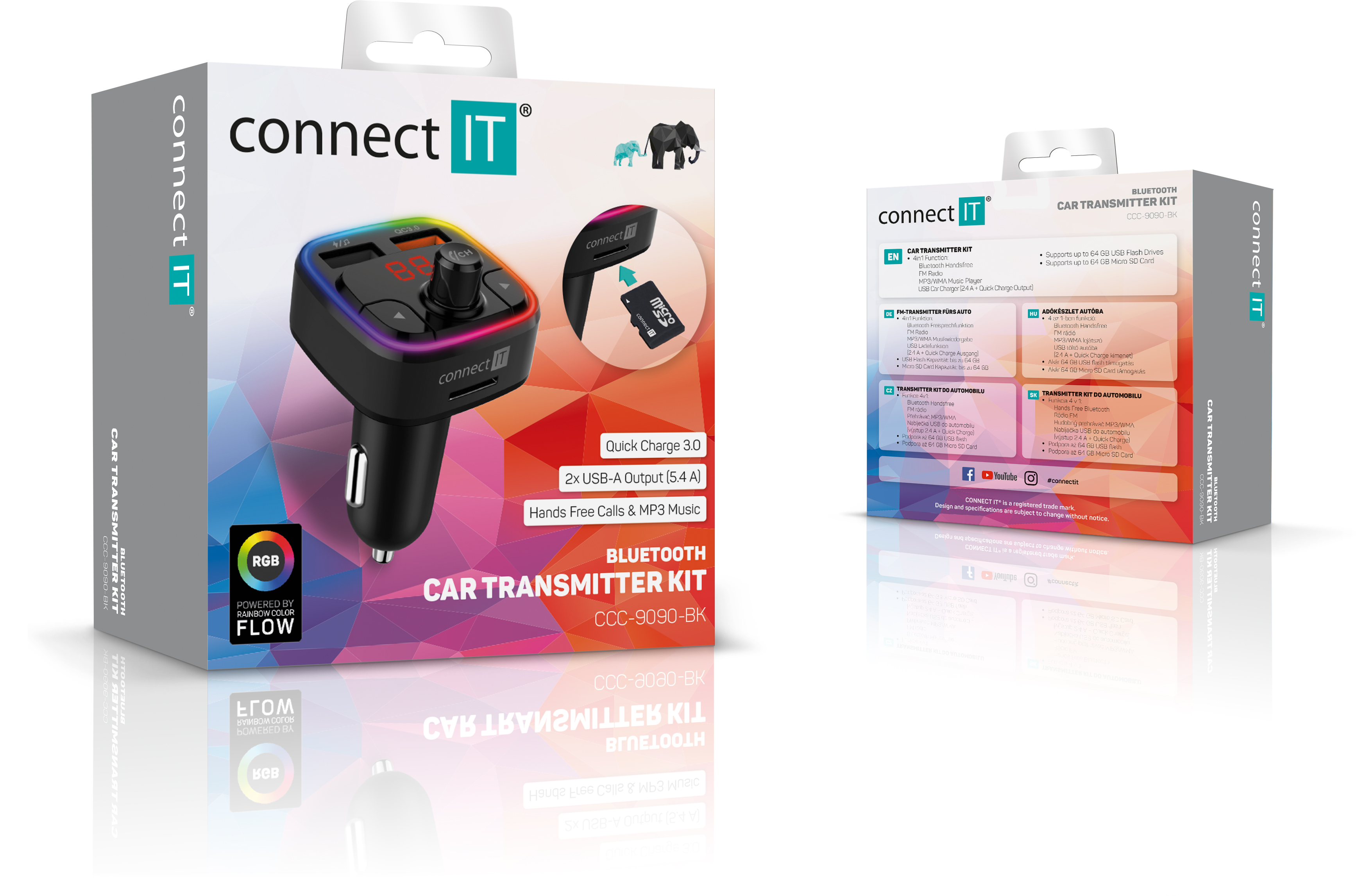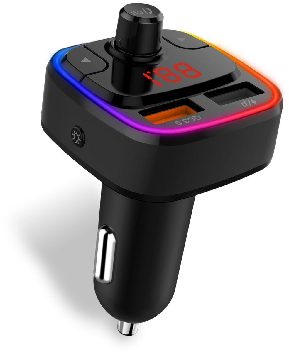Klíčové vlastnosti: Bluetooth transmitter CarRGB s multibarevným volitelným RGB podsvícením kombinuje tři zařízení v jednom - dvouportovou USB nabíječku s funkcí rychlého nabíjení Quick Charge 3.0, bezdrátové Bluetooth handsfree a hudební přehrávač.