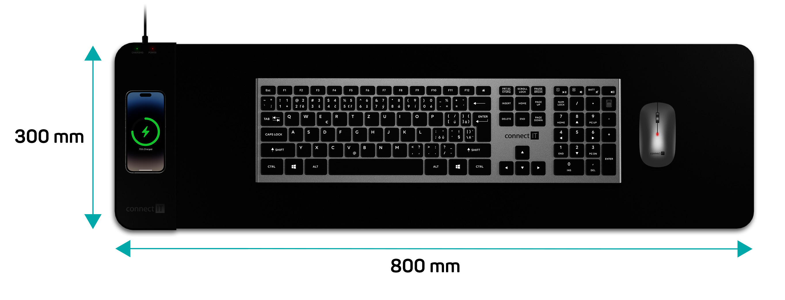 Klíčové vlastnosti: Praktická podložka pod klávesnici a myš s Qi bezdrátovým nabíjením CHARGE určená pro všestranné použití doma i v kanceláři. Podložka disponuje měkkým a příjemným povrchem a díky její velikosti plochy 800 × 300 mm vám nikdy nedojde prostor k pohybu. V levé části podložky je bezdrátová Qi nabíjecí plocha, díky které si můžete nabíjet telefon při hraní či práci.
