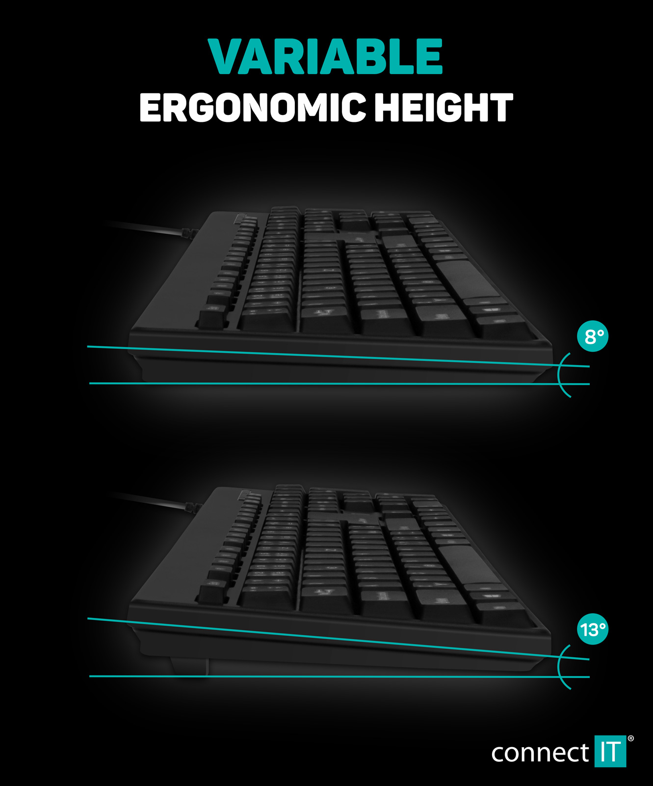 Technické údaje: Dvouřádková široká klávesa ENTER; Dlouhá klávesa SHIFT na šířku dvou standardních kláves na pravé i levé straně klávesnice; Speciálně upravená konstrukce tlačítek i membrány pro tichý a měkký chod; Zvýšená odolnost a životnost kláves; Zvýšená odolnost potisků kláves při psaní s dlouhými nehty; Membránová technologie odolná vůči zanesení nečistotami.