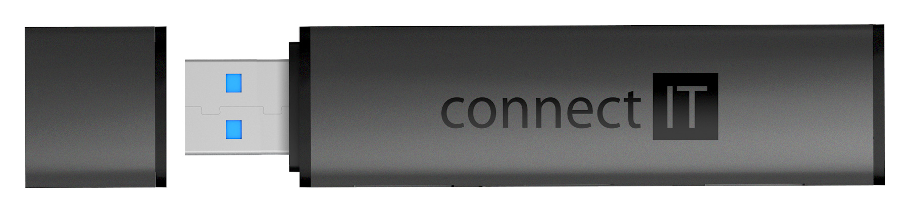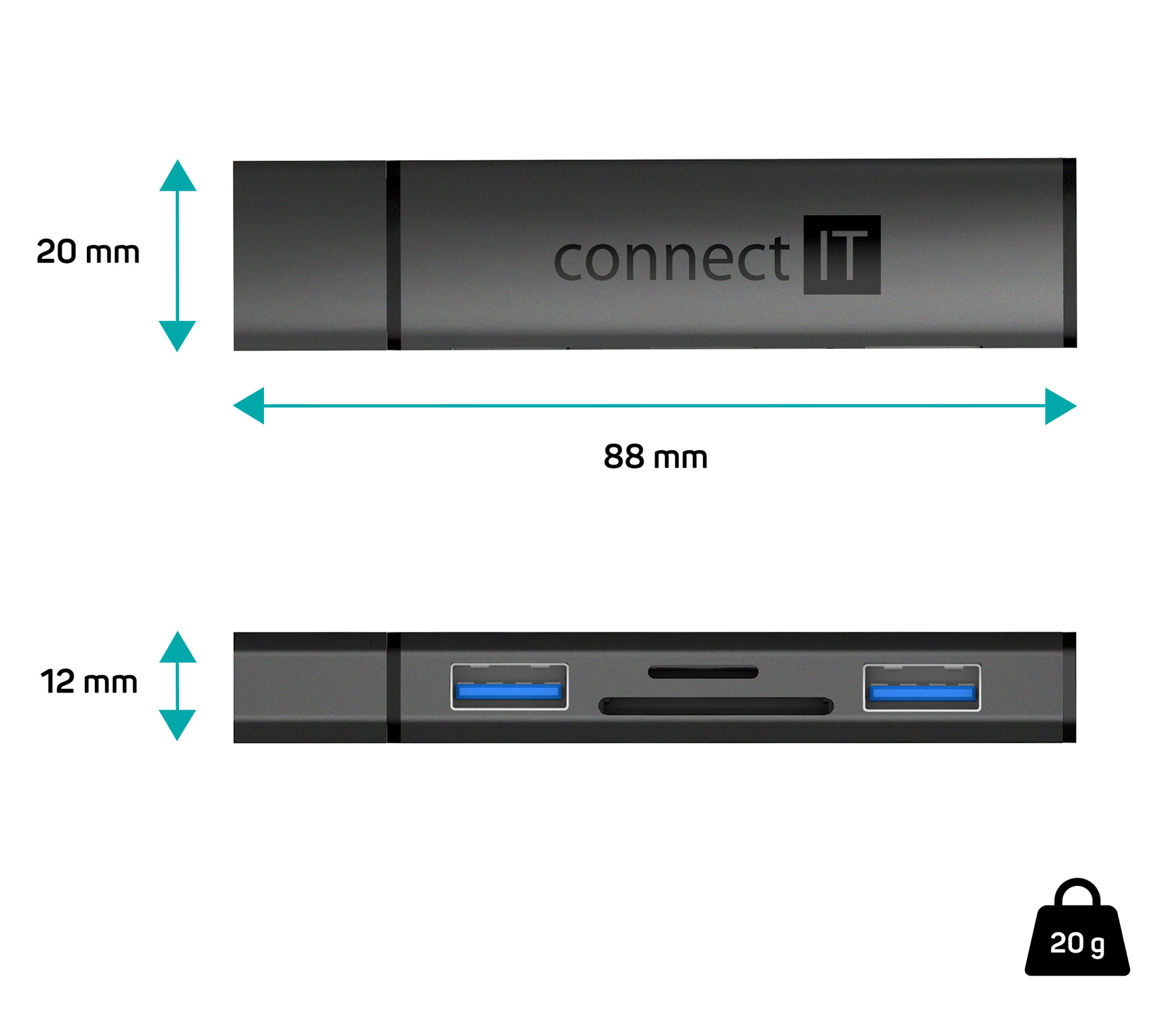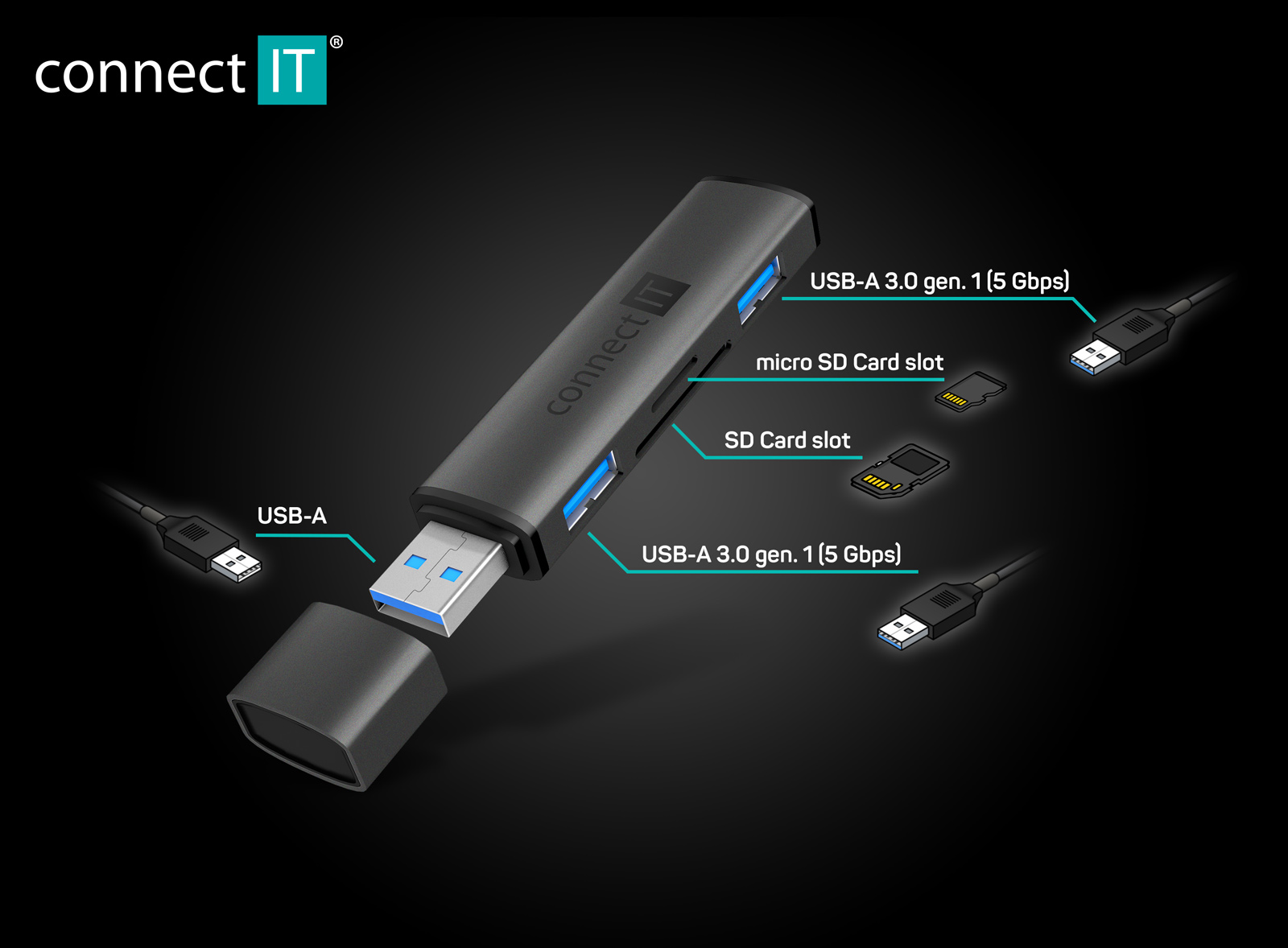 CONNECT IT COMPACT 4v1 USB-A hub + čtečka karet, (2xUSB-A 3.0, 1xSD, 1xMicroSD), externí - Antracitová