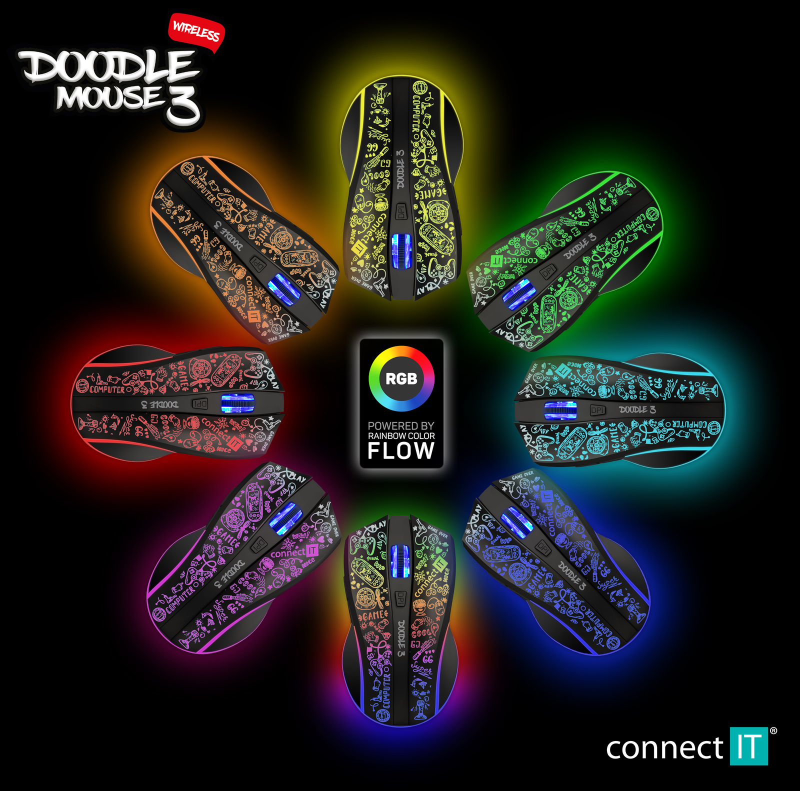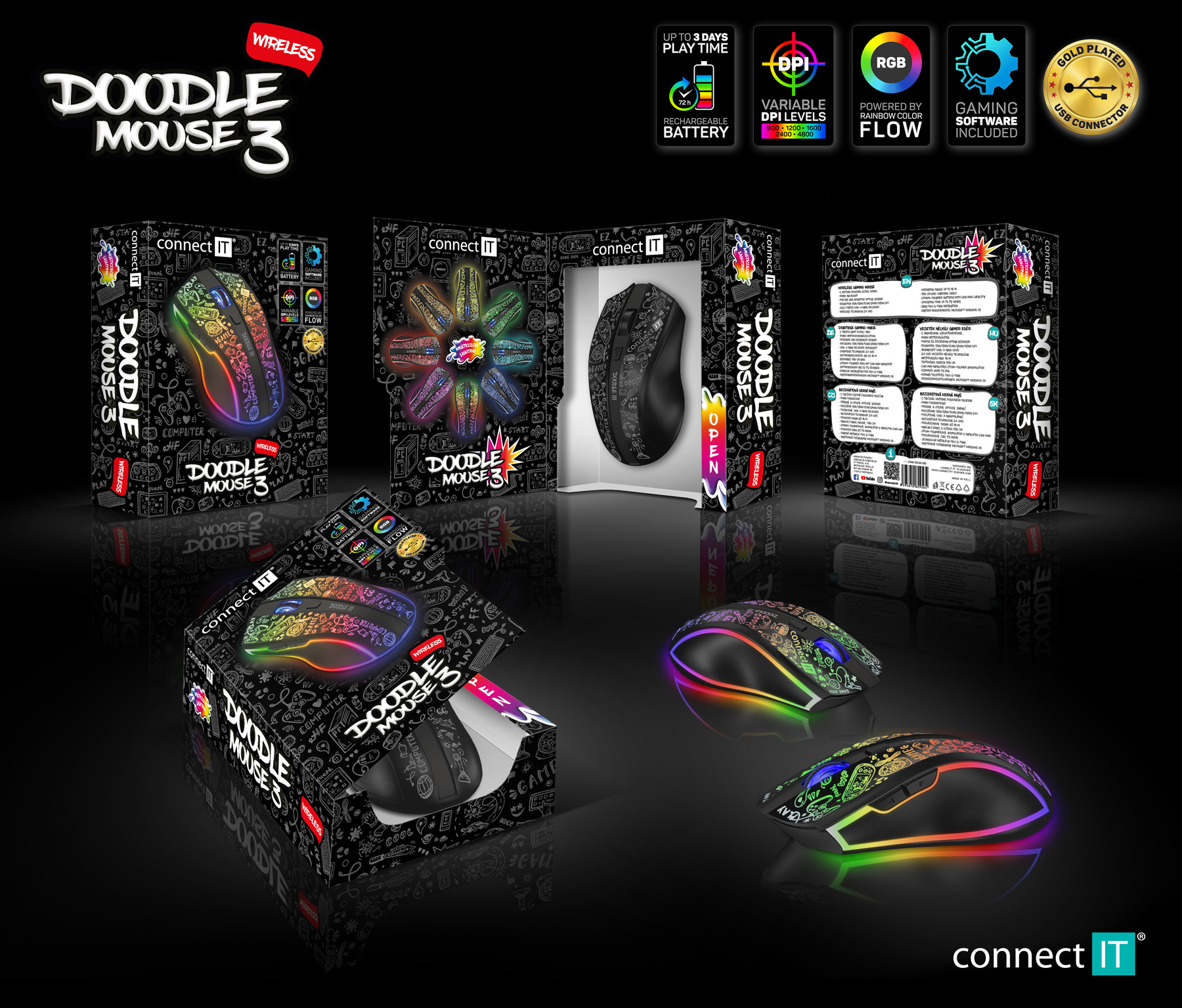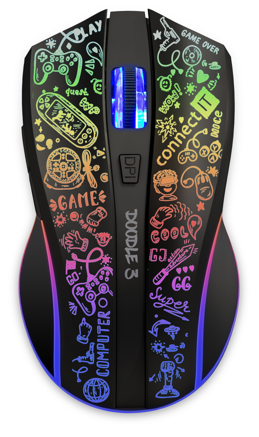 Klíčové vlastnosti: Profesionální bezdrátová gamingová myš DOODLE 3 pro hráče počítačových her s Rainbow podsvícením těla i kolečka v mixu 7 barev. Dodávaný SW s četnými nastaveními podporuje uživatelská makra, 5 uživatelských profilů a 6 programovatelných tlačítek včetně posuvného kolečka. Precizní optický senzor má nastavitelnou citlivost až na 4800 DPI.