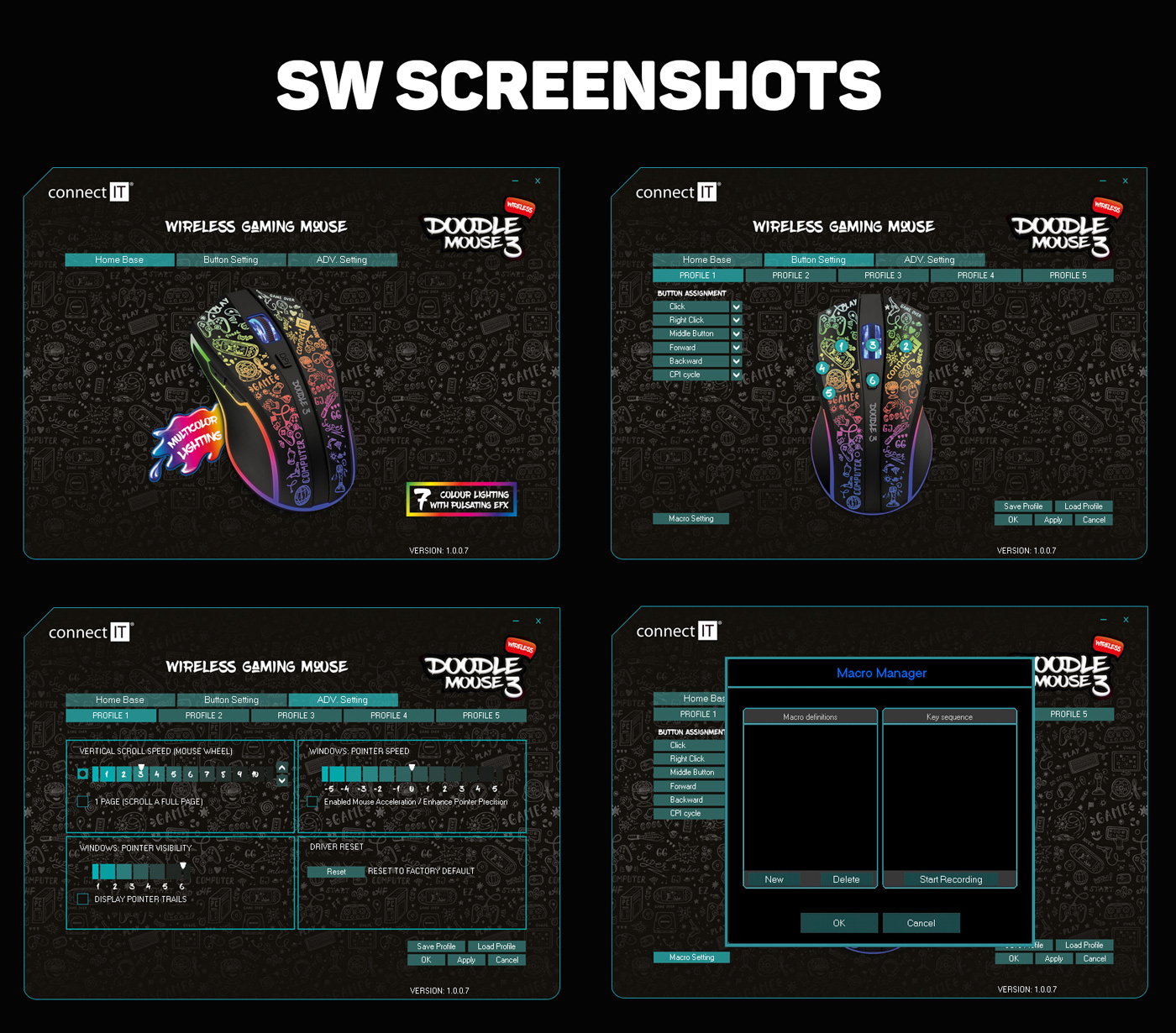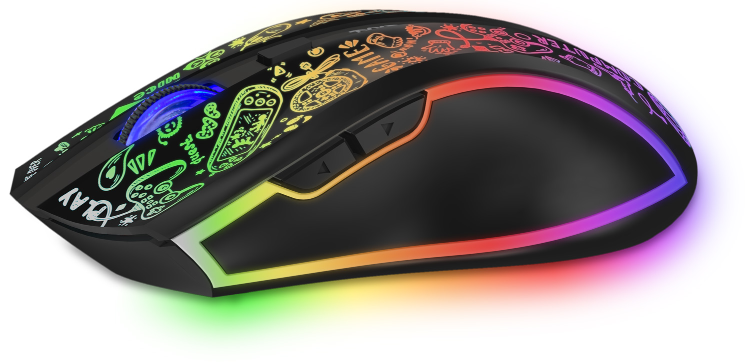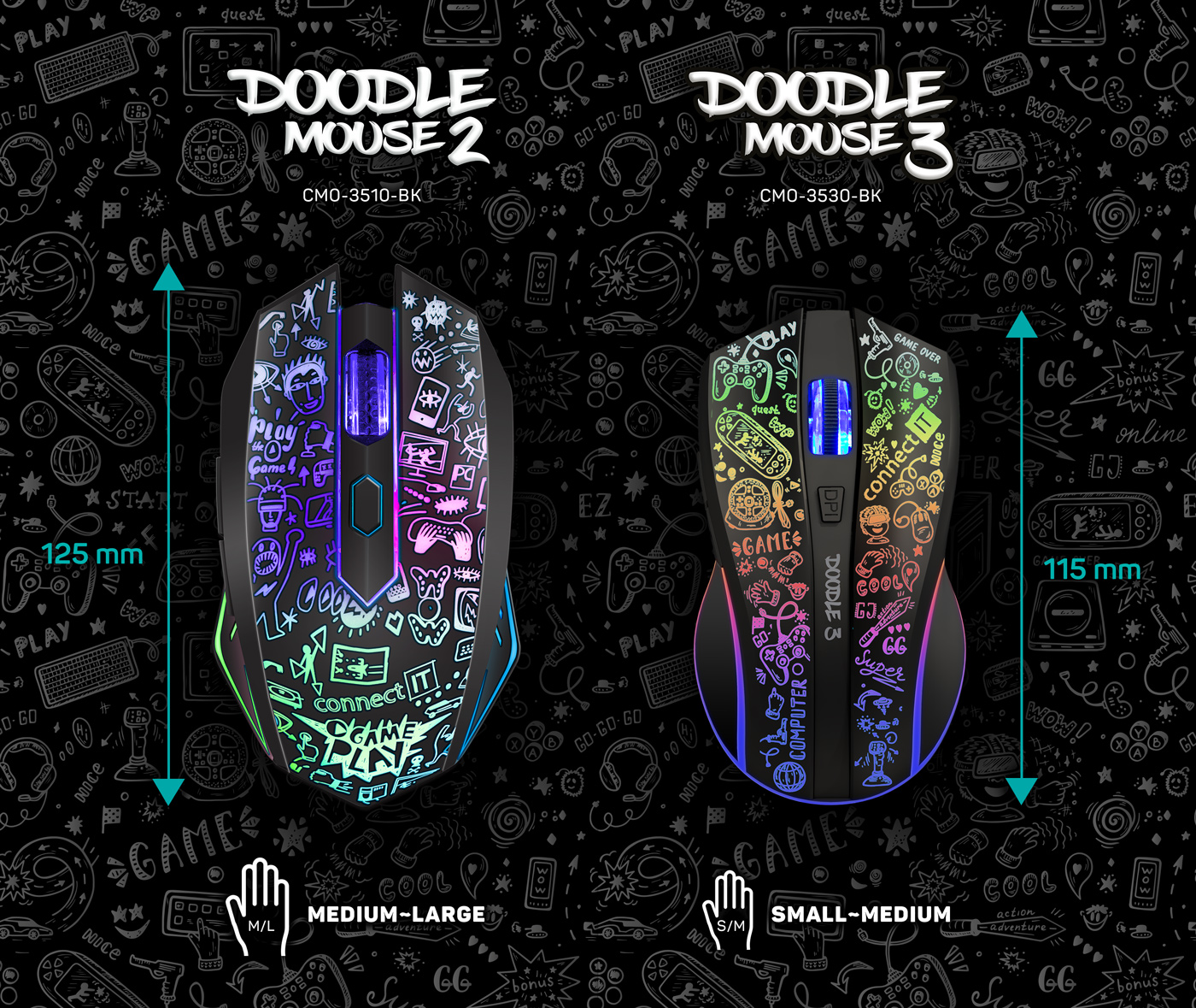 Klíčové vlastnosti: Profesionální bezdrátová gamingová myš DOODLE 3 pro hráče počítačových her s Rainbow podsvícením těla i kolečka v mixu 7 barev. Dodávaný SW s četnými nastaveními podporuje uživatelská makra, 5 uživatelských profilů a 6 programovatelných tlačítek včetně posuvného kolečka. Precizní optický senzor má nastavitelnou citlivost až na 4800 DPI.