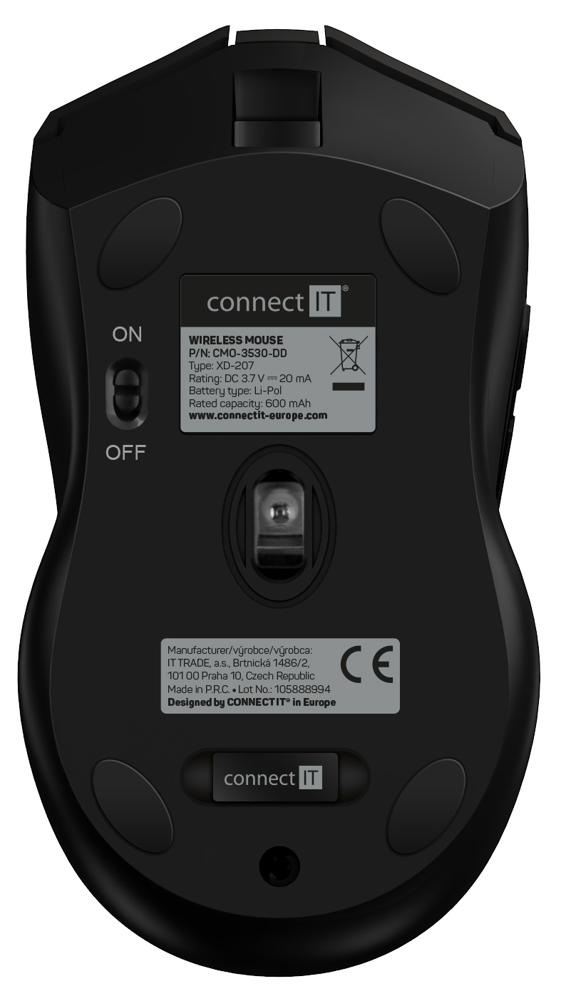 Výhody produktu: Myš využívá technologie jako povrchový RubberGrip pro eliminaci klouzavosti dlaně, UltraSlides Black pojezdy pro maximální možnou rychlost na podložce. Nechybí ani technologie AutoPowerSave šetřící kapacitu baterie. Software je zdarma ke stažení na stránkách www.connectit-europe.com. Vysokou odolnost garantují špičkové mechanické spínače Huano s životností 3 miliony kliknutí. Samozřejmostí je pozlacený USB Nano přijímač a dodávaný nabíjecí kabel.