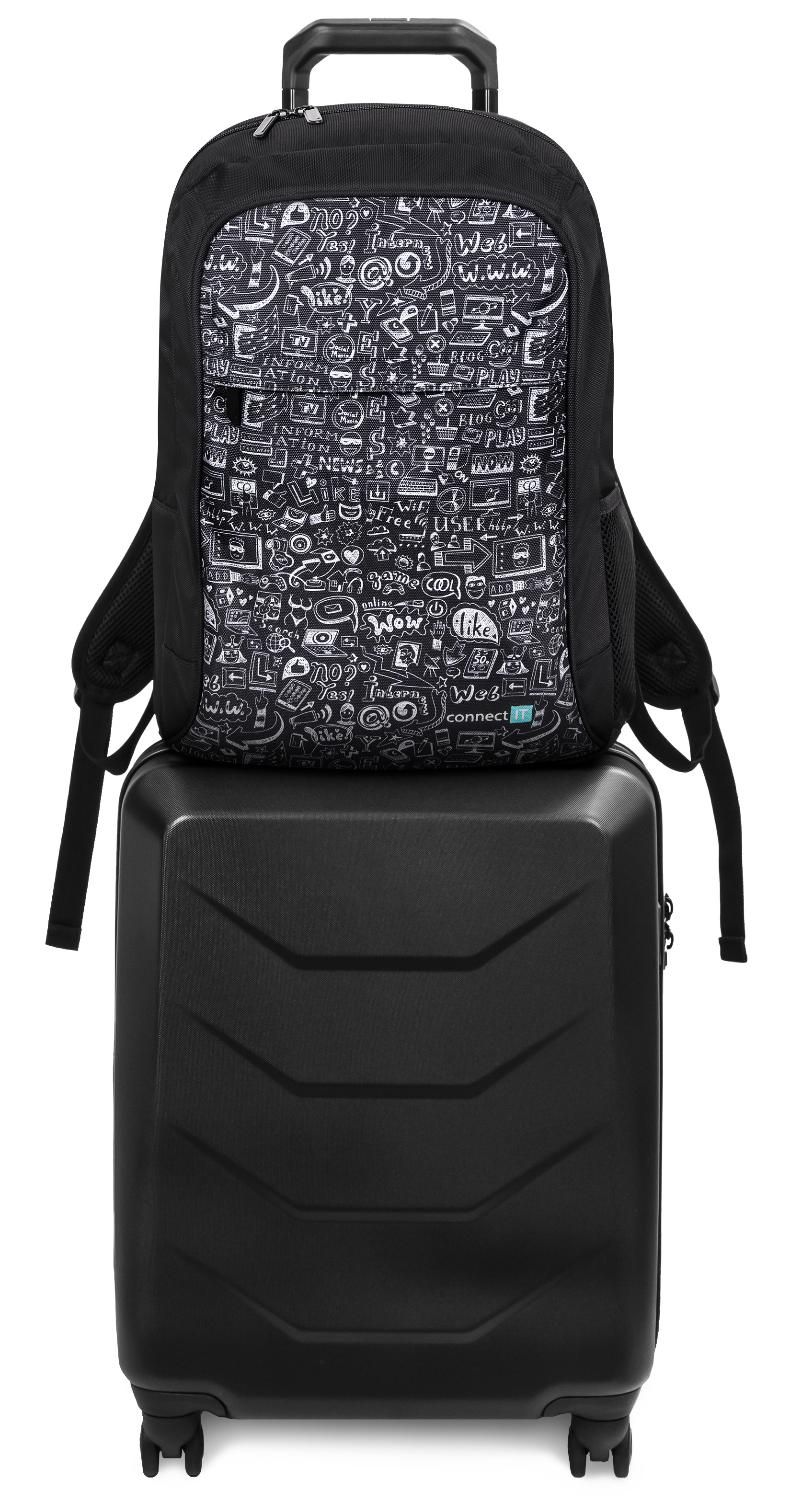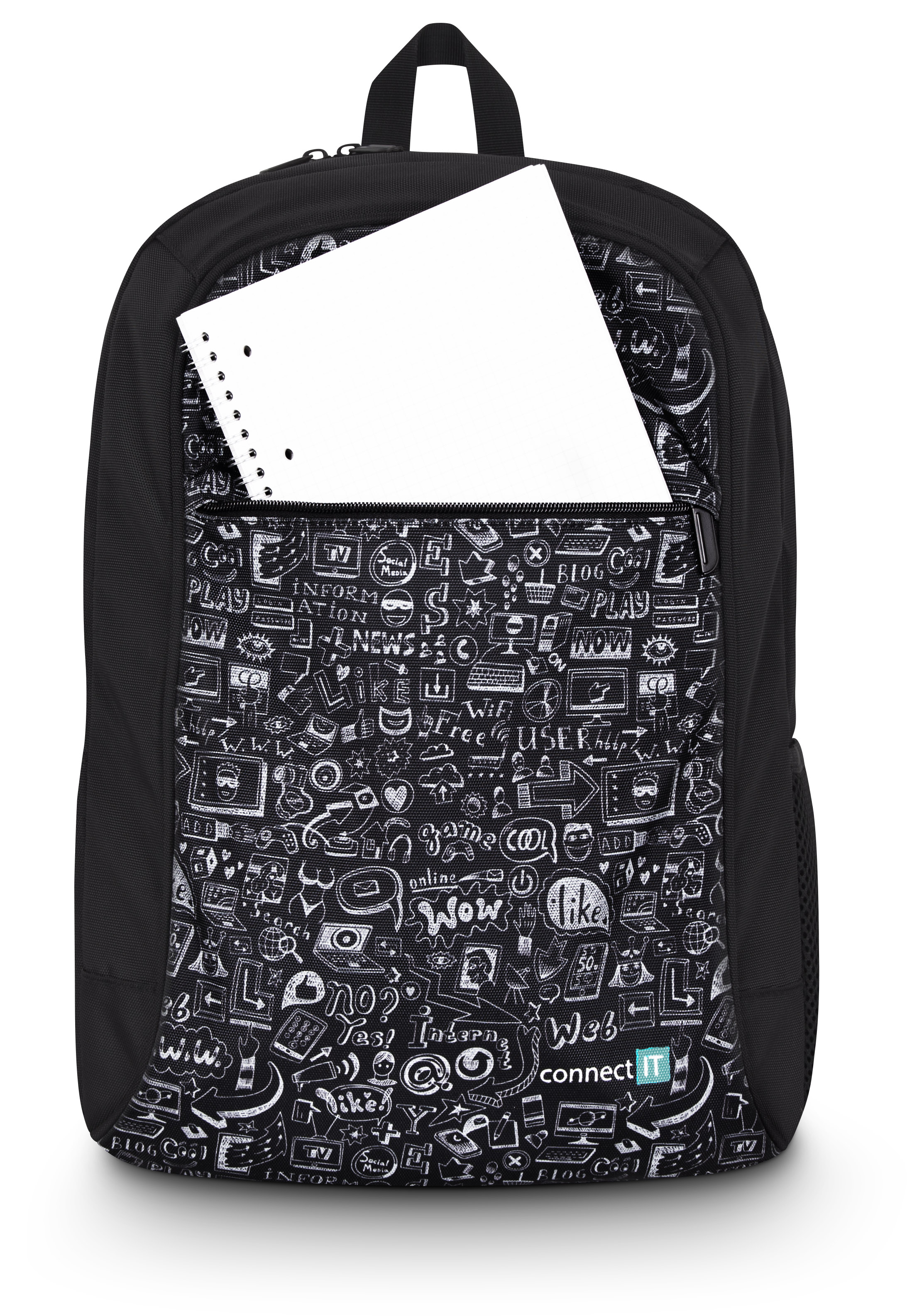 Technické údaje: Stylový batoh na 15.6“ notebook s Doodle potiskem; Obsahuje celkem 5 kapes:; hlavní kapsu; polstrovanou kapsu na notebook; menší kapsu; kapsu se zipem na přední straně batohu.