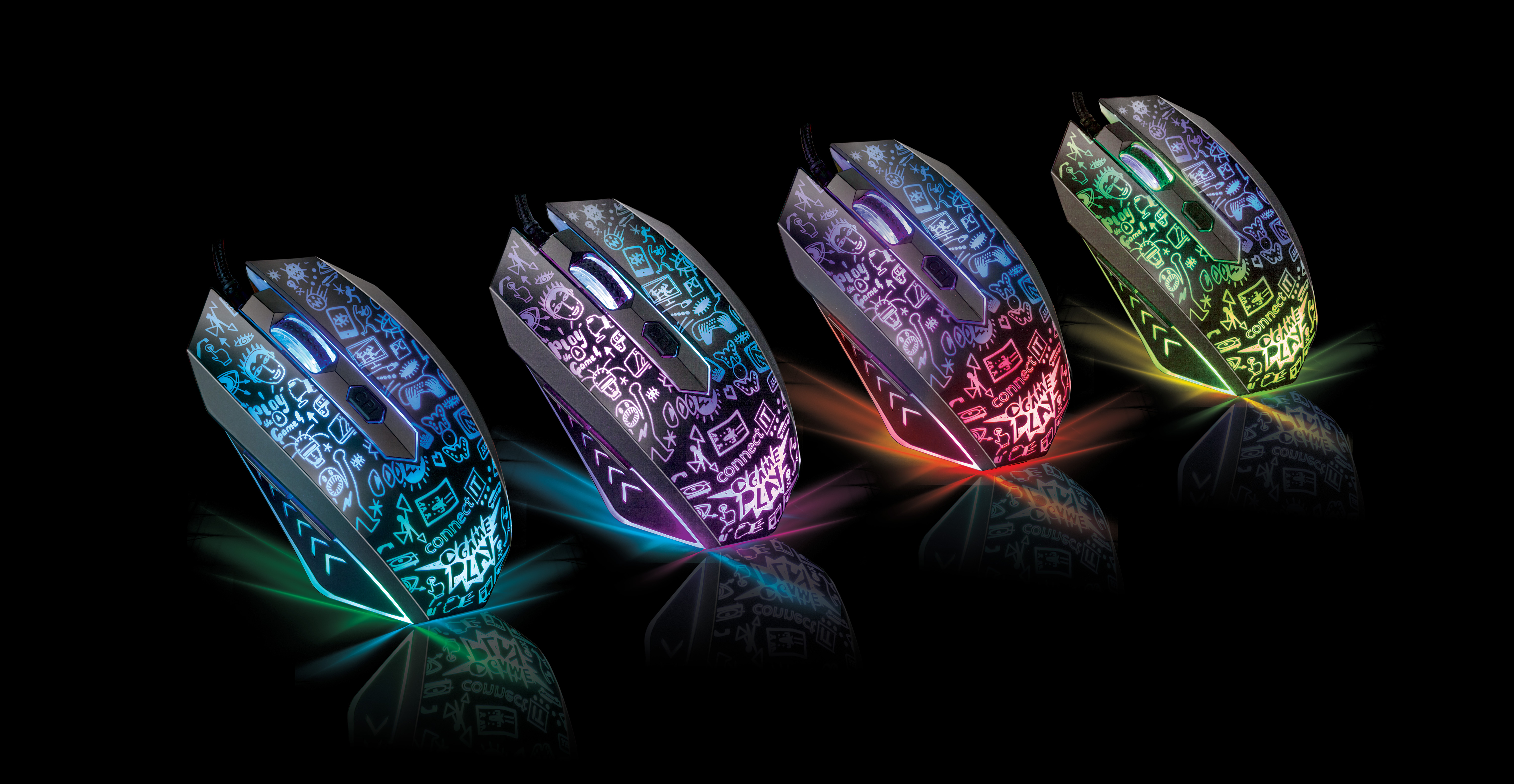 Výhody produktu: Tato pohodlná myš s výjímečným designem padne pohodlně do každé ruky a díky speciálnímu povrchu soft touch se Vám ruka snadno nespotí a vy si tak můžete užít hraní dle libosti. Vaši dlaň jistě potěší propracovaný ergonomický tvar, který ještě více umocňuje zážitek ze samotného používání. Naprostou samozřejmostí je i rychlé a přesné snímání pohybu a celkově 6 tlačítek včetně posuvného kolečka či nastavení až na 2000 DPI. Myš je po celém těle poseta drobnými obrázky, přes které prosvítá efektní vícebarevné LED podsvícení, které se plynule mění. To myši dodává naprosto unikátní vzhled.