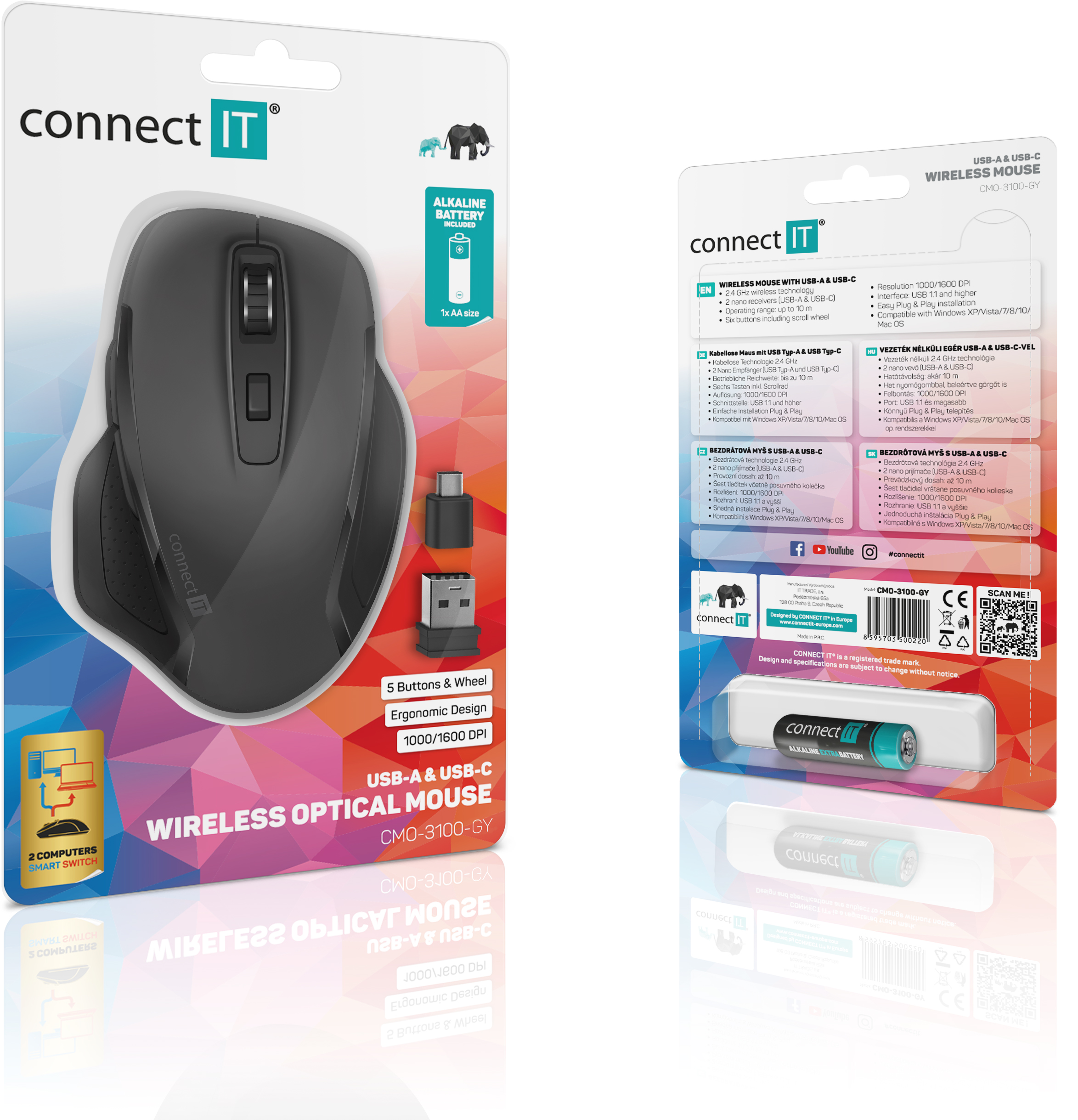 Výhody produktu: Bezdrátová optická myš s unikátní funkcí SmartSwitch, díky které můžete používat myš střídavě na dvou počítačích nebo noteboocích a libovolně se mezi nimi přepínat. Tato funkce se hodí do domácího i profi kancelářského prostředí, kde se pracuje s jednou myší střídavě na dvou počítačích nebo noteboocích. Jedinečný design myši dovoluje uschovat oba USB Nano příjímače pod krytkou bateriového prostoru ve spodní části myši a zabránit tak jejich ztrátě. Součástí balení je originální alkalická tužková baterie CONNECT IT.