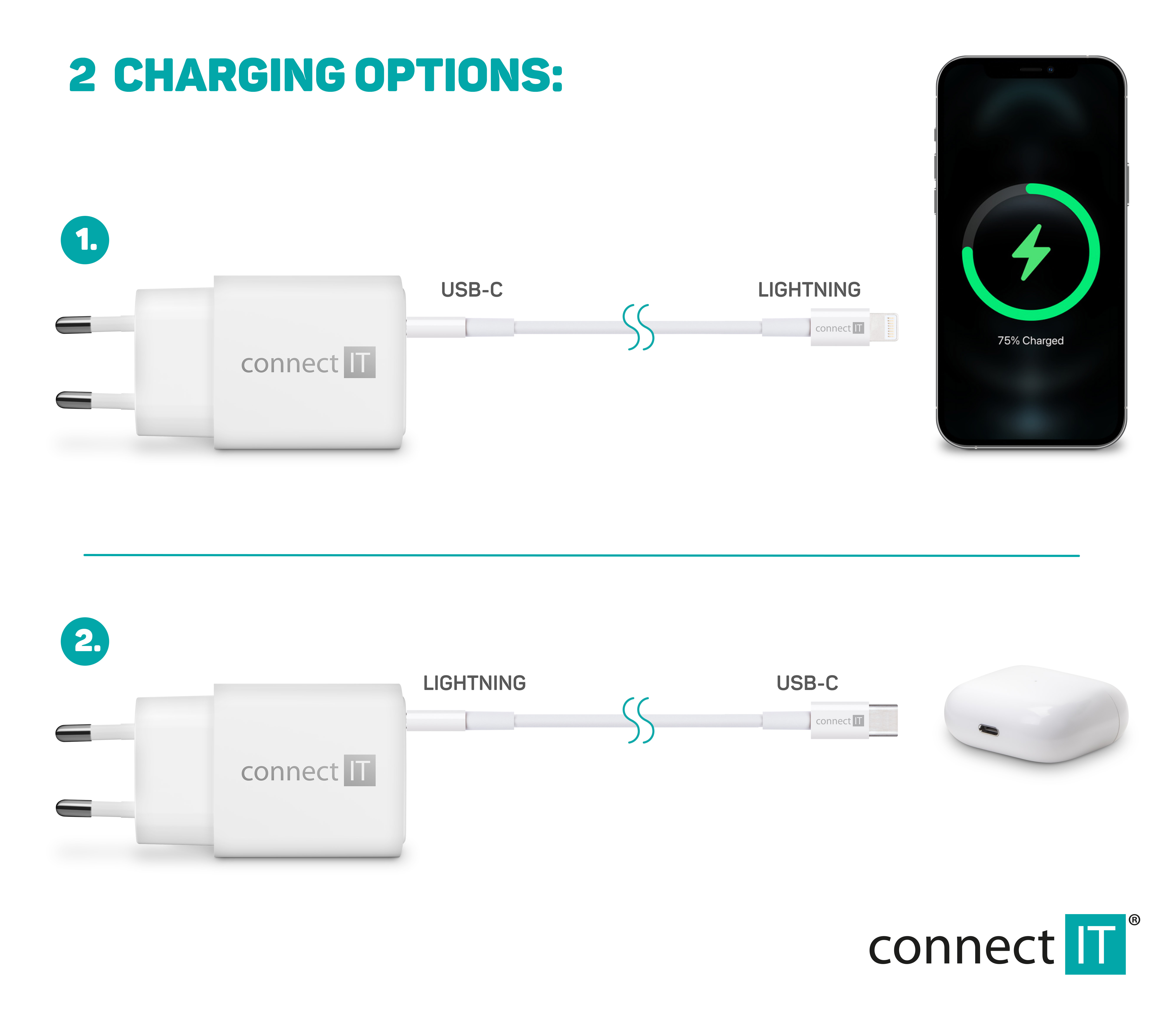 Klíčové vlastnosti: Unikátní cestovní nabíječka CONNECT IT "Duplex" disponuje dvěma porty - Lightning a USB-C. Díky této ojedinělé technologii lze nabíjet zařízení jak s Lightning vstupem, tak USB-C vstupem jedním univerzálním kabelem. Nabíječka je určená pro napájení i nabíjení mobilních telefonů, tabletů, power bank, akčních kamer, elektronických čteček knih, MP3 a MP4 přehrávačů, herních konzolí a mnoha dalších přenosných zařízení doma, v kanceláři i na cestách. Technologie Power Delivery (PD) umožňuje rychlonabíjení o výkonu 20 W. Součástí balení je i velice kvalitní kabel Lightning -> USB-C, který dokáže přenést až 27 W.