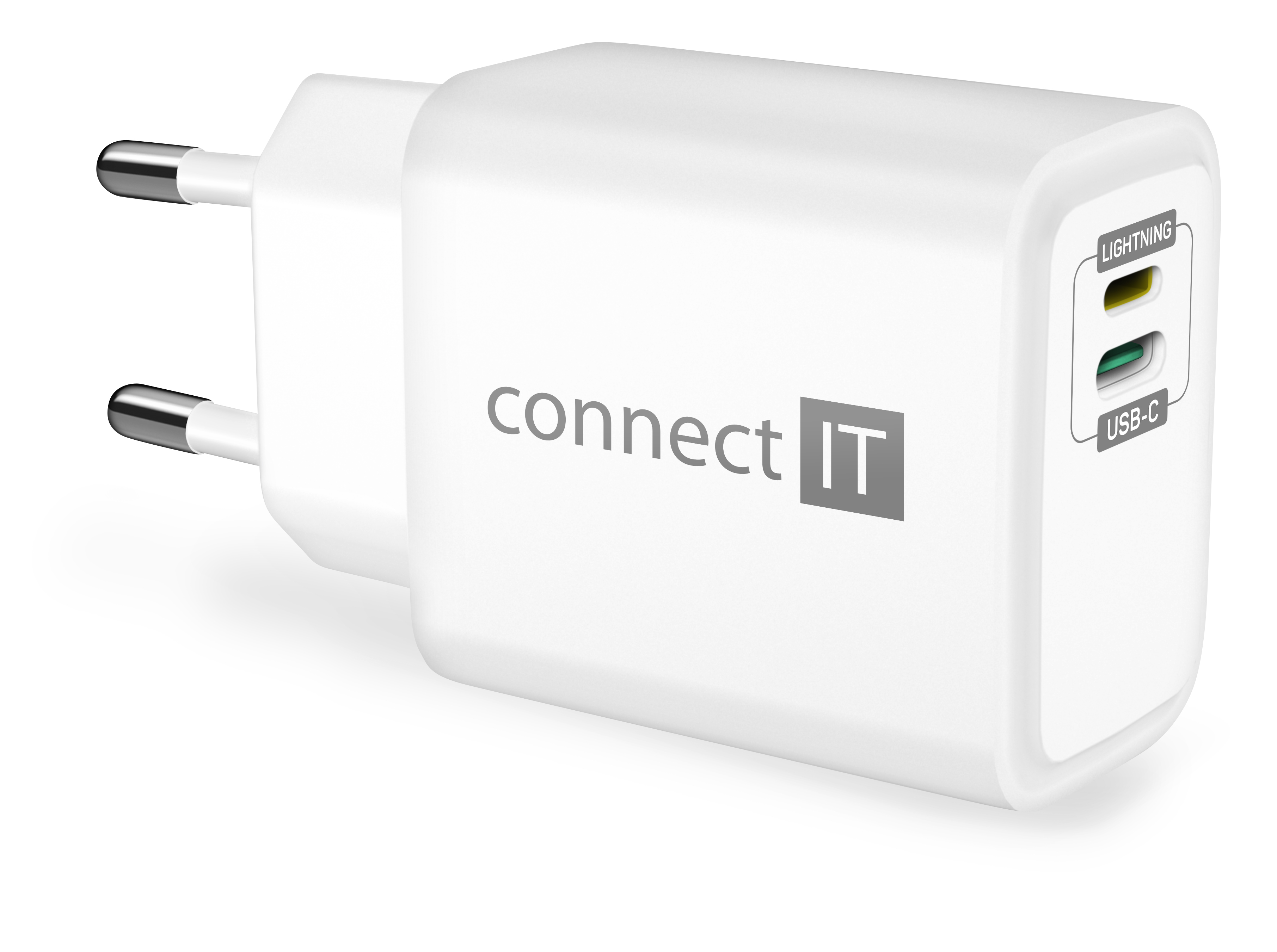 CONNECT IT DUPLEX Nabíjecí adaptér 1xLightning + 1×USB-C, 20W, kabel 27W - Bílá