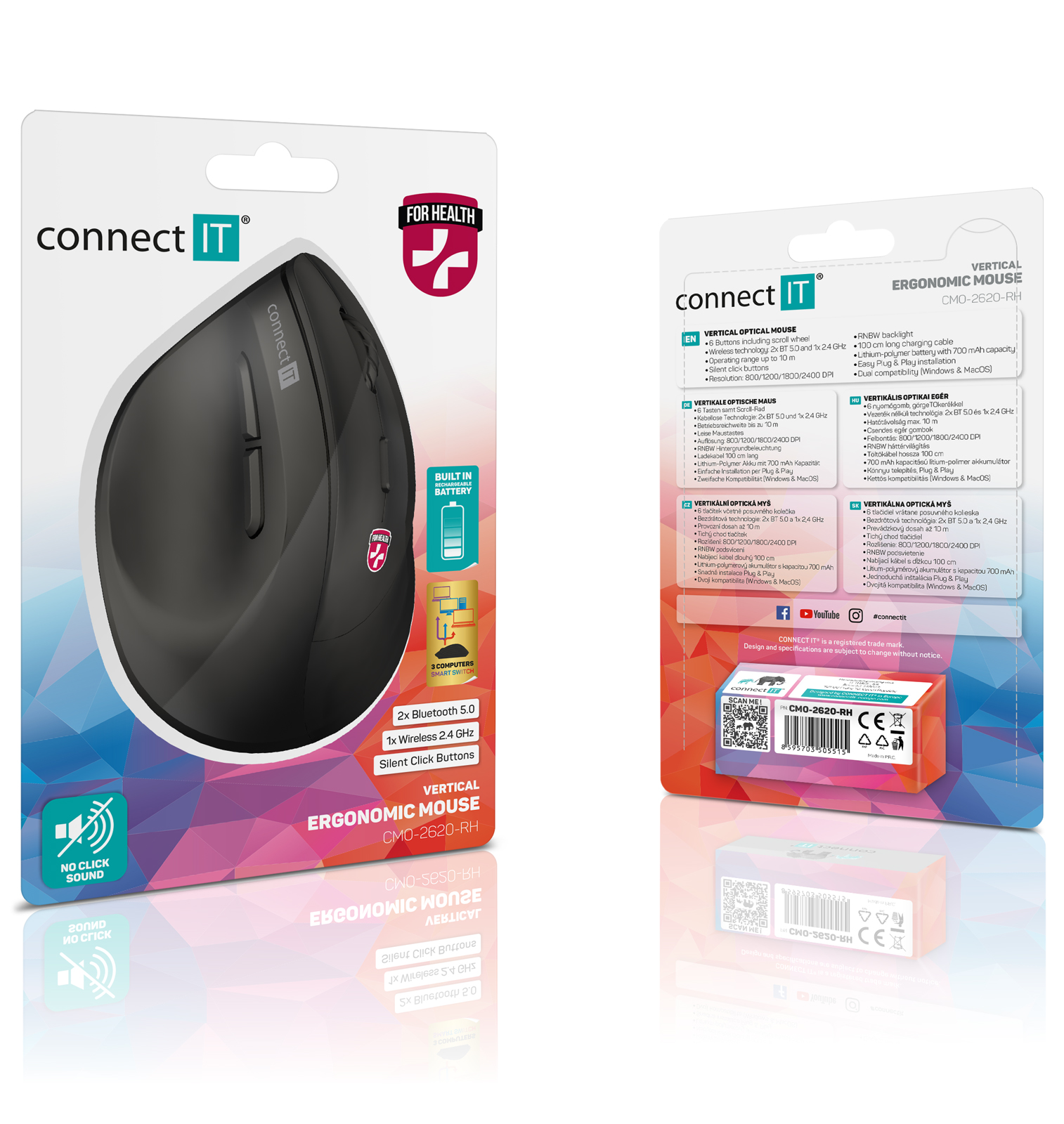 Klíčové vlastnosti: Vertikální ergonomická optická bezdrátová myš FOR HEALTH Cloudy BLACK určená speciálně jako prevence proti syndromu karpálního tunelu. Nabízí možnost připojení až na tři zařízení díky technologii TriMode (2x BT 5.0 + 2.4 GHz wireless). Disponuje RGB podsvícením, 6 tlačítky včetně precizního rolovacího kolečka a rozlišením až 2400 DPI.