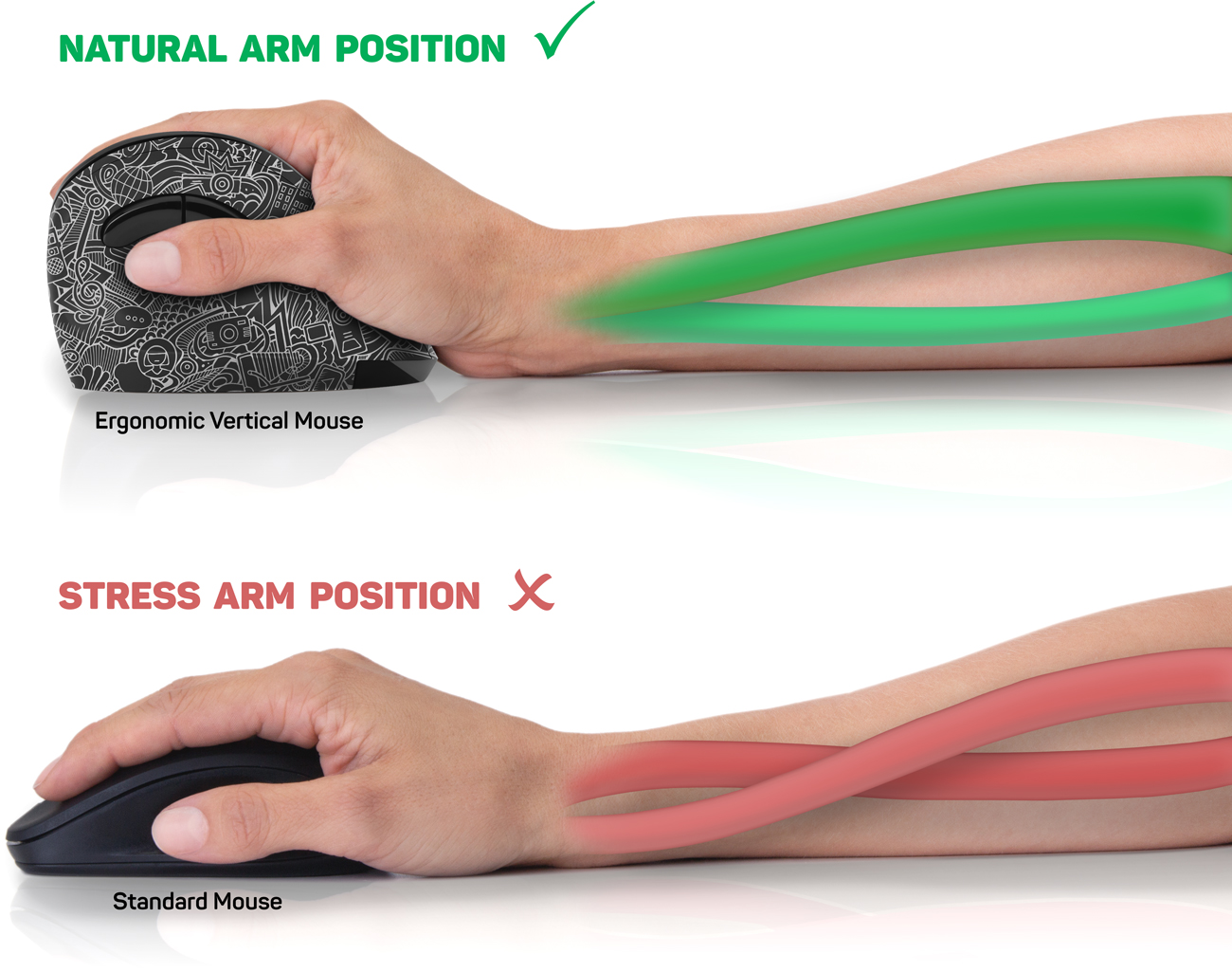 Výhody produktu: Při práci s běžnou počítačovou myší jsou kosti předloktí v nepřirozeně zkřížené poloze a již po krátké době dochází k bolestem a únavě celého předloktí. Při dlouhodobém používání takové myši může dojít k chornickým problémům s nutností vyhledat lékařskou pomoc. Syndrom karpálního tunelu aneb syndrom počítačové myši - novodobý zdravotní problém S používáním běžných kancelářských myší je spojena i novodobá počítačová nemoc - tzv. syndrom karpálního tunelu (tzv. útlakový syndrom nebo také RSI). Jde o útlak středního nervu v karpálním tunelu, který se nachází v zápěstí ruky. Střední nerv procházející právě tímto tunelem přenáší impulzy z mozku do palce, ukazováčku, prostředníčku a části prsteníčku. U zdravých lidí, kteří nepřetěžují oblast zápěstí, poskytuje karpální tunel dostatek prostoru pro průchod středního nervu a prsty jsou tak dostatečně zásobeny impulzy z mozku, tudíž zůstává zachována jejich plná funkčnost a citlivost. Mezi základní příznaky tohoto syndromu patří mravenčení a bolesti v prvních třech prstech (palec, ukazovák a prostředník) připomínajícím pocit přeležení ruky. Objevuje se také oslabená citlivost ruky projevující se sníženou schopností pevného stisku a nešikovnost ruky obecně (v konečné fázi vedoucí až k vypadávání předmětů z ruky). Symptomy se často projevují i v klidovém stavu a bolest může procházet až do předloktí a ramene. V počátečním stádiu je řešení jednoduché - okamžitě přestat používat běžnou počítačovou myš a ruku pravidelně procvičovat. V pokročilém stádiu je již nutná endoskopická operace v zápěstí, kdy dochází k uvolnění karpálního tunelu, resp. zvýšení jeho průchodnosti. Při plně rozvinutém syndromu je nutné přetnutí zápěstních vazů, čímž se tlak na nerv odstraní. Podle Státního zdravotnického ústavu (SZÚ) se v Česku jedná o nejčastější nemoc z povolání, v roce 2017 bylo evidováno již 500 pacientů a každým rokem nemocných přibývá. Všem těmto problémům lze velmi jednoduše předcházet používáním ergonomické vertikální myši, u níž jsou ruka i předloktí uživatele v přirozené poloze a nedochází k nepřirozenému křížení šlach a kostí ani k útlaku středního nervu v zápěstí. Určena pro domácí i kancelářské profesionální použití Bezdrátová 2,4 GHz technologie Bezdrátový USB Nano přijímač s dosahem až 20 m Rozhraní USB-A 2.0 zpětně kompatibilní s USB 1.1 Speciální ergonomie snižující únavu i při dlouhodobém použití Optický senzor (volitelné rozlišení 800/1200/1600 DPI) Vysoká přesnost ideální také pro práci v grafických editorech Snadná instalace Plug & Play bez nutnosti instalace a stahování ovladačů (USB přijímač stačí pouze připojit k USB portu počítače nebo notebooku) Mechanické spínače s garantovanou životností 3 milionů kliknutí 6 tlačítek včetně precizního posuvného kolečka 2 samostatná navigační tlačítka pro pohyb vpřed a vzad Smart Power-Saving technologie spořící baterii, pokud myš není v pohybu ON/OFF přepínač ve spodní části myši pro úplné vypnutí Protiskluzový pogumovaný Soft-Touch povrch úchopových částí myši pro pevný úchop Úložný prostor ve spodní části myši pro mini USB přijímač ideální při transportu i cestování Napájení: 1 × AA alkalická originál tužková baterie CONNECT IT (součást balení) Kompatibiliní s operačními systémy Windows XP/Vista/7/8/10/ a Mac OS X (funkce produktu, které nejsou podporovány Mac OS X, nemusí fungovat správně) Rozměry (d × š × v): 108 x 70 x 66 mm Hmotnost bez baterie a bez USB přijímače: 89 g Hmotnost bez baterie a s USB přijímačem: 91 g Barva: černá Doodle