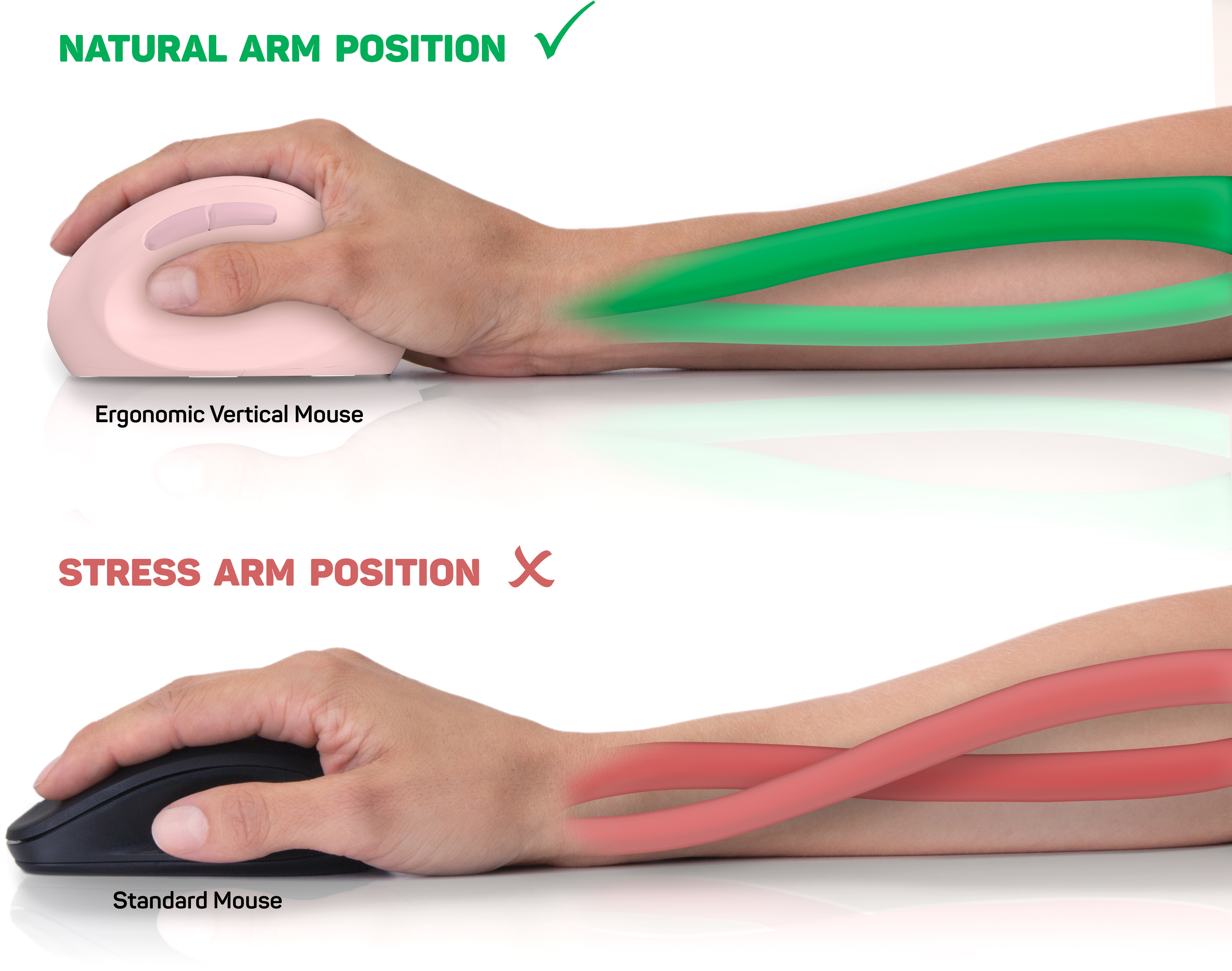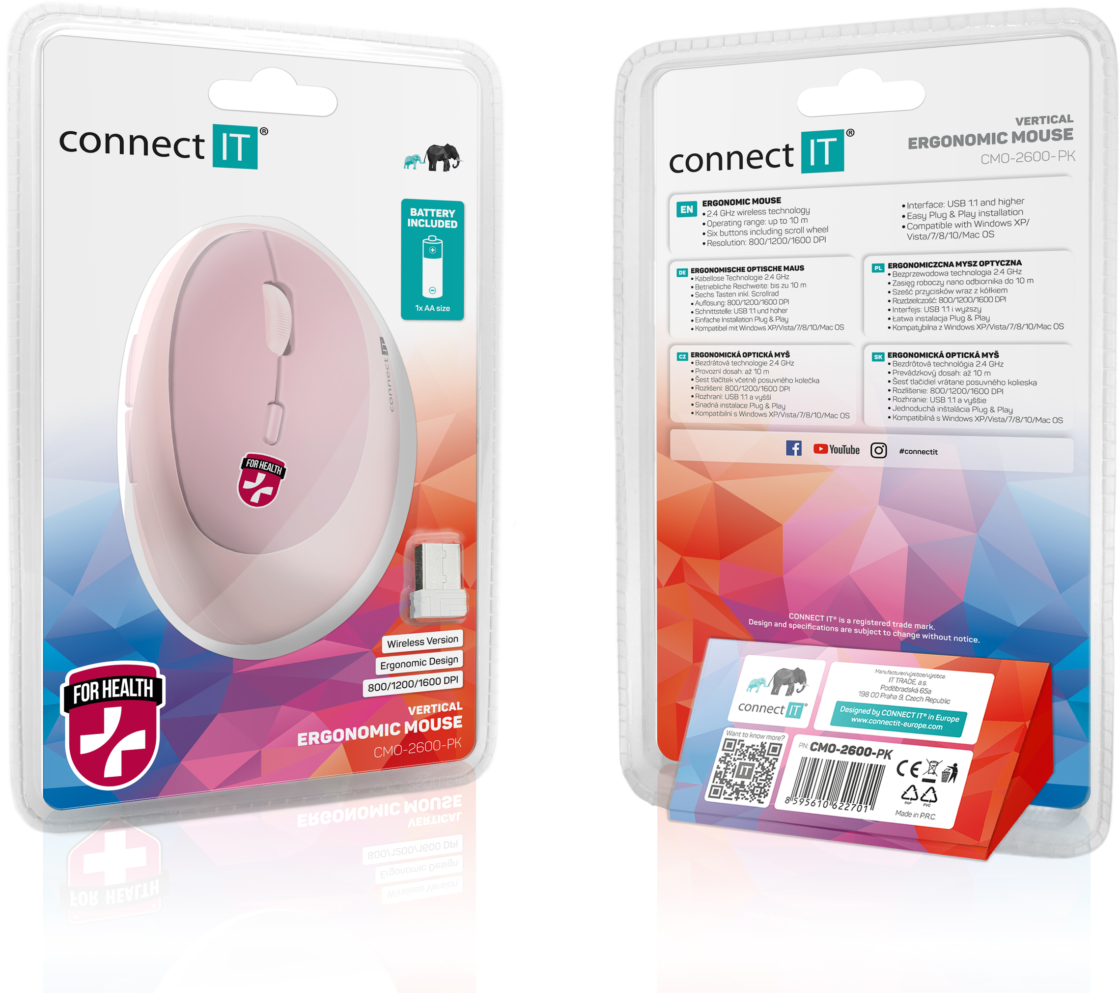 Výhody produktu: Při práci s běžnou počítačovou myší jsou kosti předloktí v nepřirozeně zkřížené poloze a již po krátké době dochází k bolestem a únavě celého předloktí. Při dlouhodobém používání takové myši může dojít k chornickým problémům s nutností vyhledat lékařskou pomoc. Syndrom karpálního tunelu aneb syndrom počítačové myši - novodobý zdravotní problém S používáním běžných kancelářských myší je spojena i novodobá počítačová nemoc - tzv. syndrom karpálního tunelu (tzv. útlakový syndrom nebo také RSI). Jde o útlak středního nervu v karpálním tunelu, který se nachází v zápěstí ruky. Střední nerv procházející právě tímto tunelem přenáší impulzy z mozku do palce, ukazováčku, prostředníčku a části prsteníčku. U zdravých lidí, kteří nepřetěžují oblast zápěstí, poskytuje karpální tunel dostatek prostoru pro průchod středního nervu a prsty jsou tak dostatečně zásobeny impulzy z mozku, tudíž zůstává zachována jejich plná funkčnost a citlivost. Mezi základní příznaky tohoto syndromu patří mravenčení a bolesti v prvních třech prstech (palec, ukazovák a prostředník) připomínajícím pocit přeležení ruky. Objevuje se také oslabená citlivost ruky projevující se sníženou schopností pevného stisku a nešikovnost ruky obecně (v konečné fázi vedoucí až k vypadávání předmětů z ruky). Symptomy se často projevují i v klidovém stavu a bolest může procházet až do předloktí a ramene. V počátečním stádiu je řešení jednoduché - okamžitě přestat používat běžnou počítačovou myš a ruku pravidelně procvičovat. V pokročilém stádiu je již nutná endoskopická operace v zápěstí, kdy dochází k uvolnění karpálního tunelu, resp. zvýšení jeho průchodnosti. Při plně rozvinutém syndromu je nutné přetnutí zápěstních vazů, čímž se tlak na nerv odstraní. Podle Státního zdravotnického ústavu (SZÚ) se v Česku jedná o nejčastější nemoc z povolání, v roce 2017 bylo evidováno již 500 pacientů a každým rokem nemocných přibývá. Všem těmto problémům lze velmi jednoduše předcházet používáním ergonomické vertikální myši, u níž jsou ruka i předloktí uživatele v přirozené poloze a nedochází k nepřirozenému křížení šlach a kostí ani k útlaku středního nervu v zápěstí. Určena pro domácí i kancelářské profesionální použití Speciální ergonomie, design a menší velikost přizpůsobené zejména pro ženy Bezdrátová 2,4 GHz technologie Bezdrátový USB Nano přijímač s dosahem až 10 m Rozhraní USB-A 2.0 zpětně kompatibilní s USB 1.1 Speciální ergonomie snižující únavu i při dlouhodobém použití Optický senzor (volitelné rozlišení 800/1200/1600 DPI) Vysoká přesnost ideální také pro práci v grafických editorech Snadná instalace Plug & Play bez nutnosti instalace a stahování ovladačů (USB přijímač stačí pouze připojit k USB portu počítače nebo notebooku) Mechanické spínače s garantovanou životností 3 milionů kliknutí 6 tlačítek včetně precizního posuvného kolečka 2 samostatná navigační tlačítka pro pohyb vpřed a vzad Smart Power-Saving technologie spořící baterii, pokud myš není v pohybu ON/OFF přepínač ve spodní části myši pro úplné vypnutí Protiskluzový pogumovaný Soft-Touch povrch myši pro pevný úchop Úložný prostor ve spodní části myši pro mini USB přijímač ideální při transportu i cestování Napájení: 1 × AA alkalická originál tužková baterie CONNECT IT (součást balení) Kompatibiliní s operačními systémy Windows XP/Vista/7/8/10/ a Mac OS X (funkce produktu, které nejsou podporovány Mac OS X, nemusí fungovat správně) Rozměry (d × š × v): 105 x 67 x 58 mm Hmotnost bez baterie a bez USB přijímače: 79 g Hmotnost bez baterie a s USB přijímačem: 81 g Barva: růžová