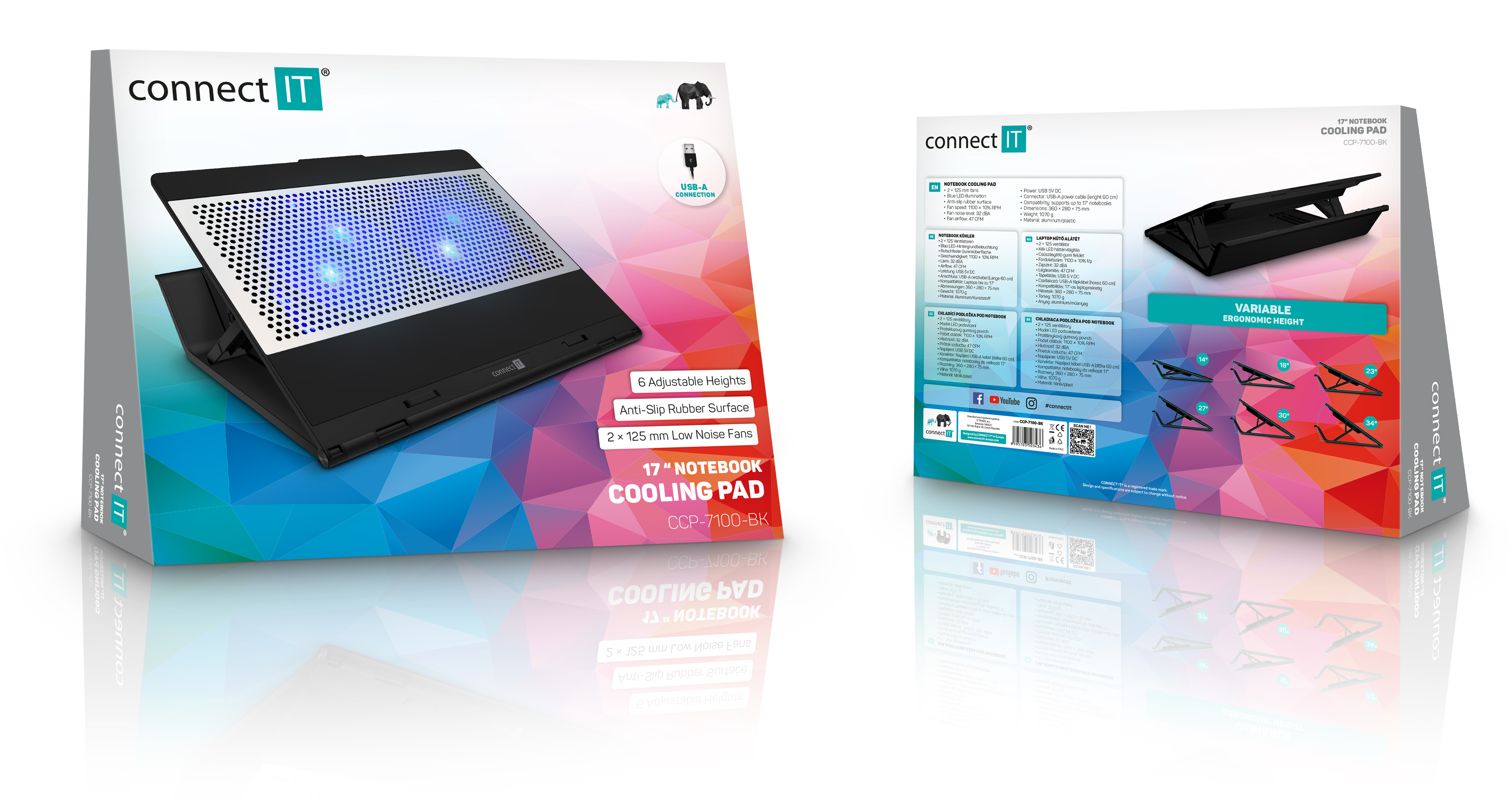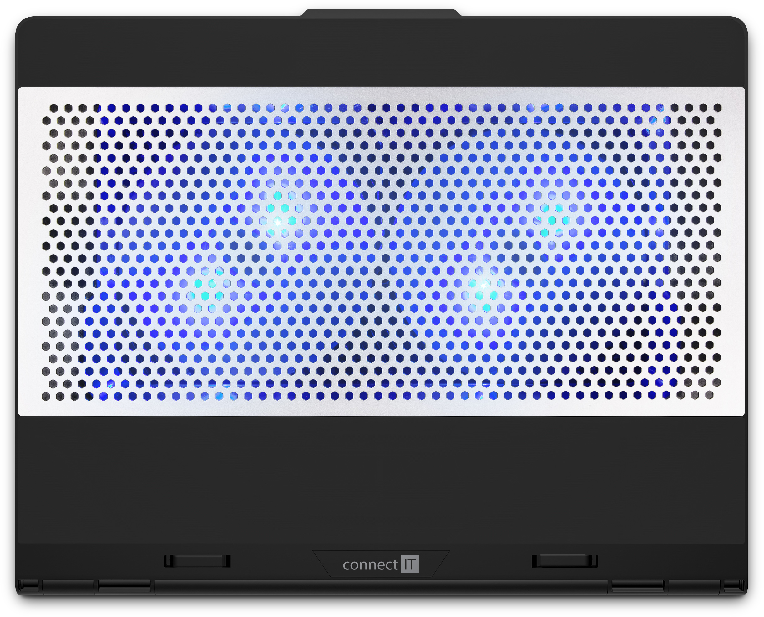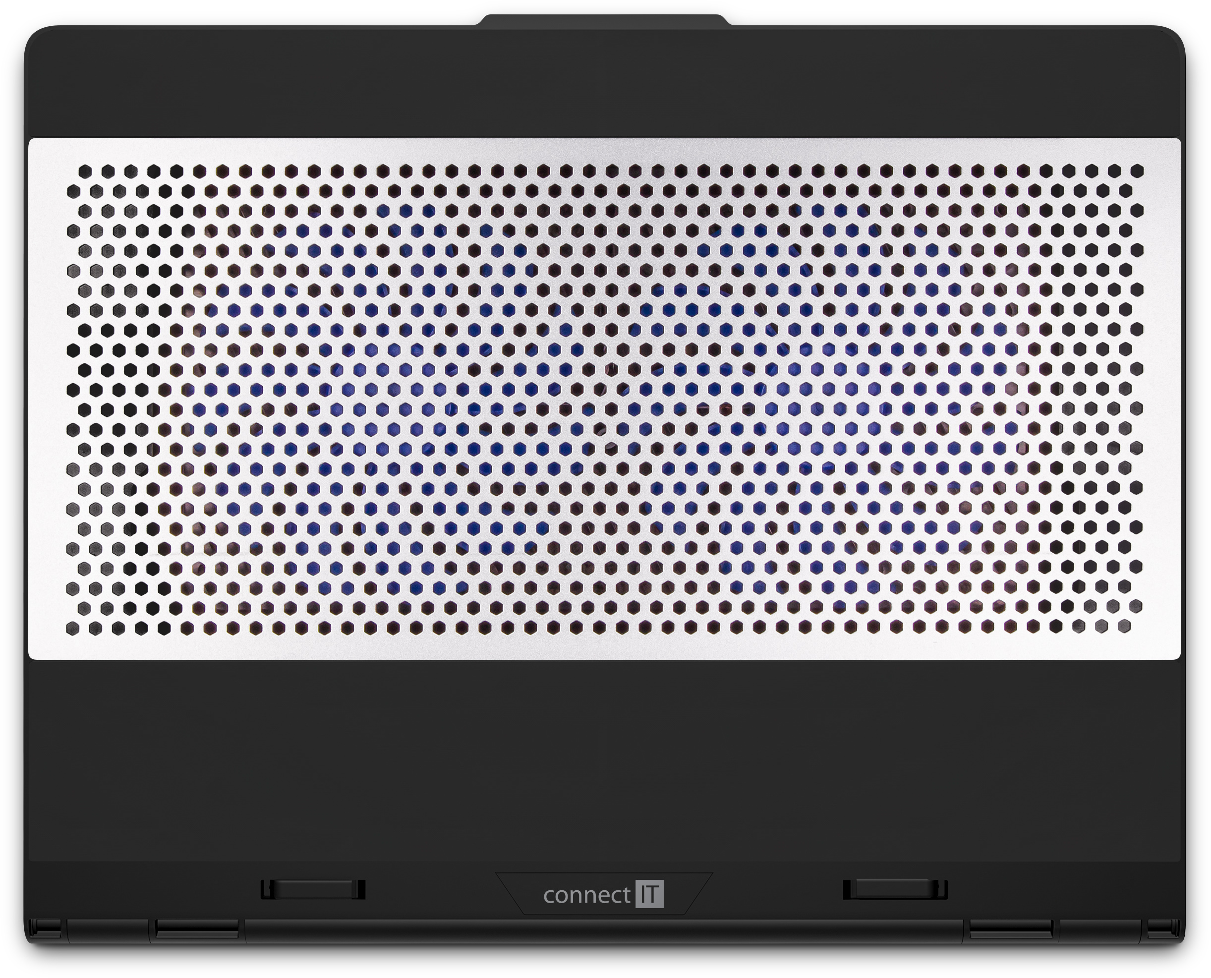 Klíčové vlastnosti: Chladicí podložka pod notebook CONNECT IT "FrostCool" CCP-7100-BK, která je vybavená dvěma ventilátory s modrým LED podsvícením, hliníkovou chladící mřížkou a výškovým šestistupňovým polohováním. Kompatibilní s notebooky do 15,6".