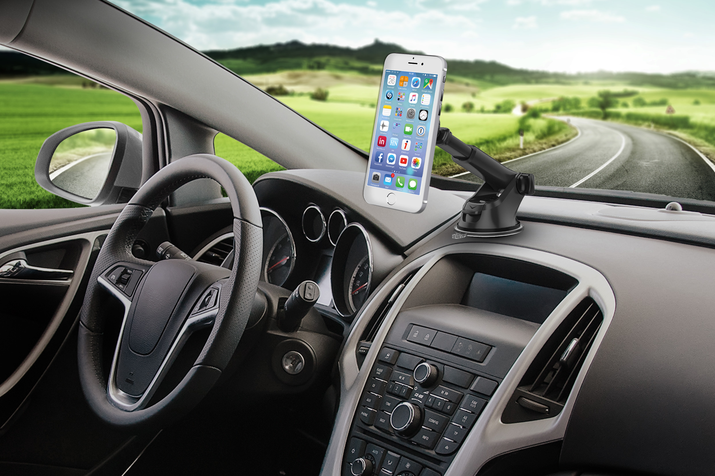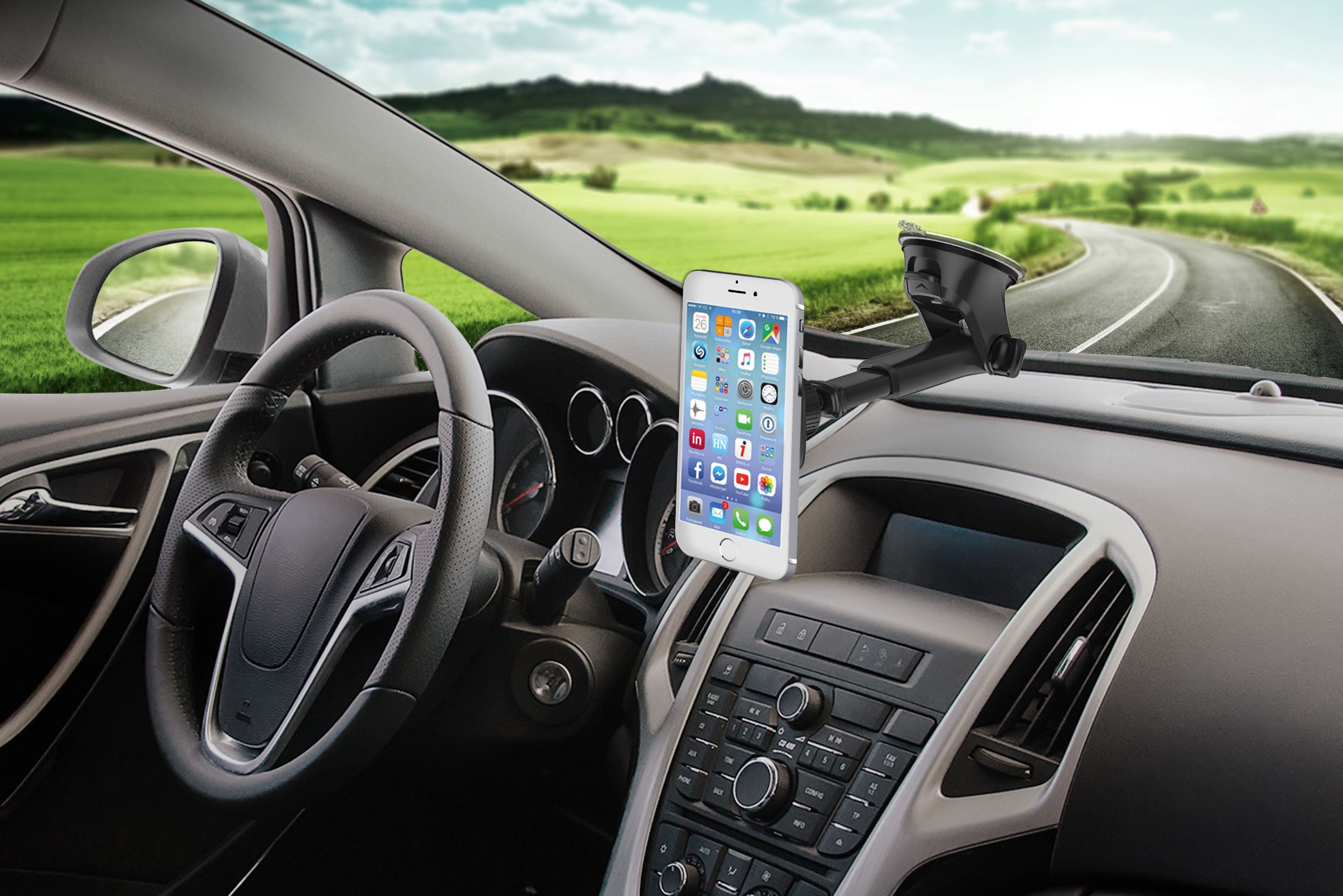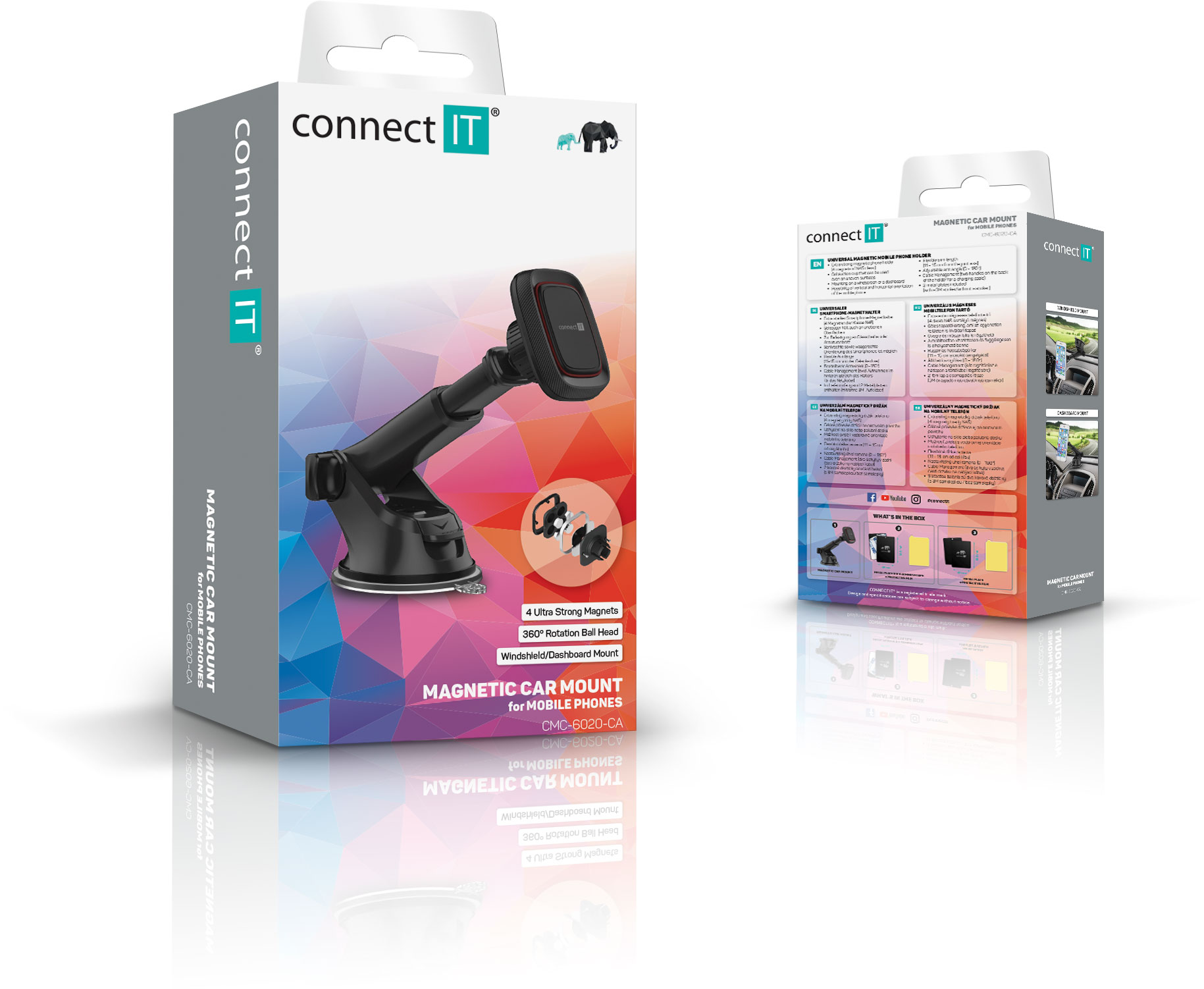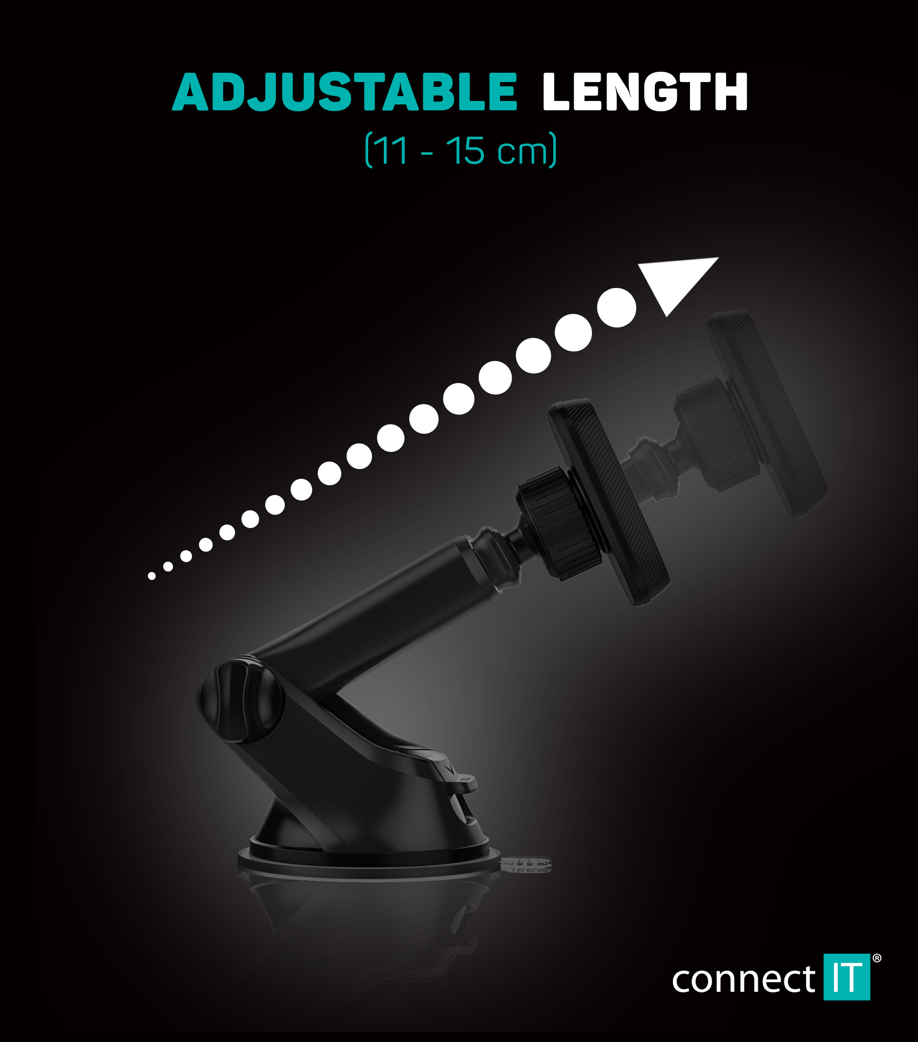 Klíčové vlastnosti: Teleskopický magnetický držák "InCarz 4Strong CARBON" s možností uchycení na palubní desku nebo čelní sklo pomocí speciální gelové nano podložky "AnyGrip", která drží i na strukturovaných palubních deskách, kde je uchycení běžnými držáky nemožné z důvodu nepřilnavosti povrchu. Čtyři extra silné magnety udrží telefon na držáku i při výrazných nerovnostech vozovky a vysokých rychlostech až do 350 km/h. Nastavitelná délka ramena v rozsahu 11 až 15 cm vyhovuje i velmi zkoseným čelním sklům nebo atypickým palubním deskám