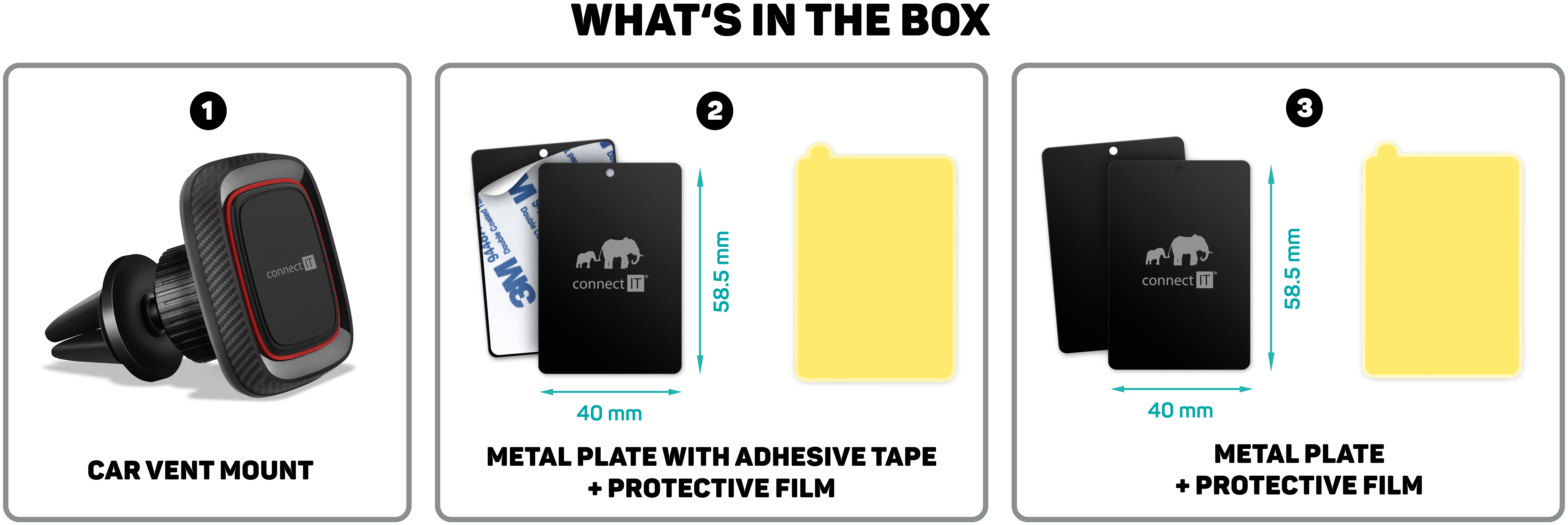 Technické údaje: Kompatibilní se všemi mobilními telefony bez rozdílu velikosti, úhlopříčky a hmotnosti; Připevnění do větrací mřížky automobilu; Cable Management (dva úchyty v zadní části držáku na nabíjecí kabel); Utahovací matice v zadní části pro rychlé a komfortní nastavení do optimálního pozorovacího úhlu; Magnety udrží telefon v držáku i při výrazných nerovnostech vozovky a vysokých rychlostech až do 350 km/h; Skládá se ze dvou hlavních částí - ze samotného držáku a dvou verzí kovových destiček, které se buď přímo nalepí na zadní stranu telefonu nebo se vloží do pouzdra mobilního telefonu.