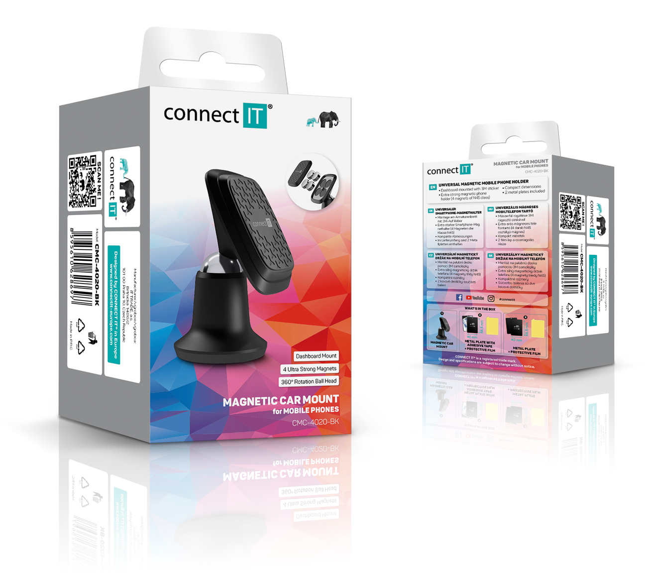 Technické údaje: Kompatibilní se všemi mobilními telefony bez rozdílu velikosti, úhlopříčky a hmotnosti; Připevnění na palubní desku automobilu pomocí ultraadhesivní 3M samolepky (součást dodávky); Magnety udrží telefon v držáku i při výrazných nerovnostech vozovky a vysokých rychlostech až do 350 km/h; Skládá se ze dvou hlavních částí - ze samotného držáku a dvou verzí kovových destiček, které se buď přímo nalepí na zadní stranu telefonu, nebo se vloží pod obal mobilního telefonu; Na samolepící destičce je použita originál 3M samolepka s extra silnou přilnavostí a dlouhou životností odolávající nízkým i vysokým teplotám; Unifikovaný rozměr kovových destiček 40 × 58,5 mm garantuje komfortní kontakt telefonu s magnetickým držákem a kompatibilitu se všemi telefony.