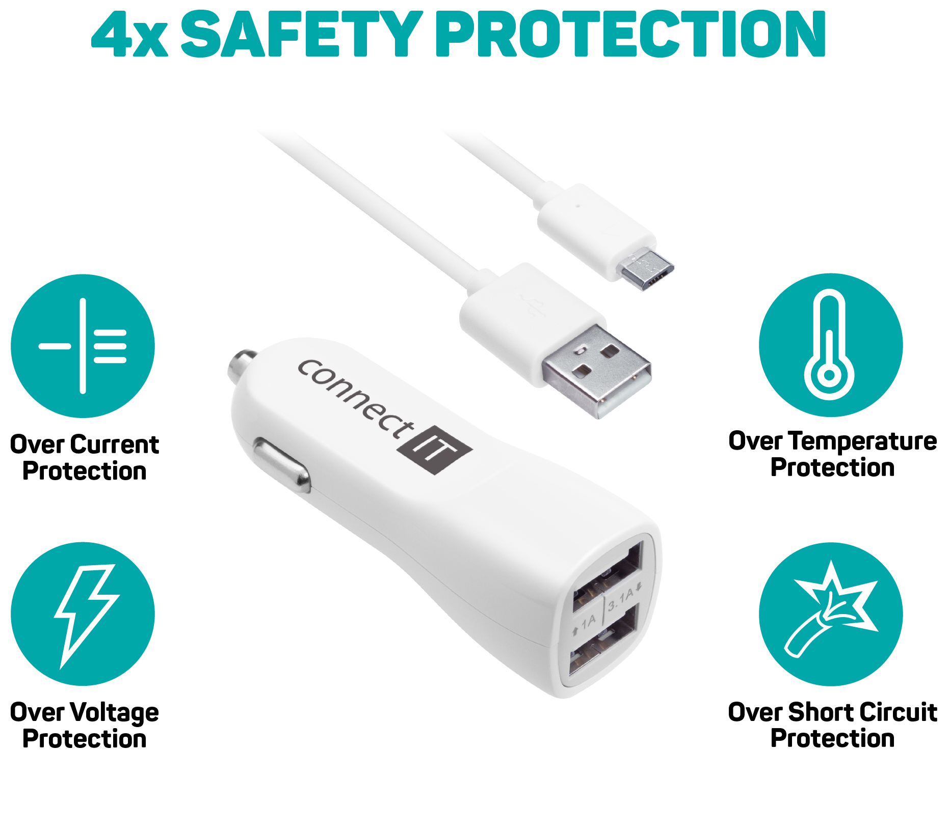 Klíčové vlastnosti: Nabíječka do auta s dvěma USB porty řízenými mikroprocesorem (1 A + 3,1 A). Součástí dodávky je Micro USB kabel (0,25 m)