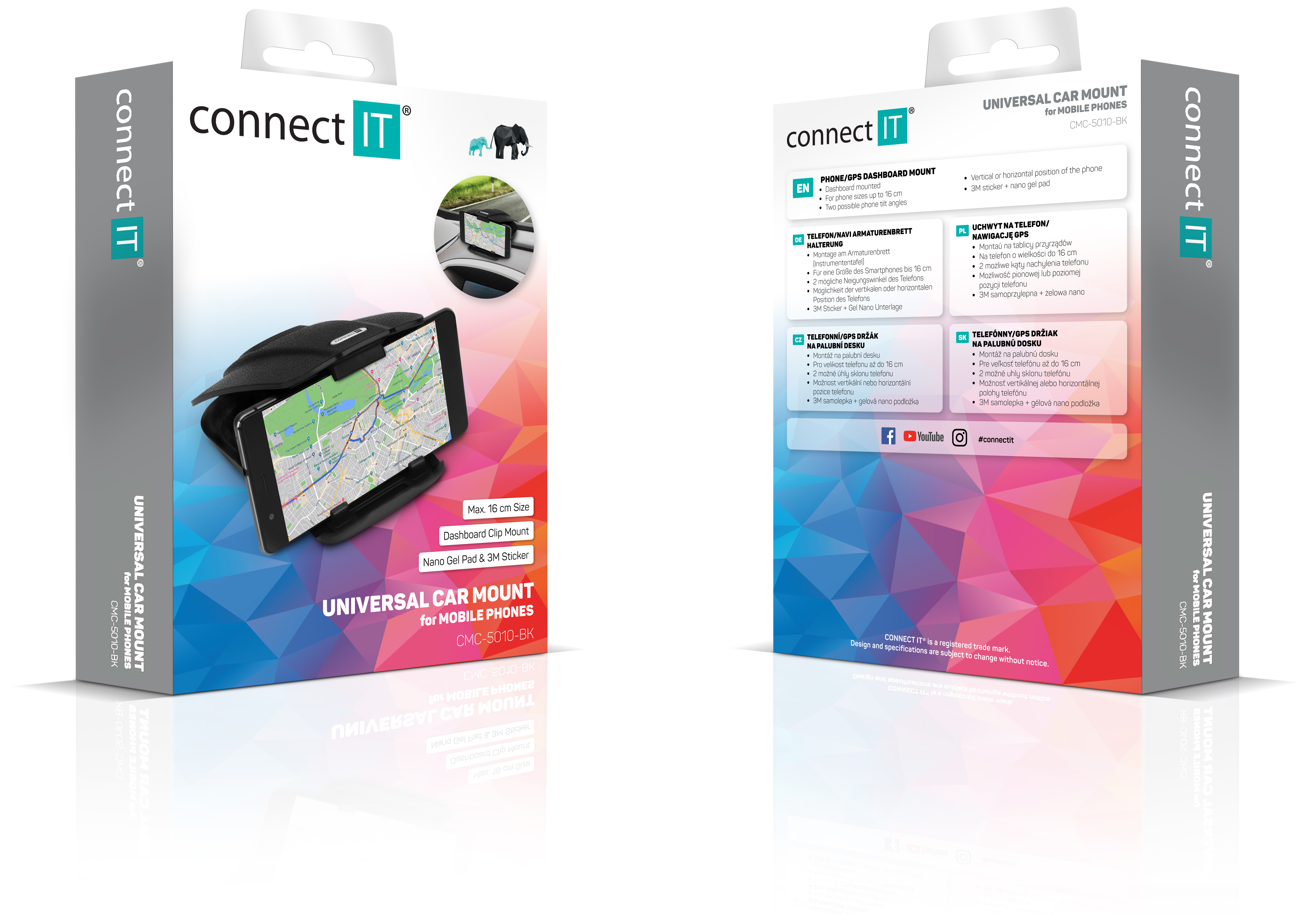 Technické údaje: Kompatibilní se zařízeními až do šířky 16 cm (bez omezení výšky zařízení při vodorovné orientaci); Možnost svislé i vodorovné orientace mobilního telefonu nebo navigace; Dvě možnosti uchycení na palubní desku:; Gelová nano podložka umožňuje uchycení i na strukturovaných palubních deskách, kde je uchycení běžnými držáky nemožné z důvodu nepřilnavosti povrchu; Uchycení omyvatelnou gelovou nano podložkou umožňuje přenositelnost držáku i do dalšího vozidla (rodinné, firemní atd.); Na výběr ze dvou úhlů náklonu zařízení v držáku.