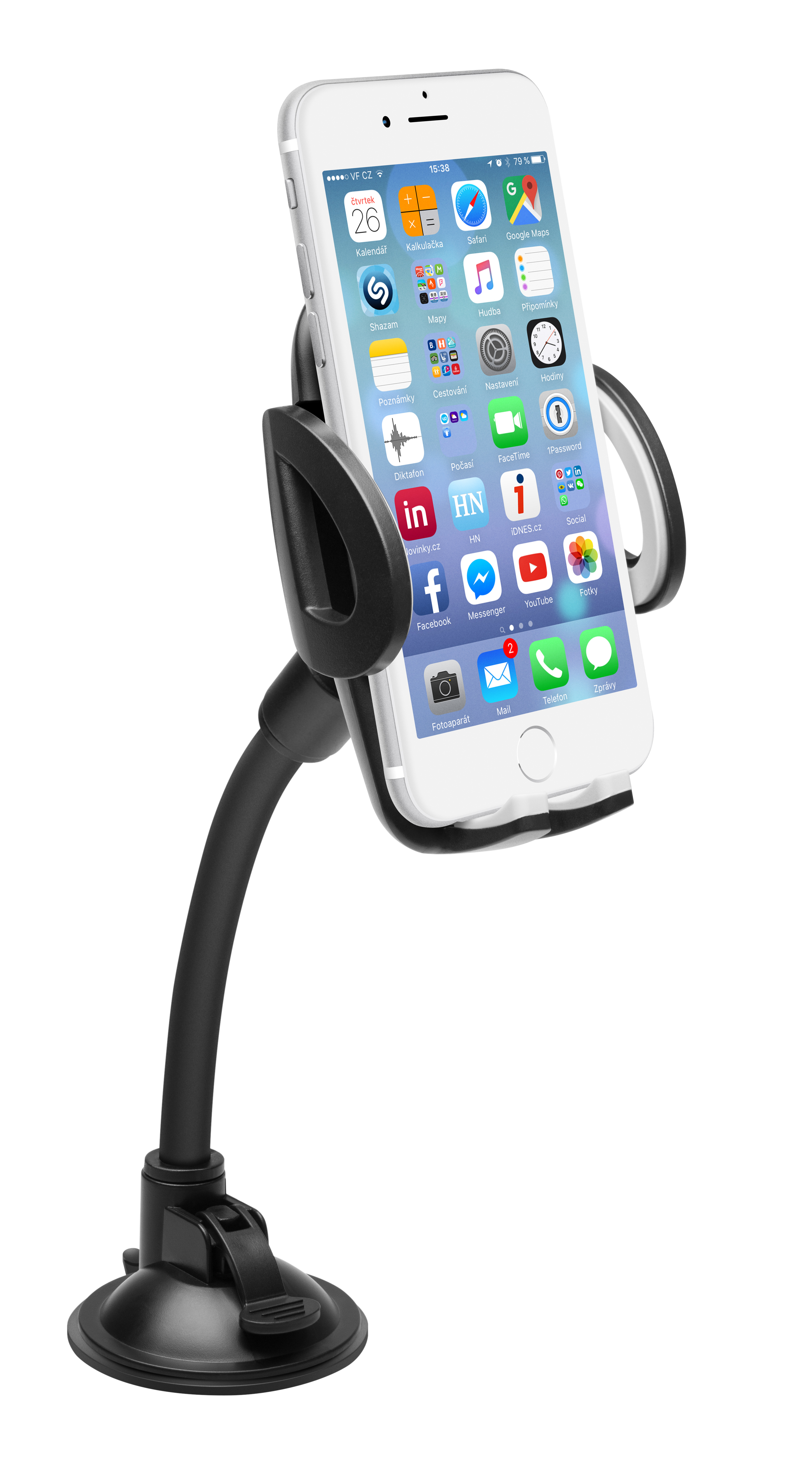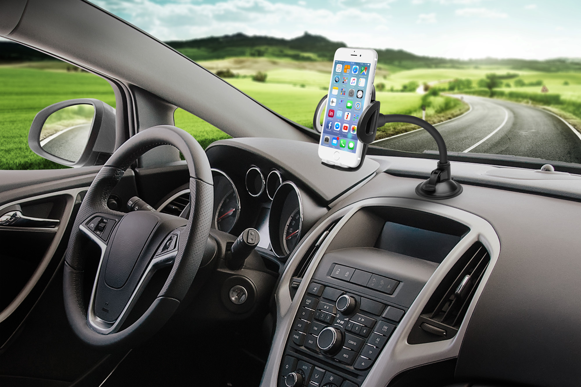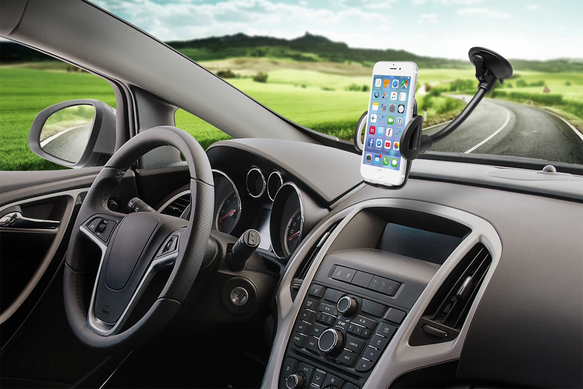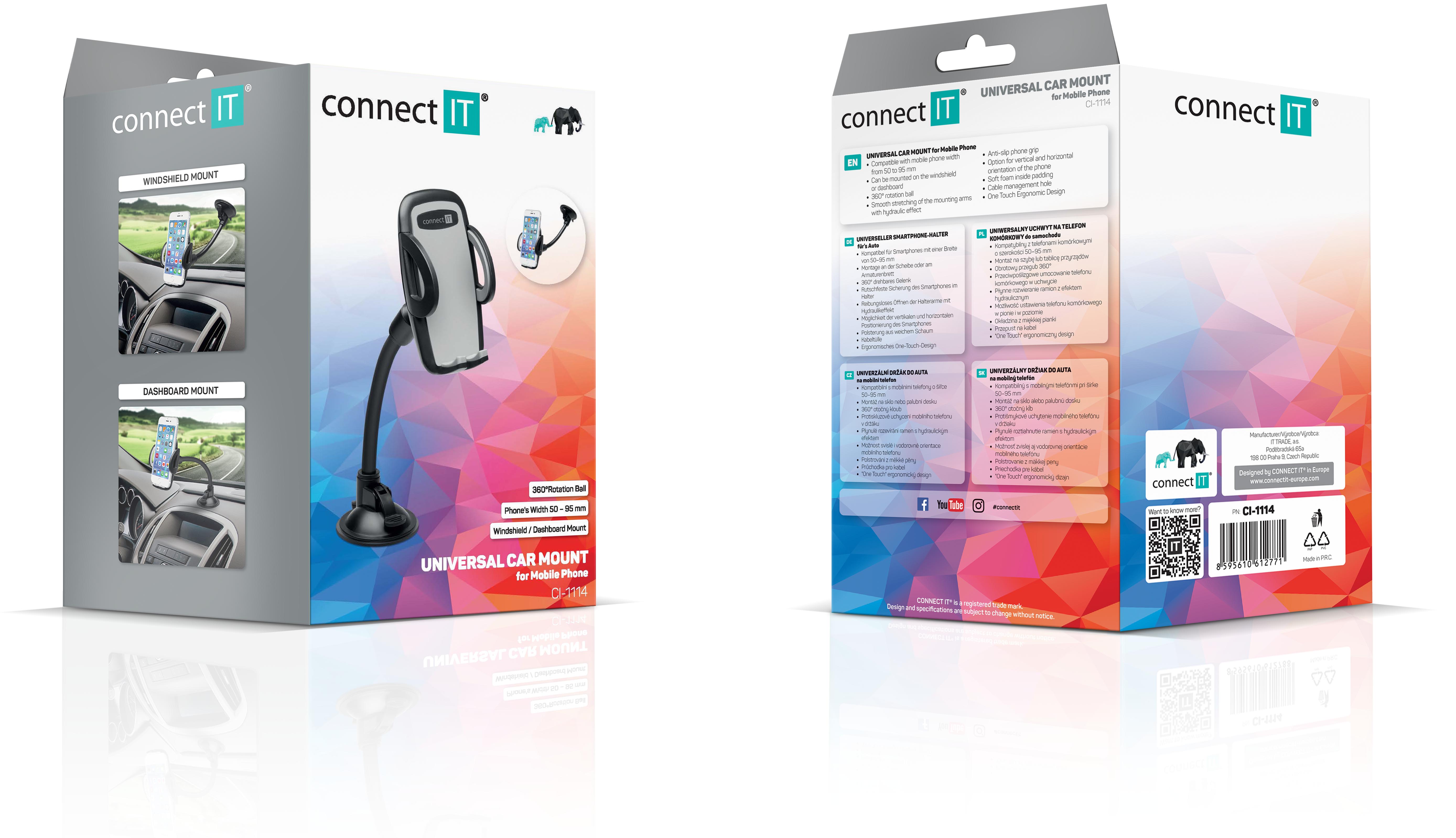 Klíčové vlastnosti: Univerzální držák do auta slouží k uchycení mobilního telefonu na sklo nebo palubní desku vozu. Umožňuje komfortní a bezproblémové používání mobilního telefonu během jízdy. Držák je kompatibilní se všemi telefony o šířce 50 - 95 mm. Díky dlouhému ohebnému krku a otočnému kloubu lze telefon orientovat svisle i vodorovně a nastavit na jakýkoliv sklon a vzdálenost od čelního skla až do 225 mm.