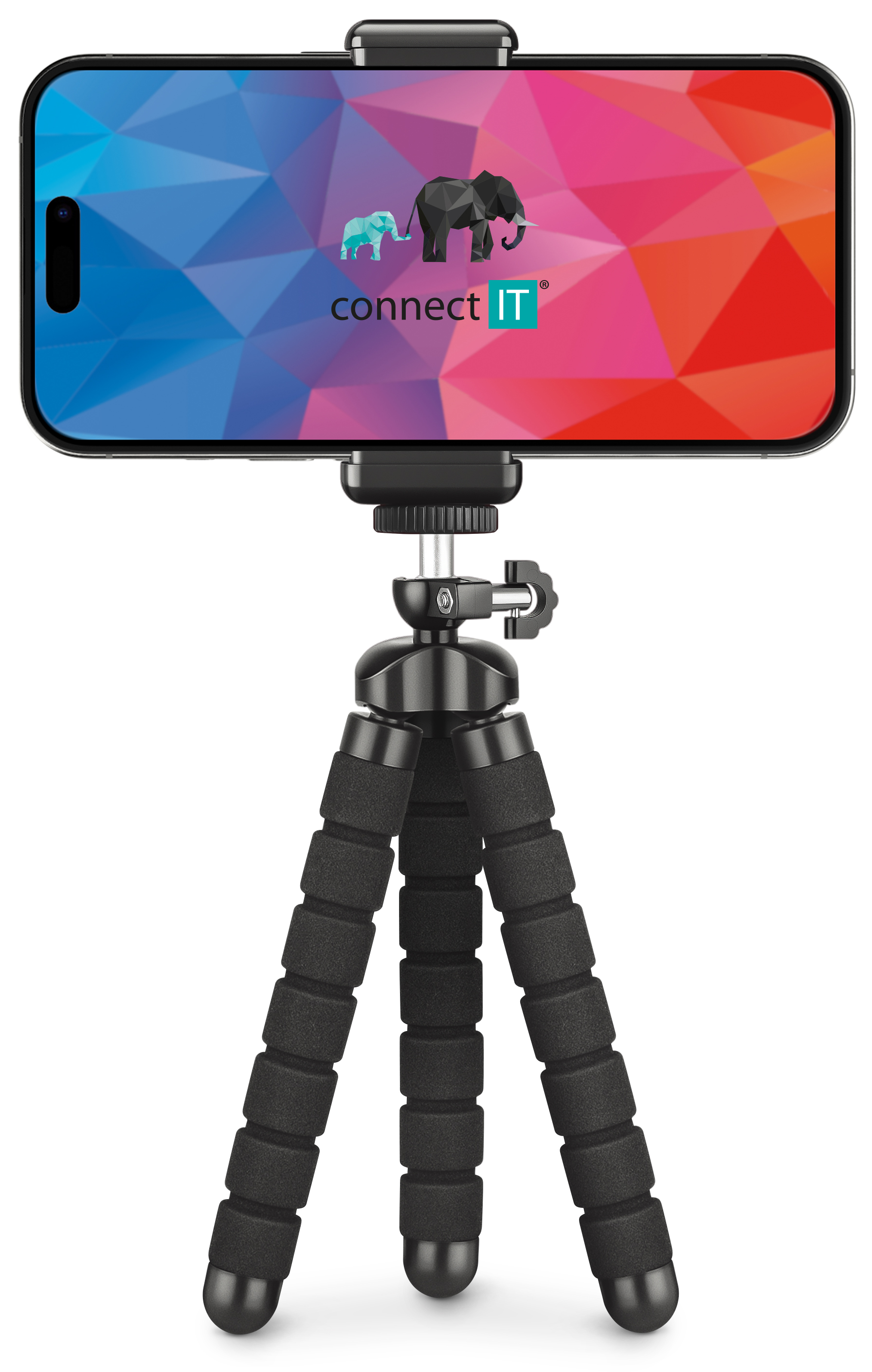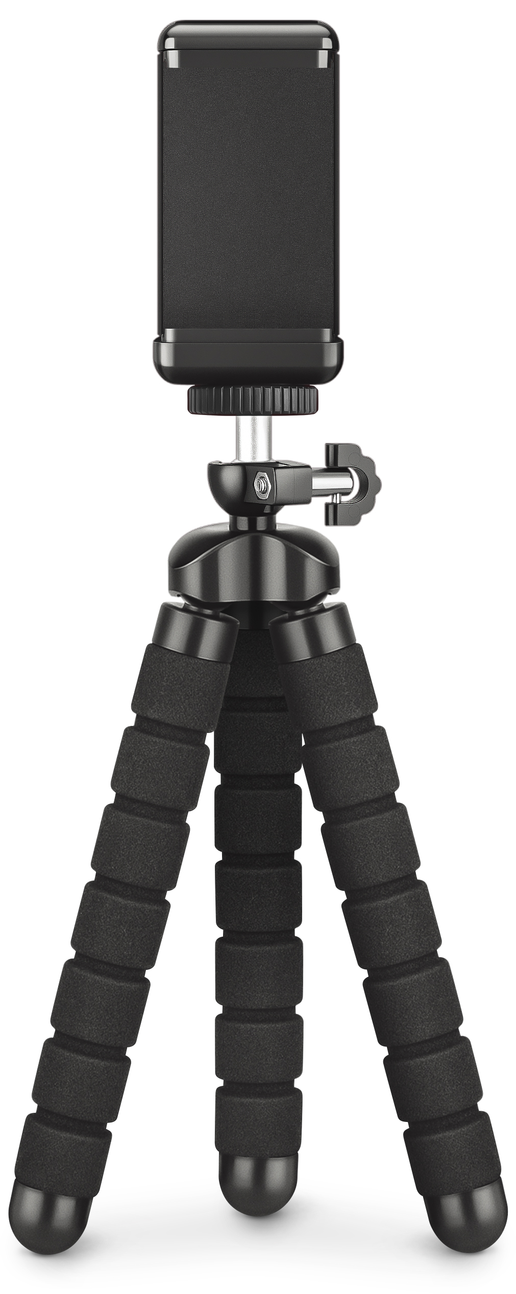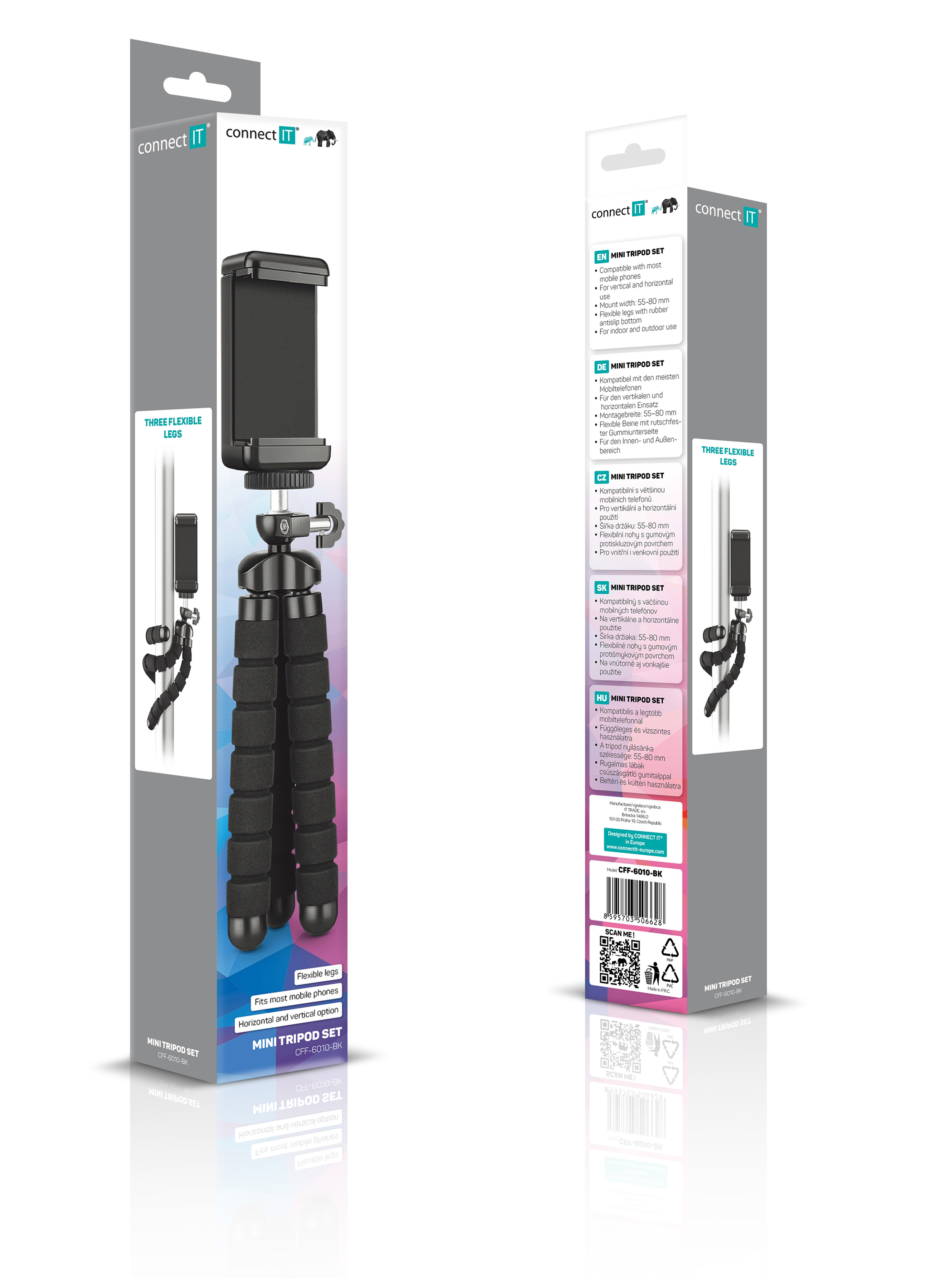 Klíčové vlastnosti: Mini Tripod set s flexibilními nohami, které lze přichytit například na větve stromů, zábradlí, řídítka kola nebo na monitor počítače a mnoho dalších míst a různých úhlů. Gumové zakončení nohou zaručují stabilitu na jakémkoliv povrchu. Mini tripod set je velmi skladný a schová se do každého batohu nebo kabelky, ve složeném stavu měří 24,5 cm a váží pouhých 76 g. Maximální zatížení je 0,5 kg. Součástí Mini Tripod setu je držák, který sedí na šířku většiny telefonů na trhu a je možné ho v něm umístit jak na šířku, tak na výšku, podle potřeby uživatele.