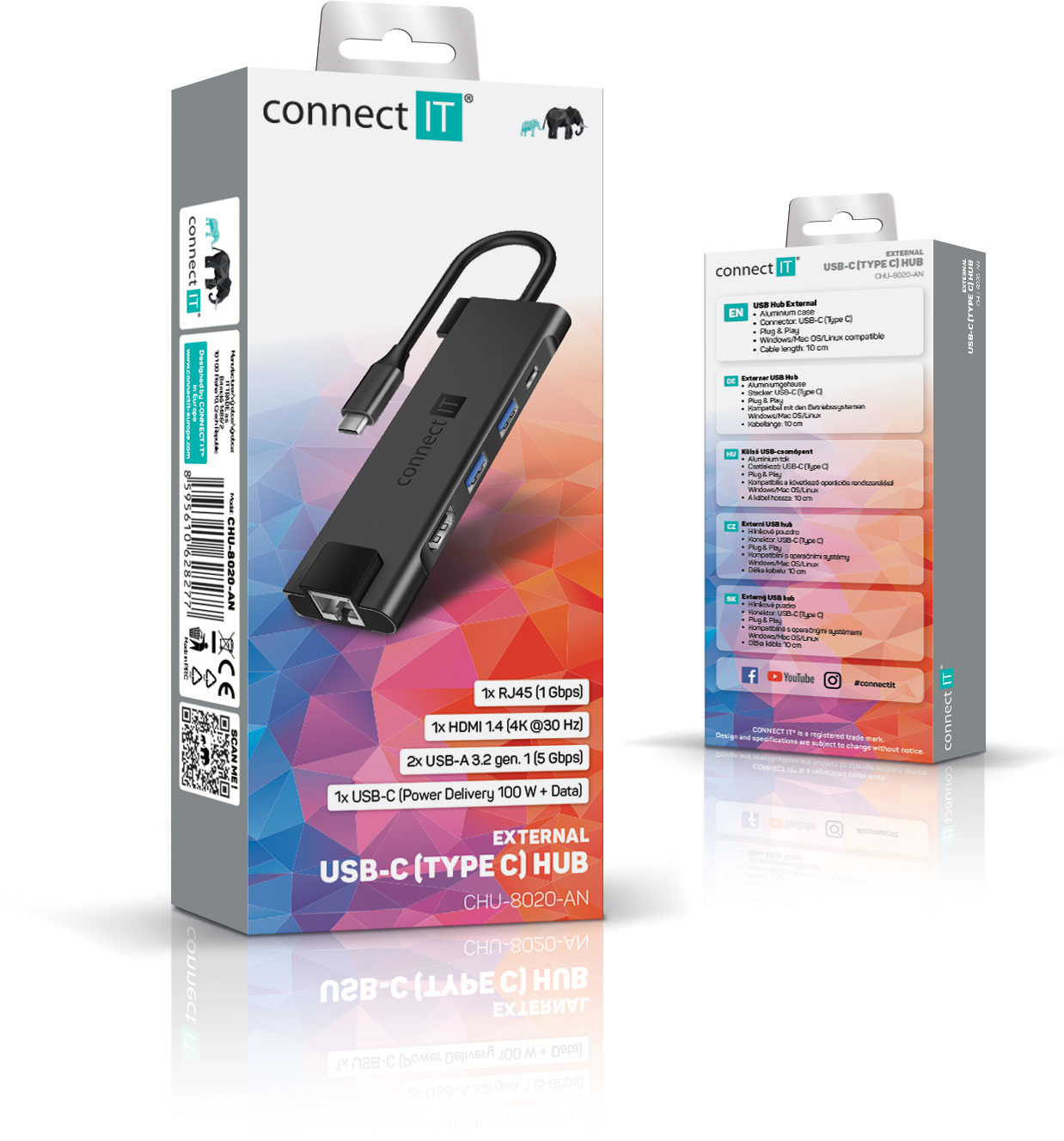 Klíčové vlastnosti: Prakticky tvarovaný USB-C hub "Multi5in1" pro připojení až 5 periferií (USB-C, HDMI, 2x USB-A a RJ45 Gigabit Ethernet).