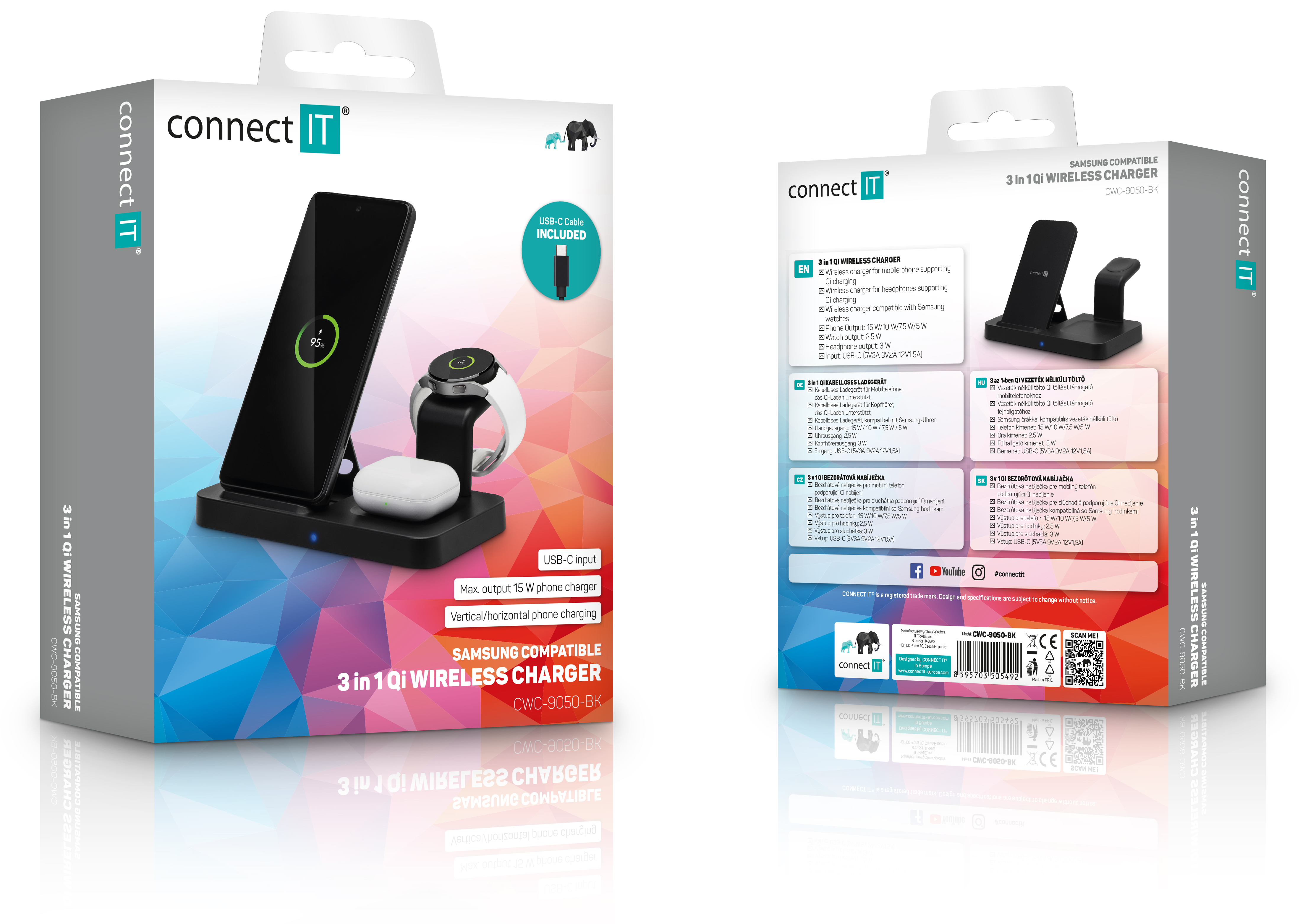 Klíčové vlastnosti: MultiCharge 3v1 Wireless Fast Charge bezdrátová magnetická Qi nabíječka. Podporuje až 15W Qi rychlonabíjení mobilních telefonů, 2.5W Qi nabíjení pro hodinky Samsung a 3W Qi nabíjení pro sluchátka.