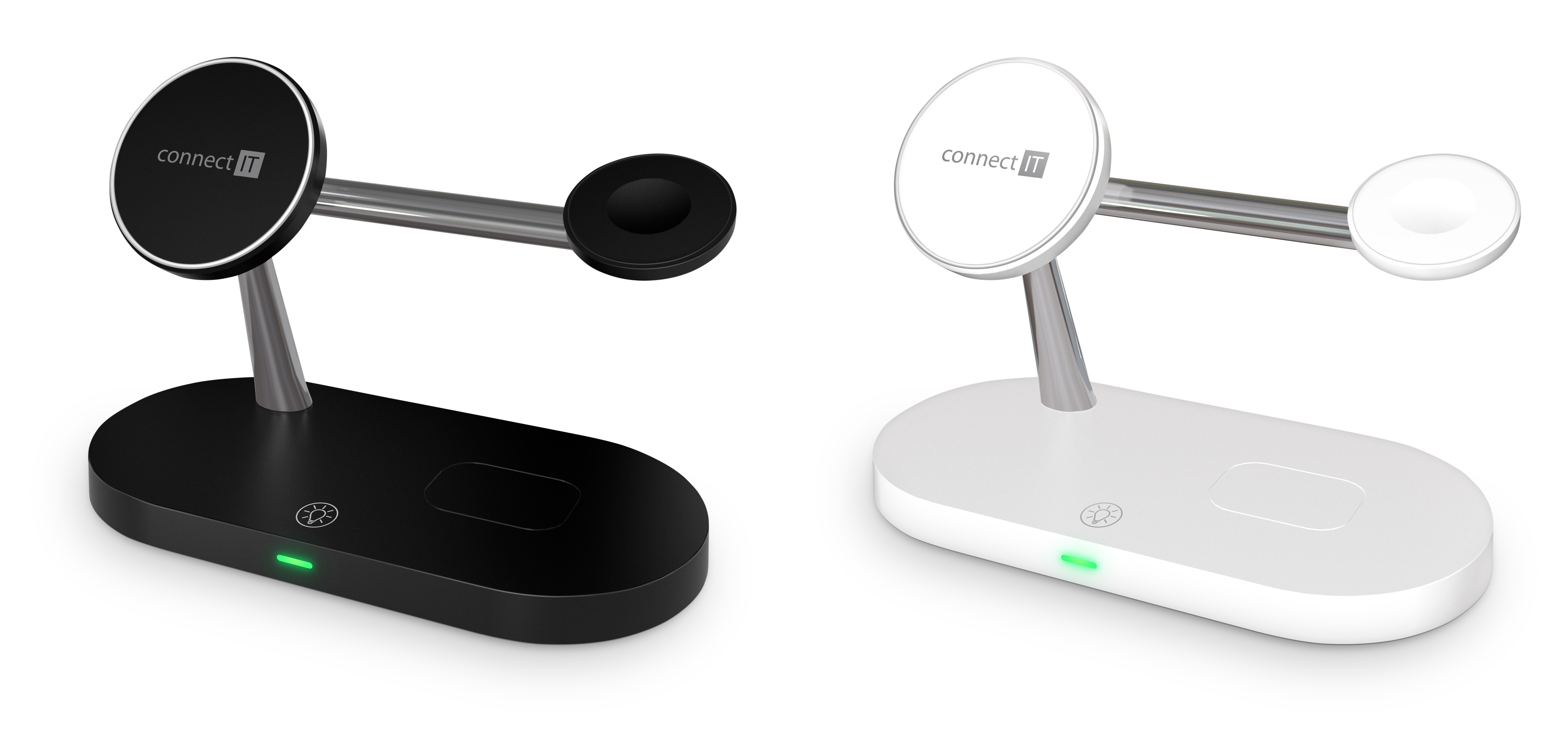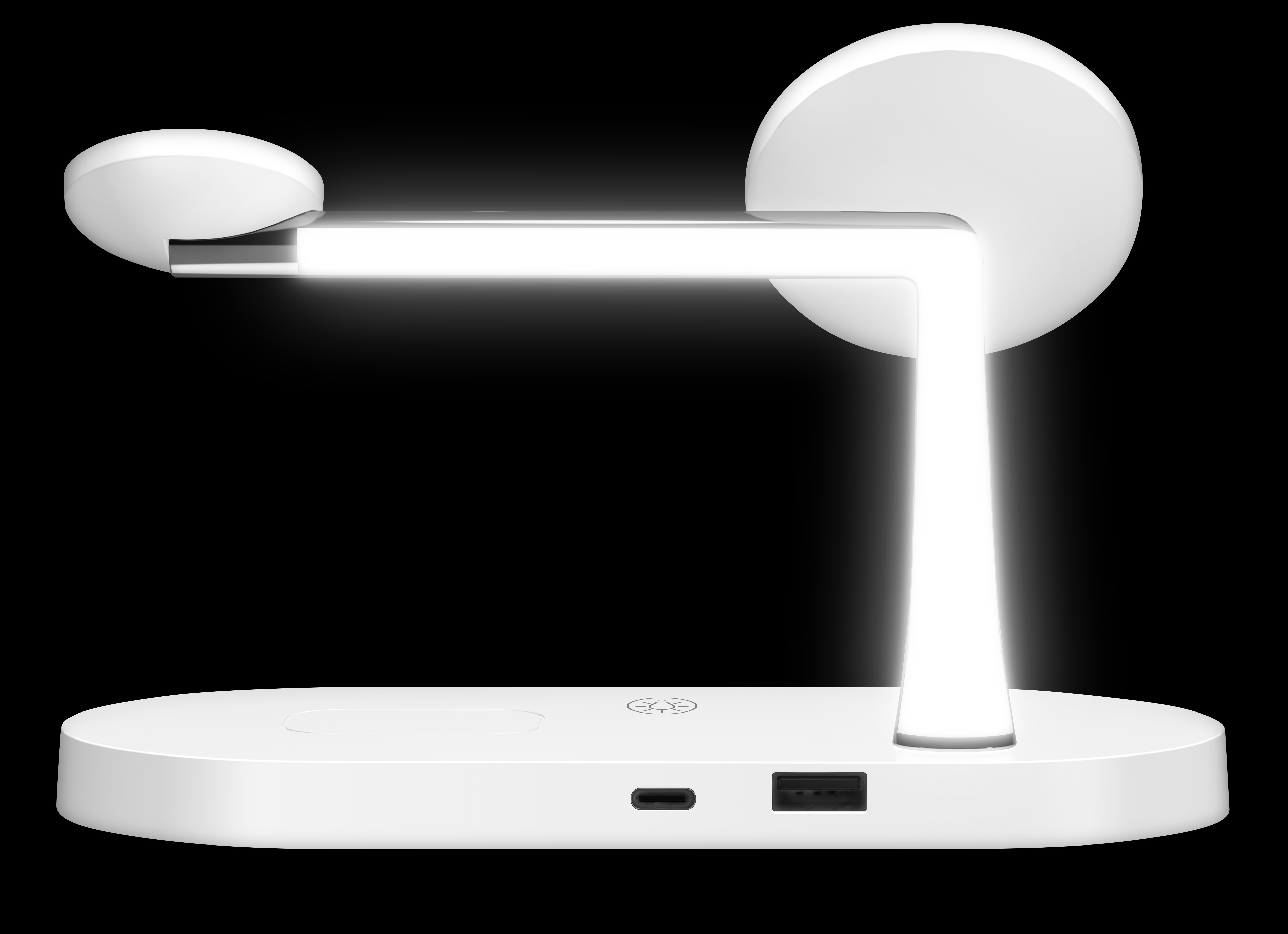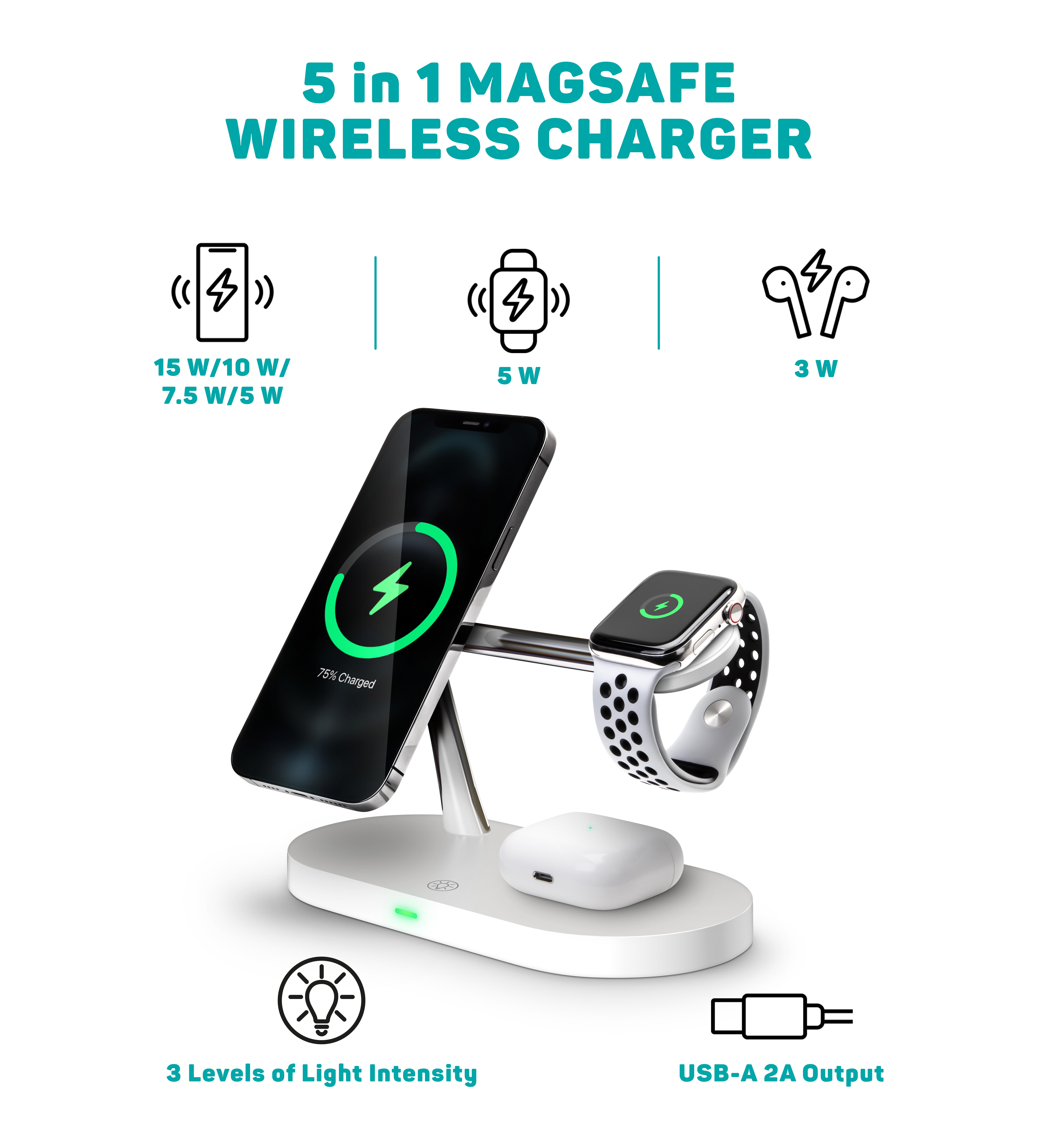 Klíčové vlastnosti: MagSafe 5v1 Wireless Fast Charge bezdrátová magnetická nabíječka se zabudovanou lampičkou s 3 úrovněmi intenzity světla. Podporuje až 15 W rychlonabíjení a magnetickým kruhem pro nabíjení iPhone, 5 W Qi nabíjení pro Apple Watch a 3 W nabíjení pro Apple AirPods. Nabíječka disponuje i USB-A 2A výstupem pro nabíjení dalších zařízení.