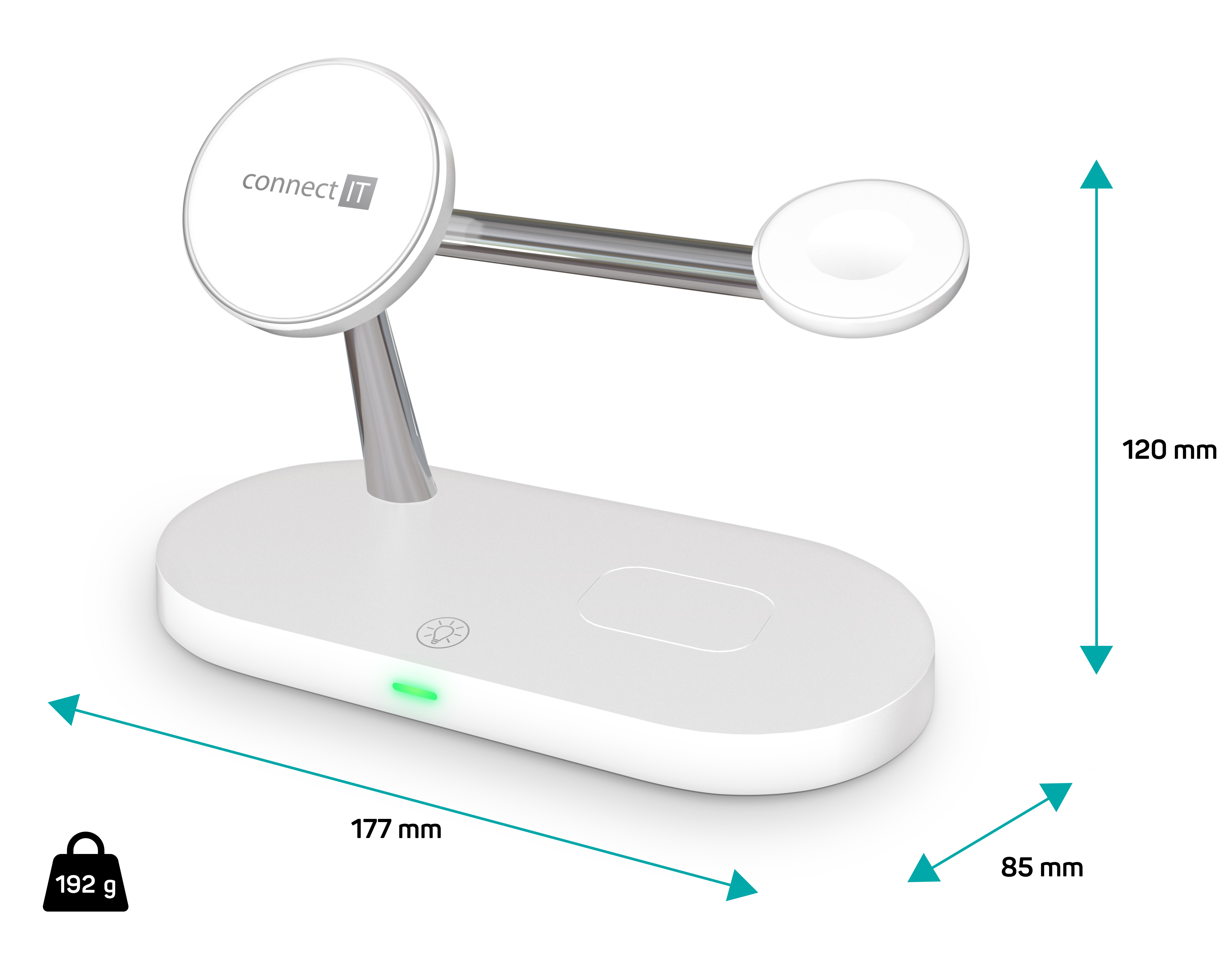 Technické údaje: Bezdrátové nabíjení (telefon, sluchátka i hodinky stačí pouze položit na nabíječku); Integrovaný magnetický kruh MagSafe pro nabíjení Apple iPhone; Kompatibilní se všemi telefony s MagSafe; Kompatibilní s hodinkami Apple Watch a sluchátky Apple AirPods s podporou bezdrátového Qi dobíjení; Podpora až 15 W rychlonabíjení Qi Fast-Charge pro iPhone (1,4x rychlejší nabíjení v porovnání se standardními bezdrátovými nabíječkami ušetří až 50 minut času); Zabudovaná LED lampička se třemi úrovněmi intenzity světla aktivovaná pomocí dotykového tlačítka.