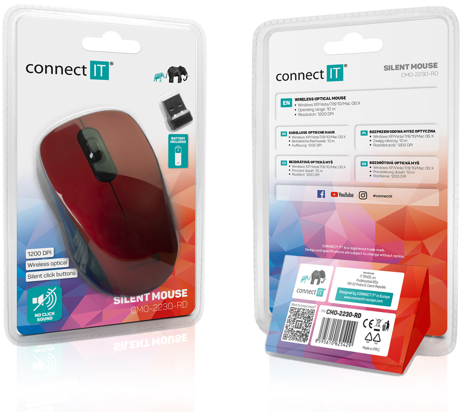 Technické údaje: "MUTE" bezdrátová optická tichá myš CMO-2230-RD; Určena pro domácí i kancelářské profesionální použití; Speciálně upravená konstrukce spínačů tlačítek pro absolutně tichý a měkký chod (při klikání nevydává žádný zvuk); Speciální ergonomie snižující únavu i při dlouhodobém použití; Optický senzor (rozlišení 1200 DPI); Vysoká přesnost ideální také pro práci v grafických editorech.