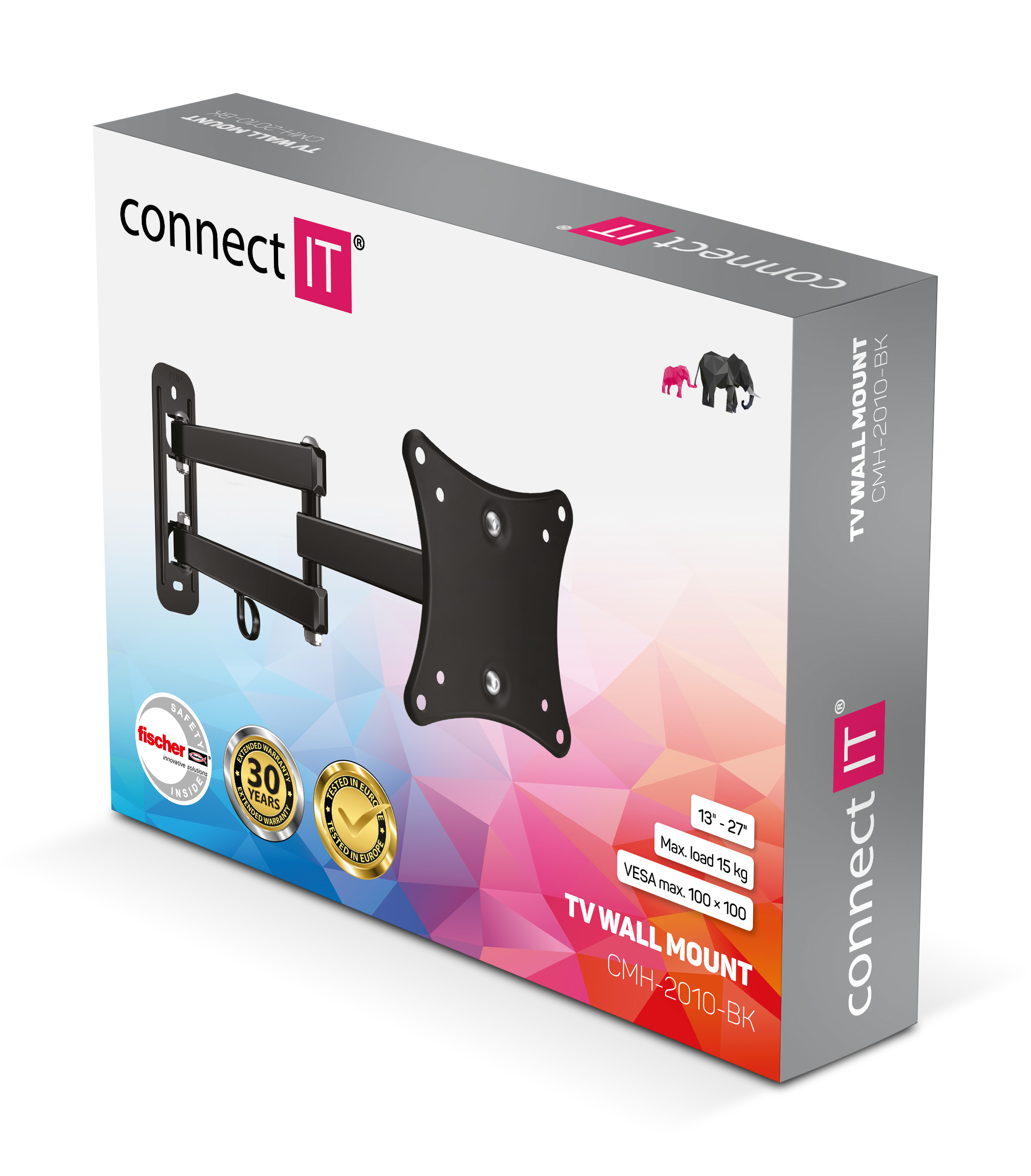 Klíčové vlastnosti: TV držáky značky CONNECT IT se svou pověstnou kvalitou a šířkou nabídky řadí mezi současnou špičku v oboru. Záruka na vybrané modely je 30 let. Vyznačují se kvalitními materiály, precizním dílenským zpracováním a snadnou montáží. Nesetkáte se u nich s vůlí v kloubech ani nepříjemným vrzáním. Součástí balení každého držáku je sada SX hmoždinek renomované německé značky FISCHER umožňující kotvení do betonu, pórobetonového zdiva, plného, ale i děrovaného zdiva. Všechny TV držáky jsou testovány na trojnásobek uváděné nosnosti.