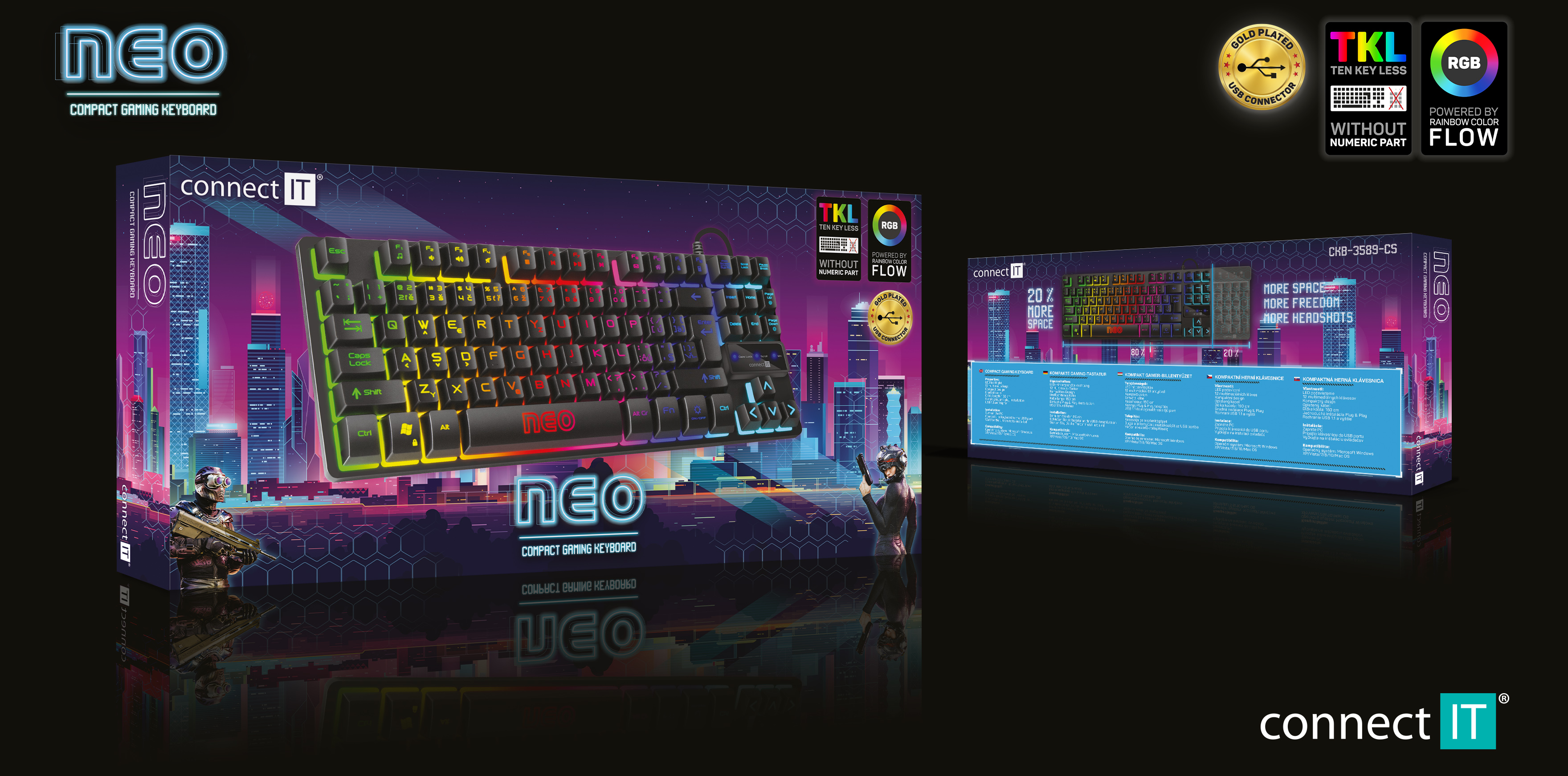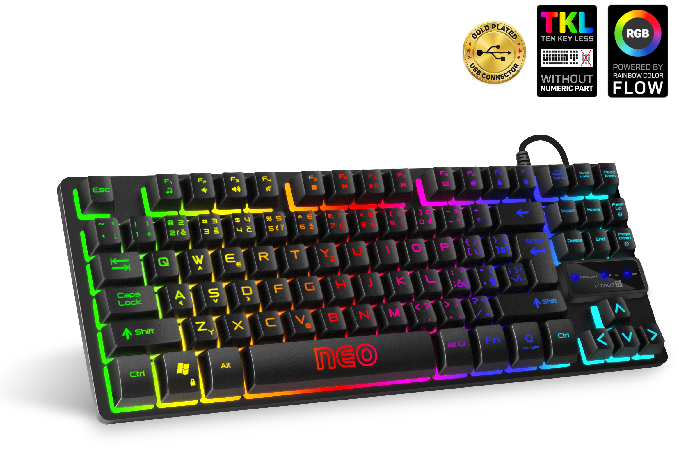 Klíčové vlastnosti: Profesionální gamingová klávesnice NEO Compact je unikátní svým TKL (Ten Key Less) designem, který je bez numerické části a díky tomu vzniká na stole větší prostor pro pohyb myši na podložce. Tato klávesnice je v českém a slovenském layoutu s 2 módy barevného rainbow podsvícení a třístupňovou regulací intenzity podsvícení.