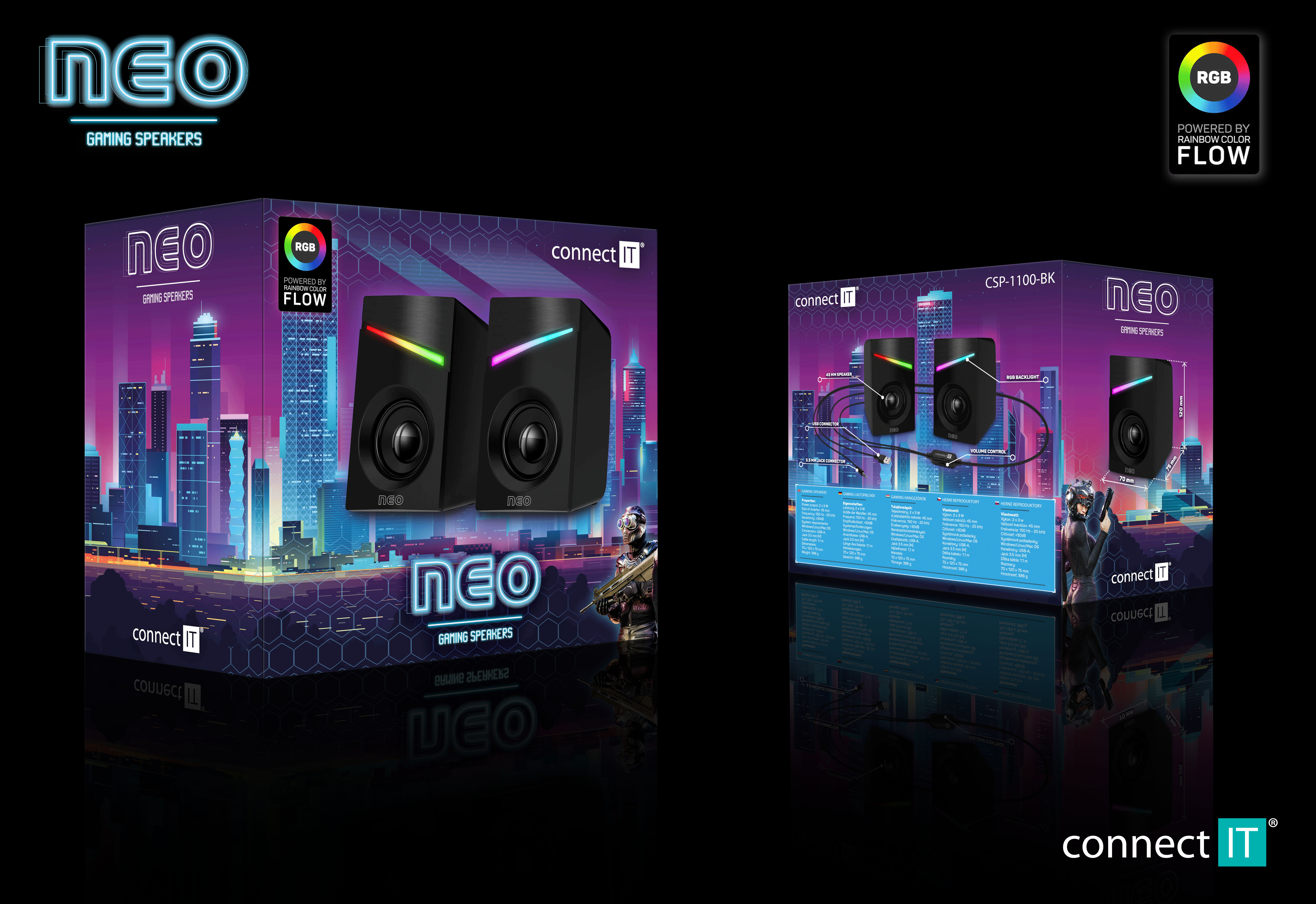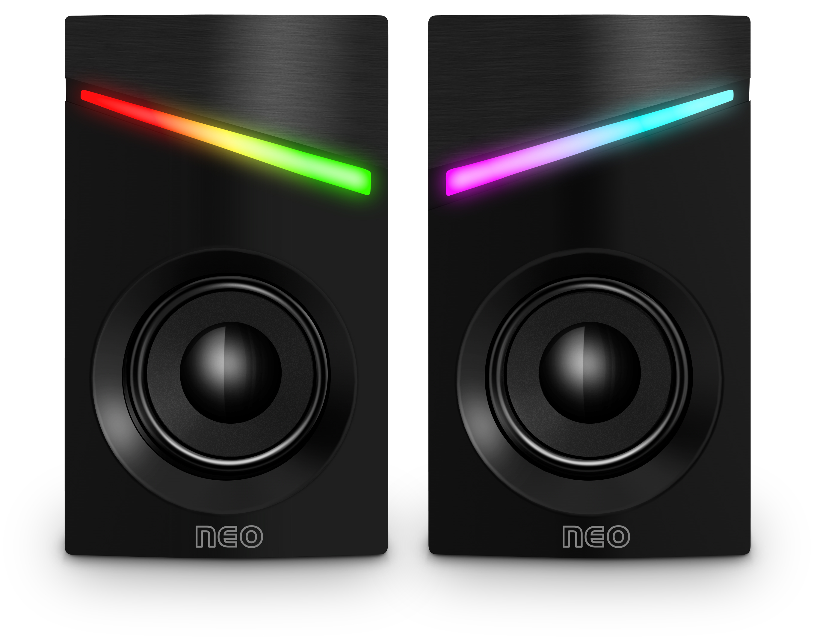 Technické údaje: Gamingové reproduktory NEO pro hráče počítačových her; Určena pro profesionální i domácí použití; Podsvícení obou reproduktorů v Rainbow barevném spektru; Dálkové ovládání na kabelu s možností ovládání hlasitosti; Konektory:; USB-A 2.0 (konektor pro podsvícení, neslouží pro přenos zvuku).