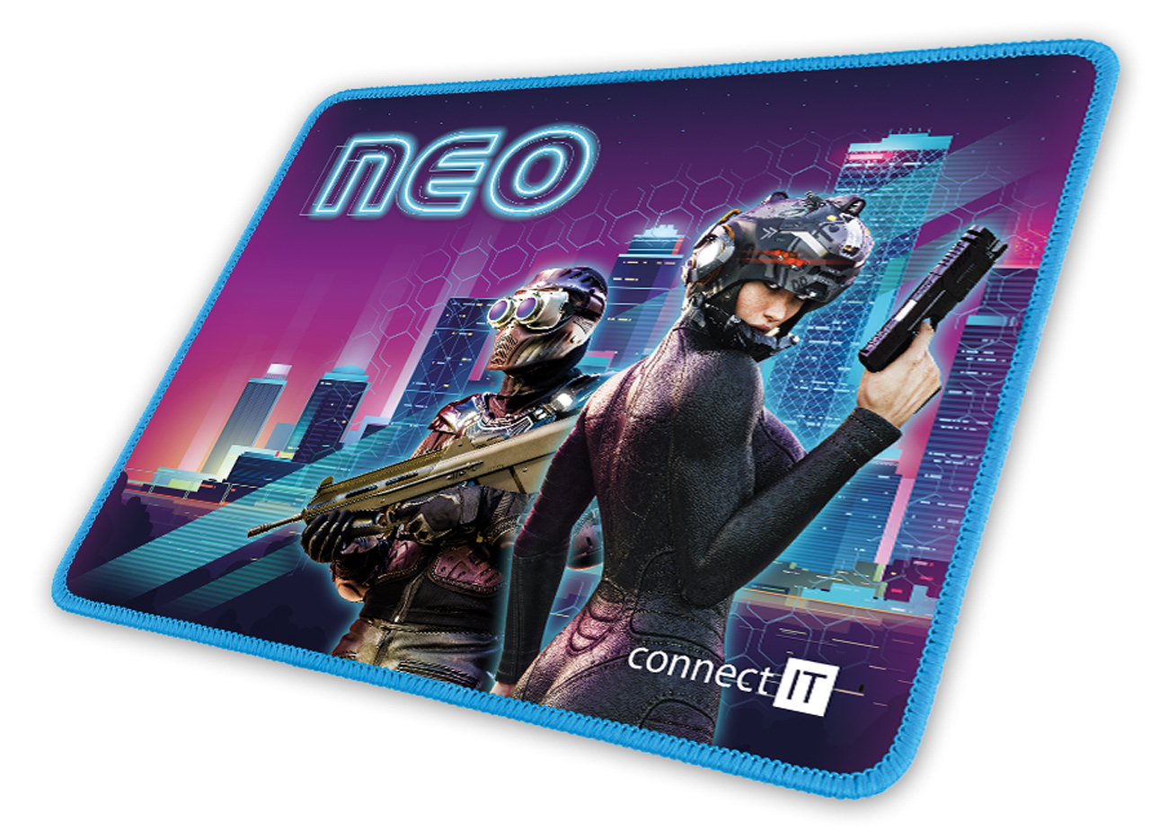 Klíčové vlastnosti: Profesionální podložka herní řady NEO určená i pro amatérské využití. Podložka má měkký, příjemný povrch s nadčasovým cyber potiskem. Při velikosti herní plochy 320 × 245 mm vám nikdy nedojde prostor k pohybu. Velkou výhodou je pogumovaná protiskluzová spodní strana a antistatický povrch, po kterém bez problému bude jezdit každá myš. Materiál byl navržen tak, aby odpuzoval vodu a nečistoty. Podložka má obšité okraje speciální kvalitní svítící nití, která ve tmě jemně svítí.
