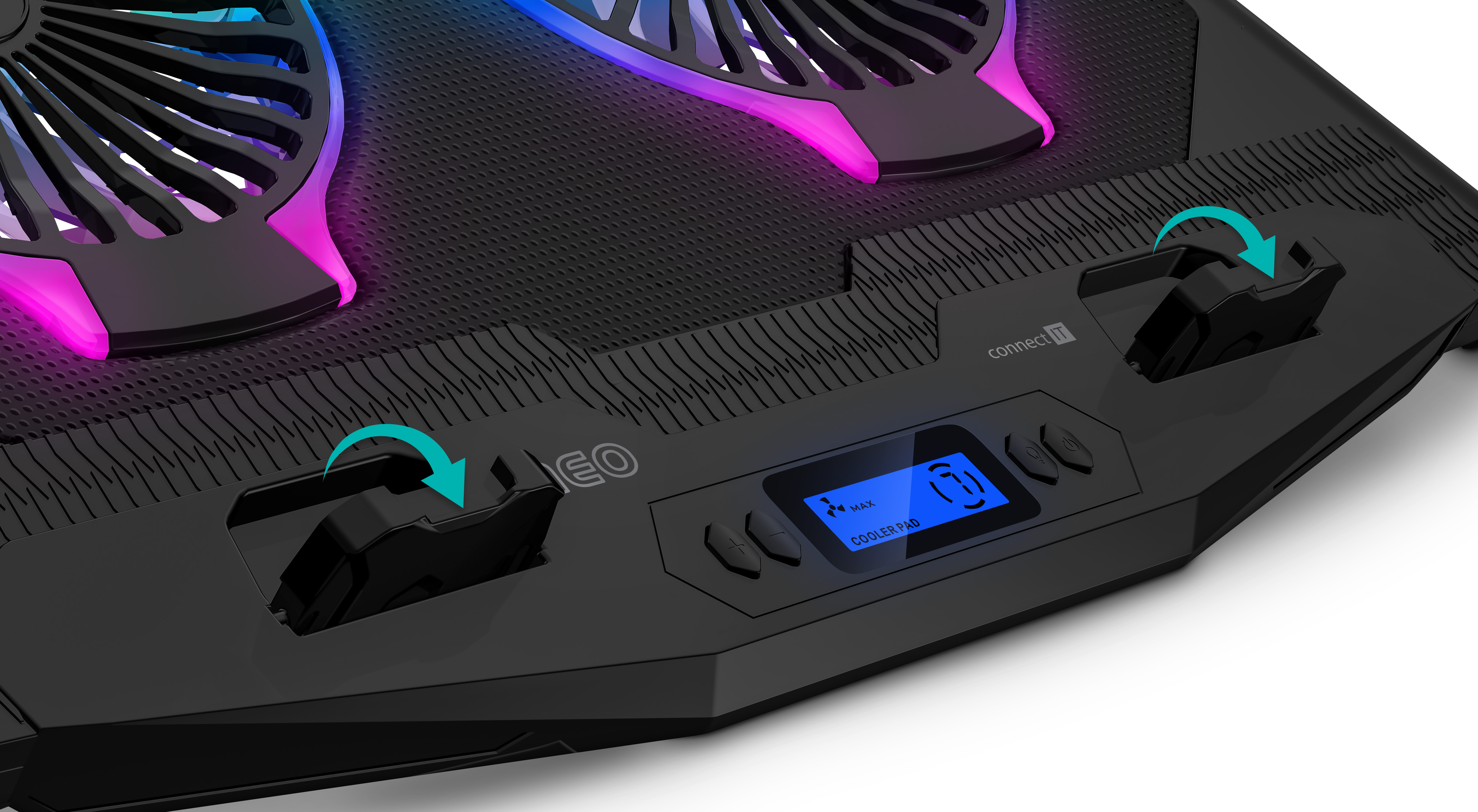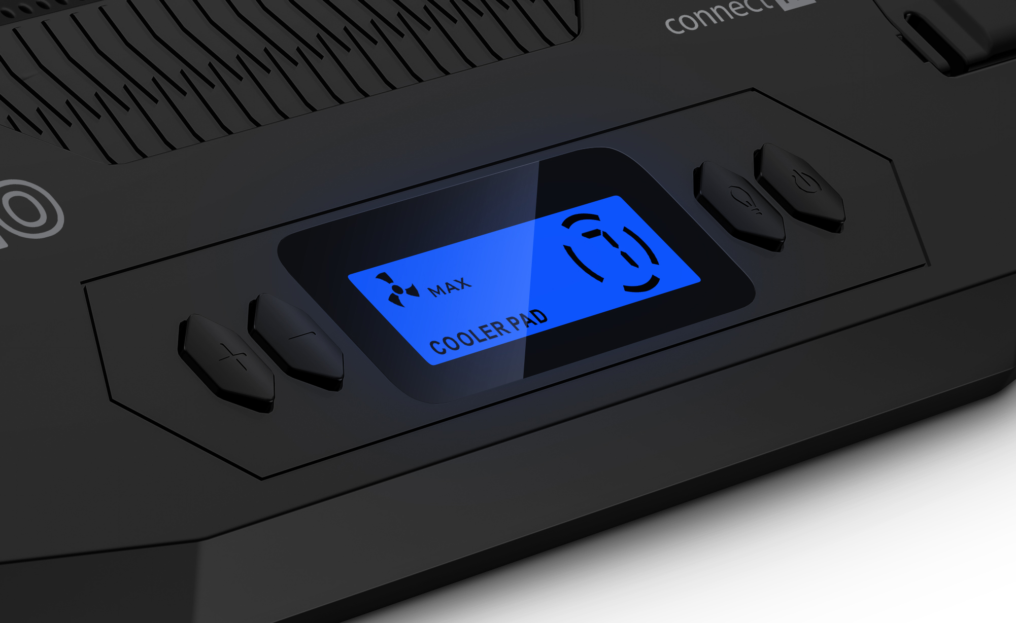 Technické údaje: Kompatibilní se všemi notebooky do velikosti 17"; Regulace rychlosti ventilátorů v 6 stupních; Vyklápěcí opora pro notebook ve spodní části chladiče s měkčenou vnitřní částí pro maximální ochranu spodní hrany notebooku; LCD display; Ovládání:; zvyšování rychlosti ventilátorů (stisknutím tlačítka "+").