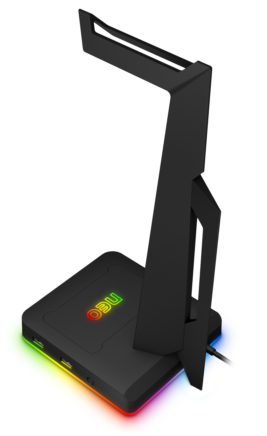 Klíčové vlastnosti: Praktický stolní stojánek na sluchátka pro domácí i profesionální použití s RGB rainbow color flow podsvícením a dvěma USB 2.0 porty.