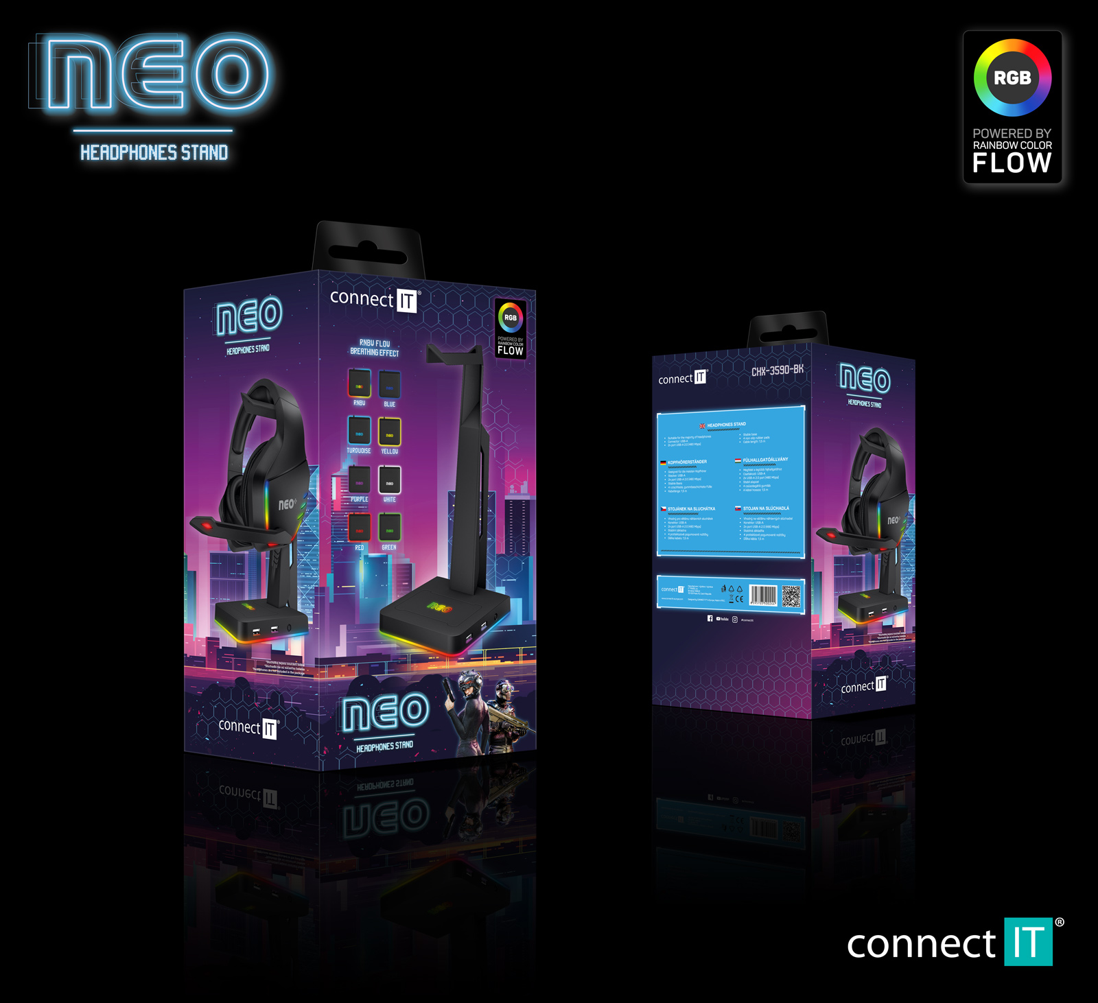 CONNECT IT NEO Stand-It RGB stojánek na sluchátka + USB hub - Černá