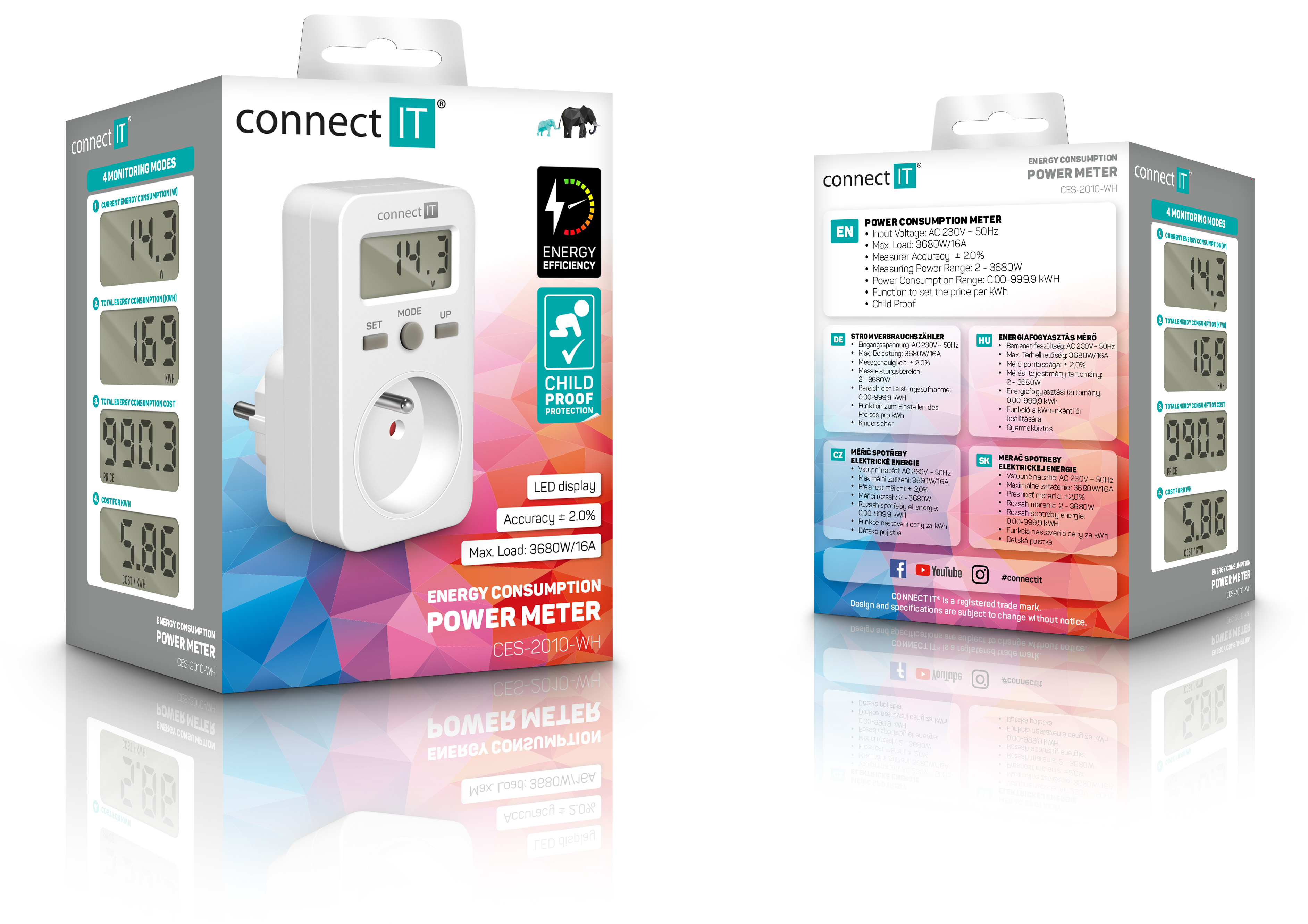 Klíčové vlastnosti: Digitální měřič CONNECT IT "PowerMeter" s jednoduchým designem slouží k měření spotřeby elektrické energie různých domácích spotřebičů. Měřič disponuje velkým LED displejem a jednoduchým ovládáním. Díky tomu je velmi přehledný a spolehlivý.
