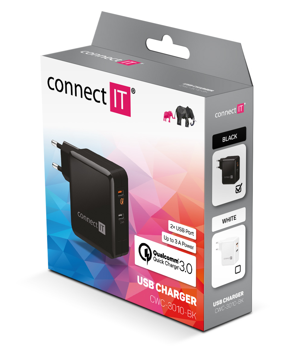 CONNECT IT QUICK CHARGE 3.0 nabíjecí adaptér 2x USB (3,4A), QC 3.0 - Černá