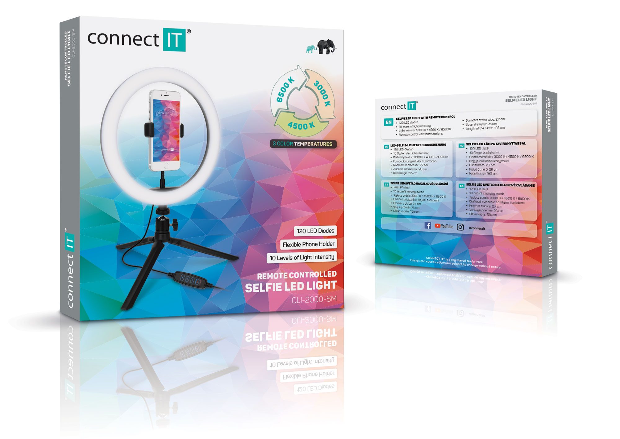 Klíčové vlastnosti: Kruhové selfie LED světlo "Selfie10Ring" s flexibilním držákem na mobilní telefon, stativem s kulovou hlavou a dálkovým ovládáním pro domácí i profesionální použití umožňuje nastavit barevnou teplotu světla na 3 různé úrovně (3000/4500/6500 K).