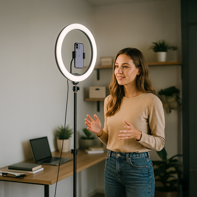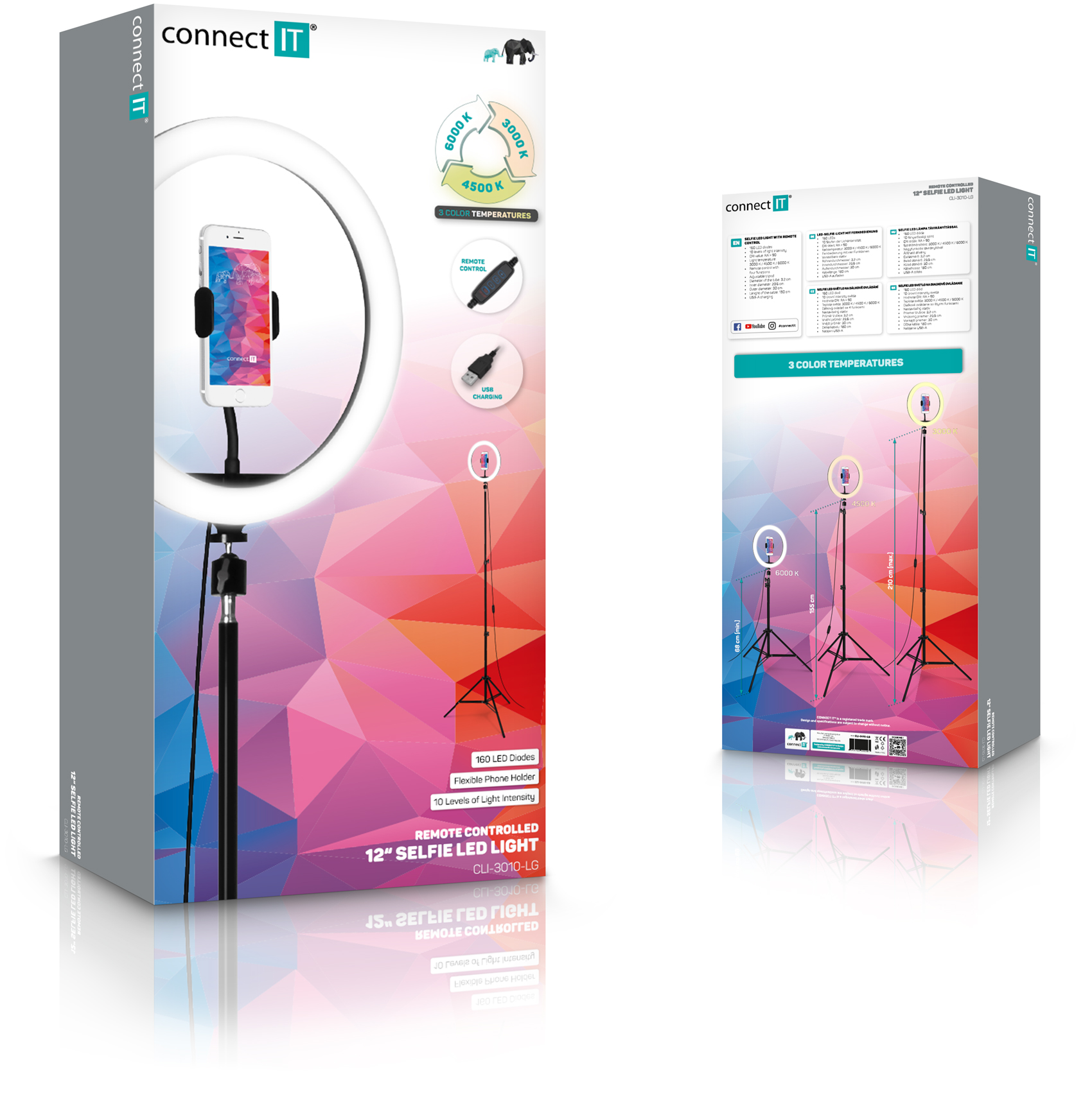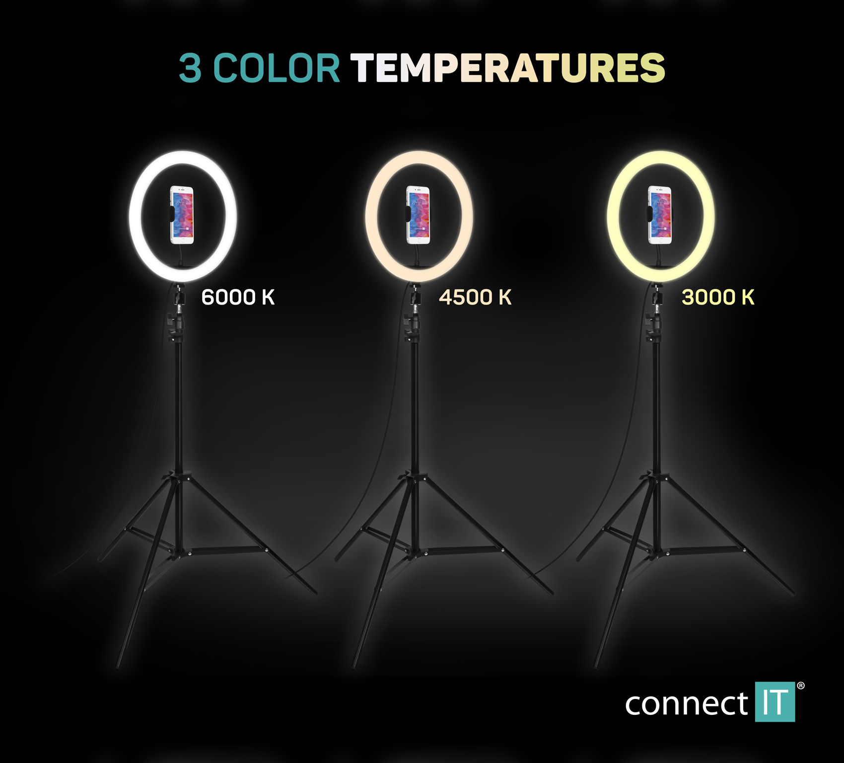 Klíčové vlastnosti: Kruhové selfie LED světlo "Selfie12Ring" s flexibilním držákem na mobilní telefon, stativem s maximální výškou 210 cm, kulovou hlavou a dálkovým ovládáním pro domácí i profesionální použití umožňuje nastavit barevnou teplotu světla na 3 různé úrovně (3000/4500/6000 K).