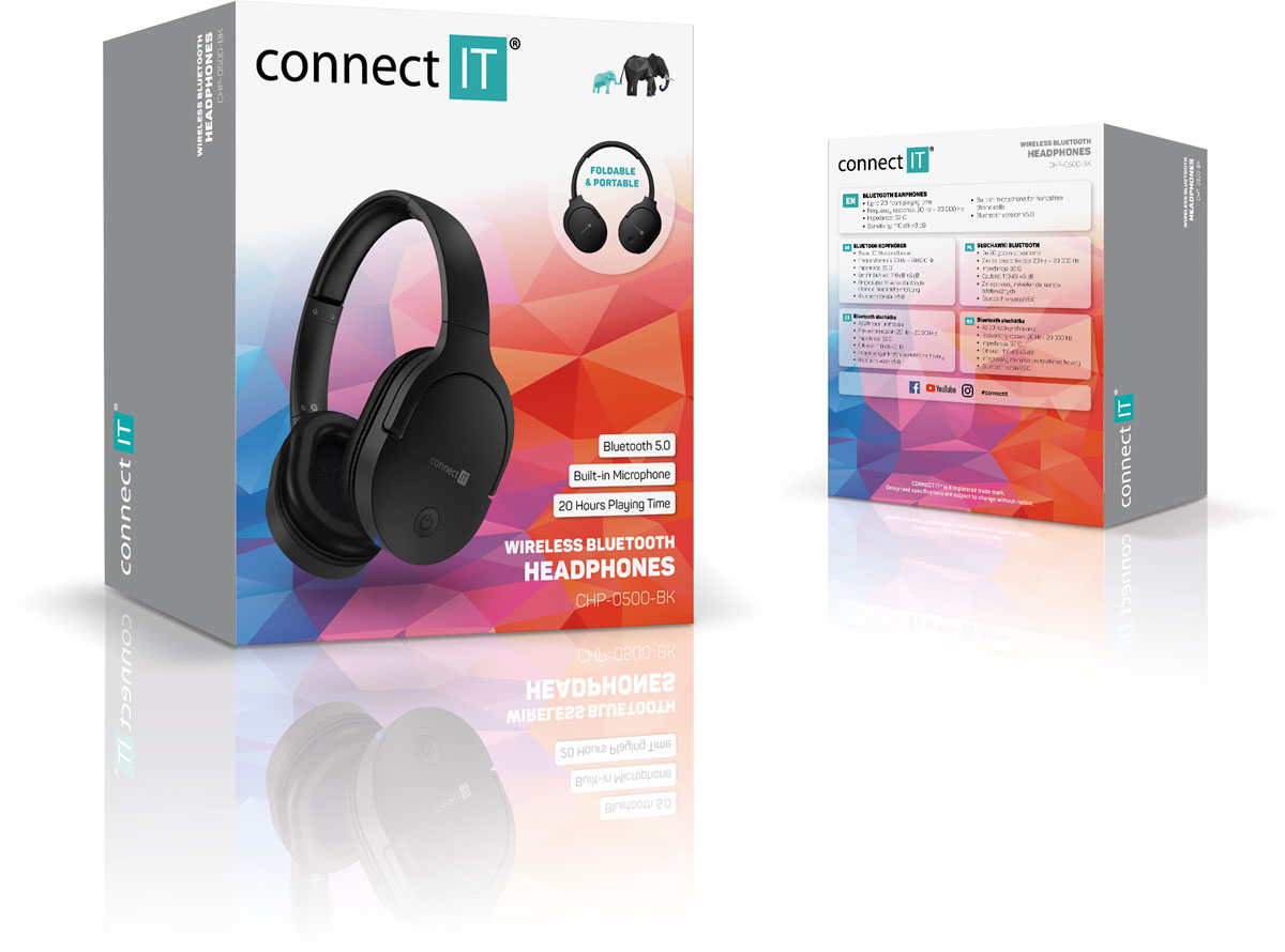 Klíčové vlastnosti: Přenosná bezdrátová Bluetooth sluchátka CHP-0500-BK s možností sklopení obou mušlí pro pohodlný transport.