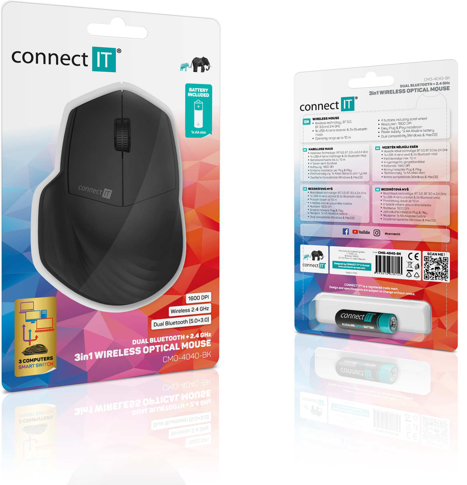 Výhody produktu: Unikátní technologie Triple SmartSwitch umožňuje používat myš až na třech zařízeních, které podporují BT 5.0, 3.0 nebo disponují USB-A vstupem. Tato funkce je ideální pro profesionální i domácí použití všude tam, kde je potřeba pracovat s jednou myší střídavě na více počítačích nebo noteboocích. Levé a pravé tlačítko myši vybavené technologií SilentClick s tichým chodem, který při klikání nevydává žádný zvuk. Samozřejmostí je integrovaný úložný prostor pro USB Nano přijímač pod krytkou bateriového prostoru. Součástí balení je originální alkalická tužková baterie CONNECT IT.