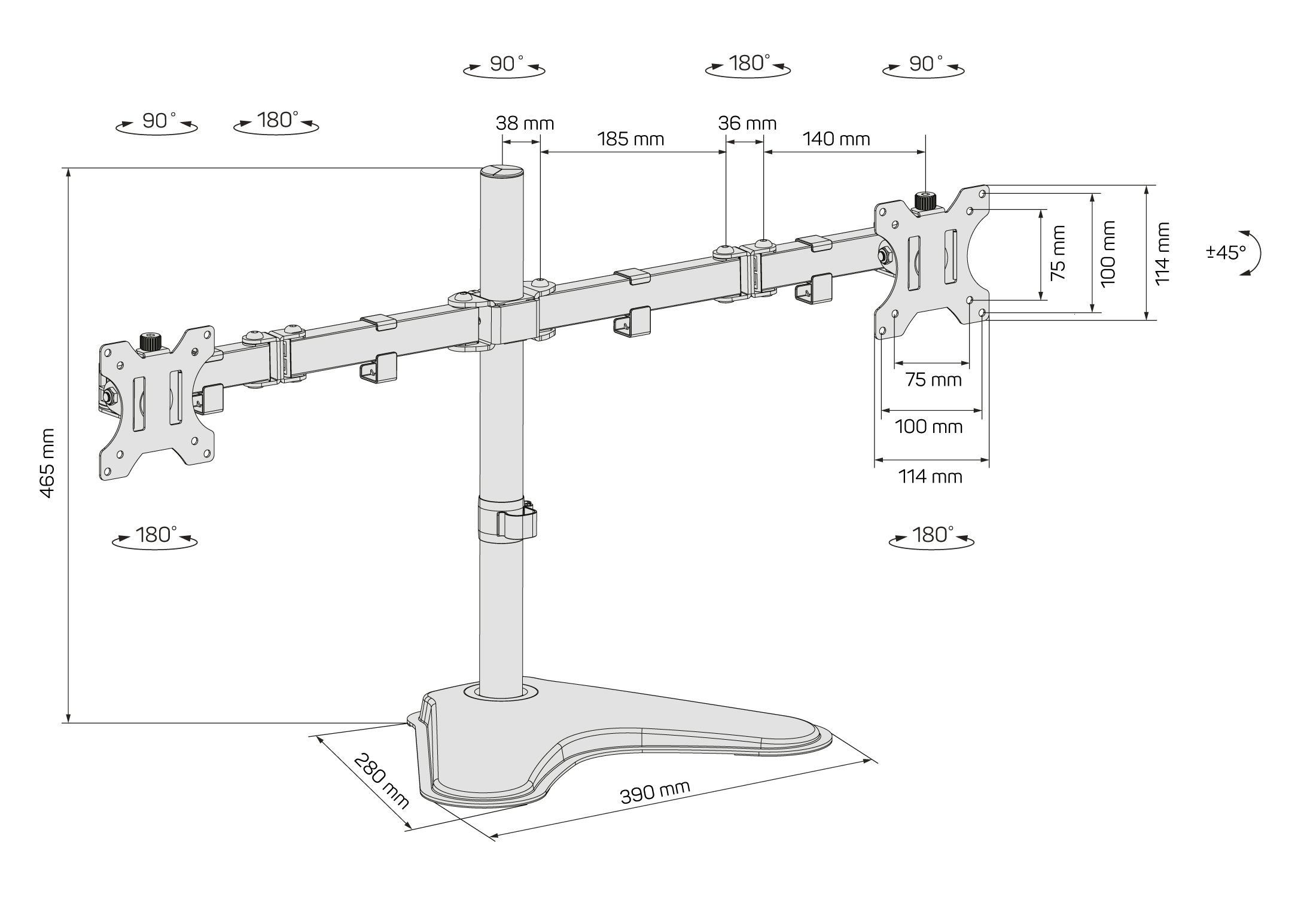 Technické údaje: Kompletní seznam podporovaných roztečí VESA:; VESA 75×75; VESA 100×100; Držák nevyžaduje připevnění k desce stolu (je vybaven stabilním podstavcem); Možnost instalace kdekoliv na pracovní desce (i uprostřed stolu); Možnost nezávislého nastavení obou monitorů do rozdílných poloh.