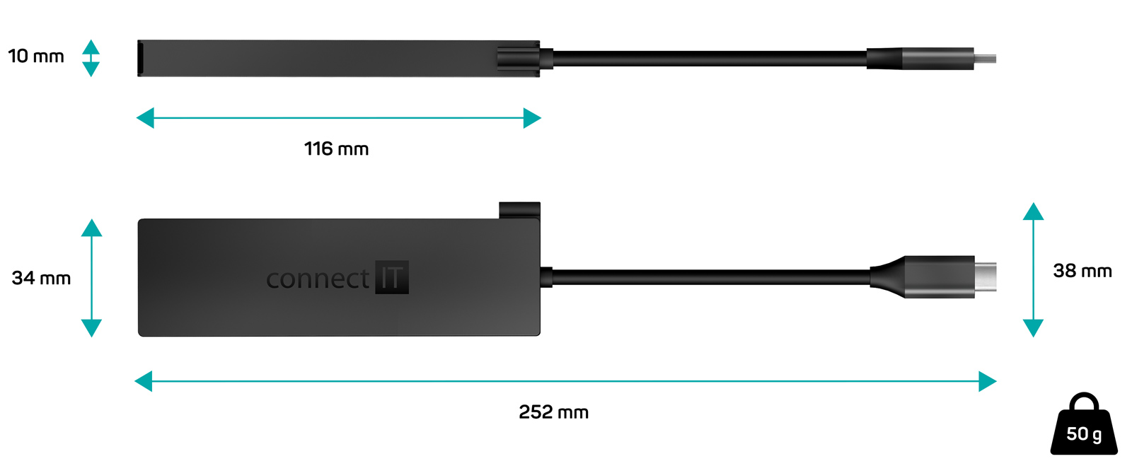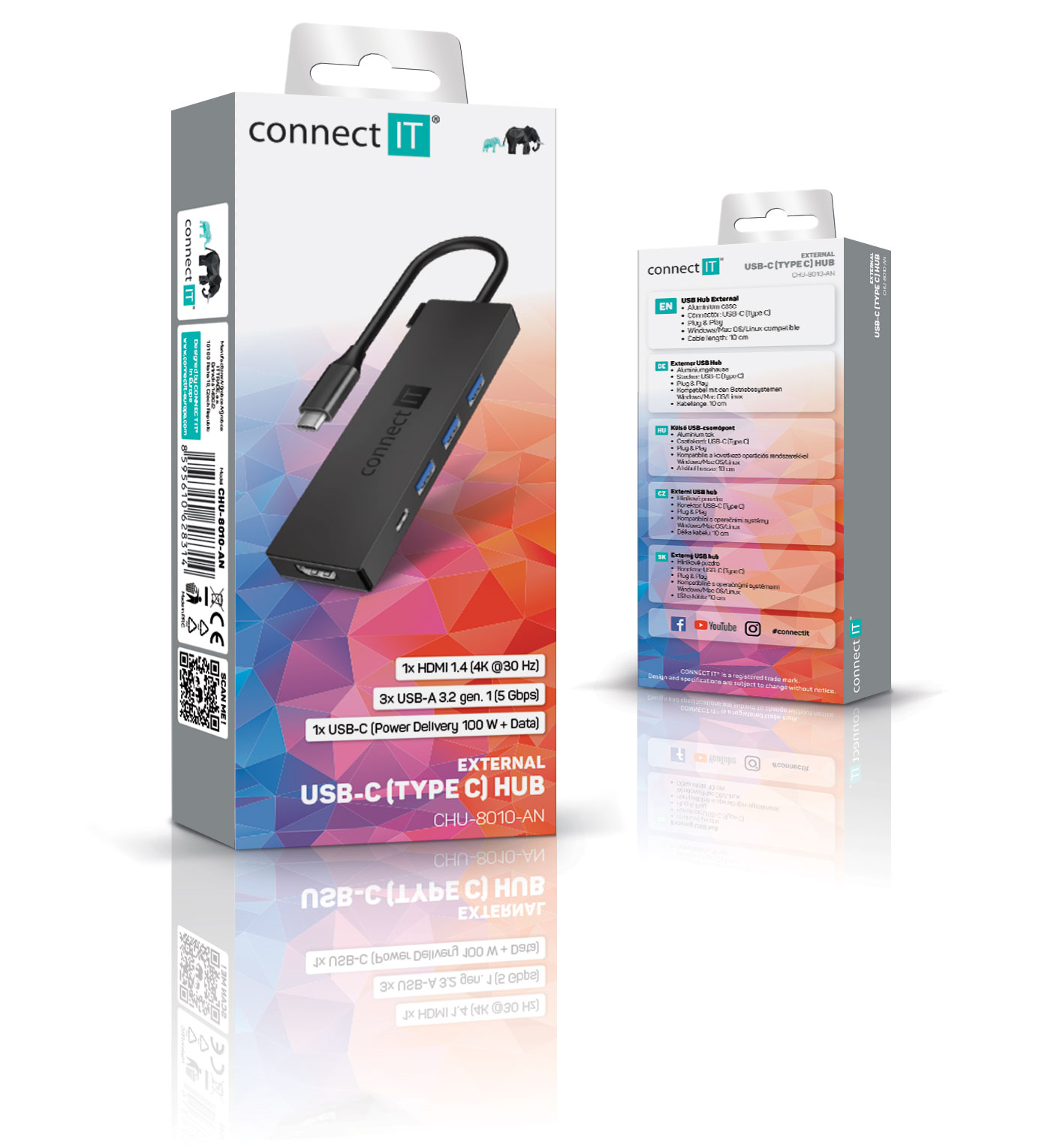 Výhody produktu: Umožní napájení a připojení dalších periferií jako jsou např. monitor, projektor, televize, myš, klávesnice, MP3 přehrávač, scanner, tiskárna, digitální fotoaparát, externí pevný disk, flashdisk atd. Jedná se o výborný doplněk běžných stolních počítačů i přenosných notebooků, které nemají dostatek vlastních portů. Díky svým kompaktním rozměrům se jedná o ideální příslušenství k notebookům na cesty. Pro připojení k počítači je určeno rozhraní USB-C (Type-C). Napájený je z USB portu počítače nebo notebooku, tudíž nepotřebuje žádné další napájení. K hubu můžete připojit jakékoli zařízení standardu HDMI, USB-C (Type-C), USB 3.0, 2.0 nebo 1.1 jako jsou myš, klávesnice, MP3 přehrávač, scanner, tiskárna, digitální fotoaparát, externí pevný disk, flashdisk atd.