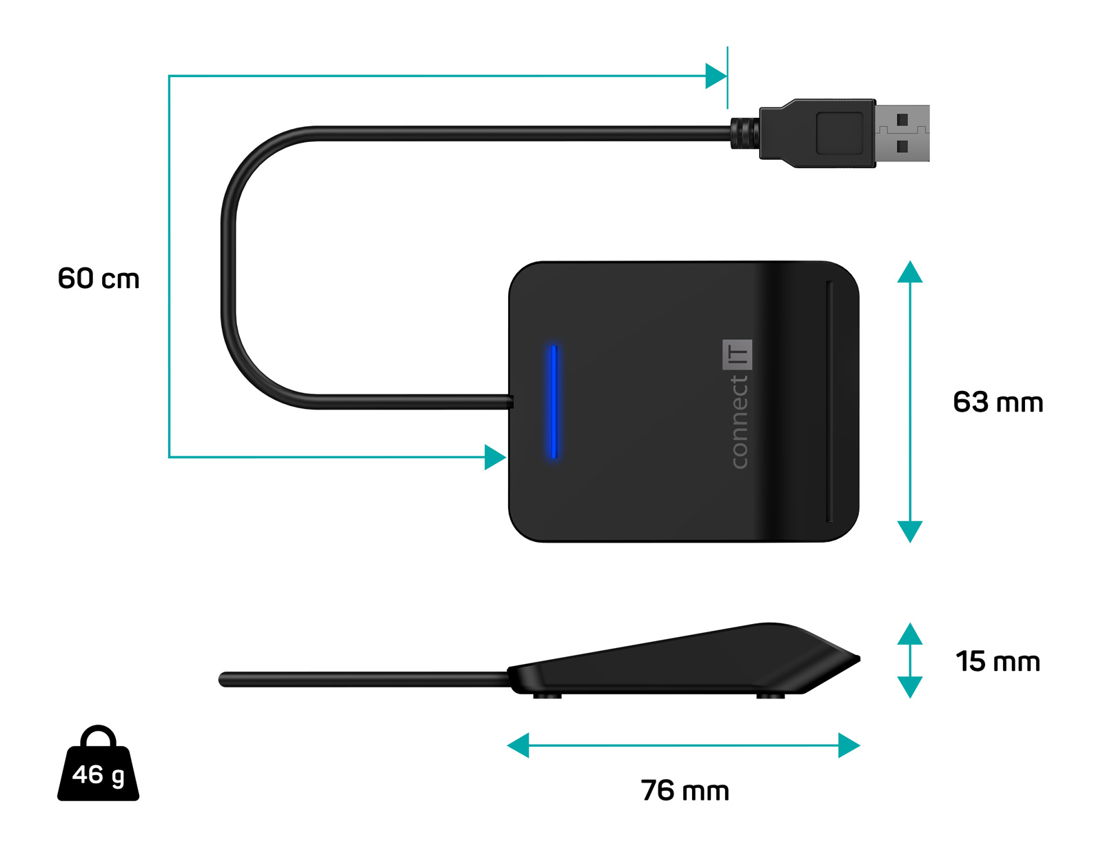 Technické údaje: Externí čtečka eObčanek a čipových karet s rozhraním USB-A; Slot Smart Card s podporou:; eObčanek; bankovních karet s čipem; Smart karet; Automatická detekce karet.