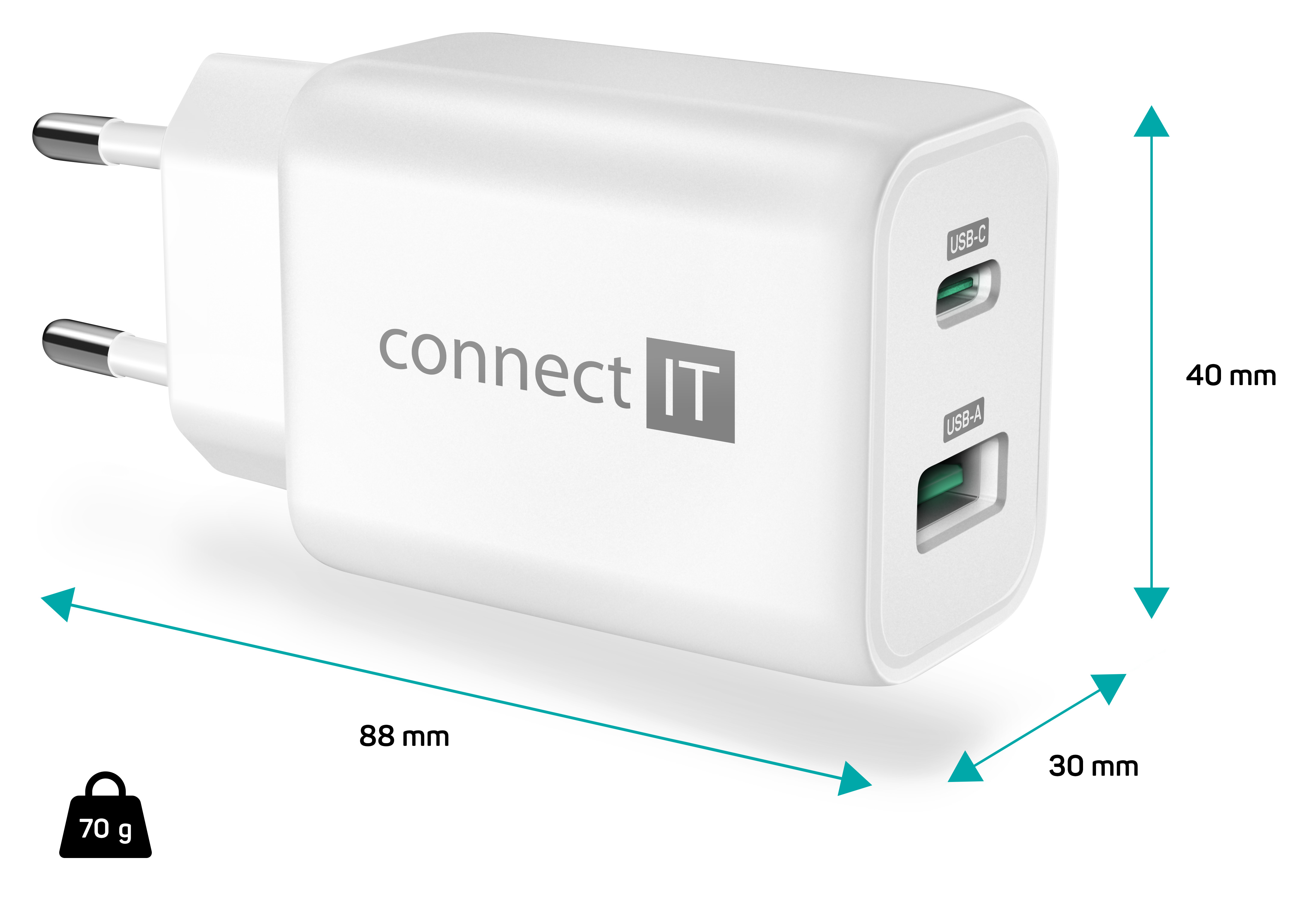 CONNECT IT Wanderer2 GaN nabíjecí adaptér 1×USB-C + 1xUSB-A, 33W PD - Bílá