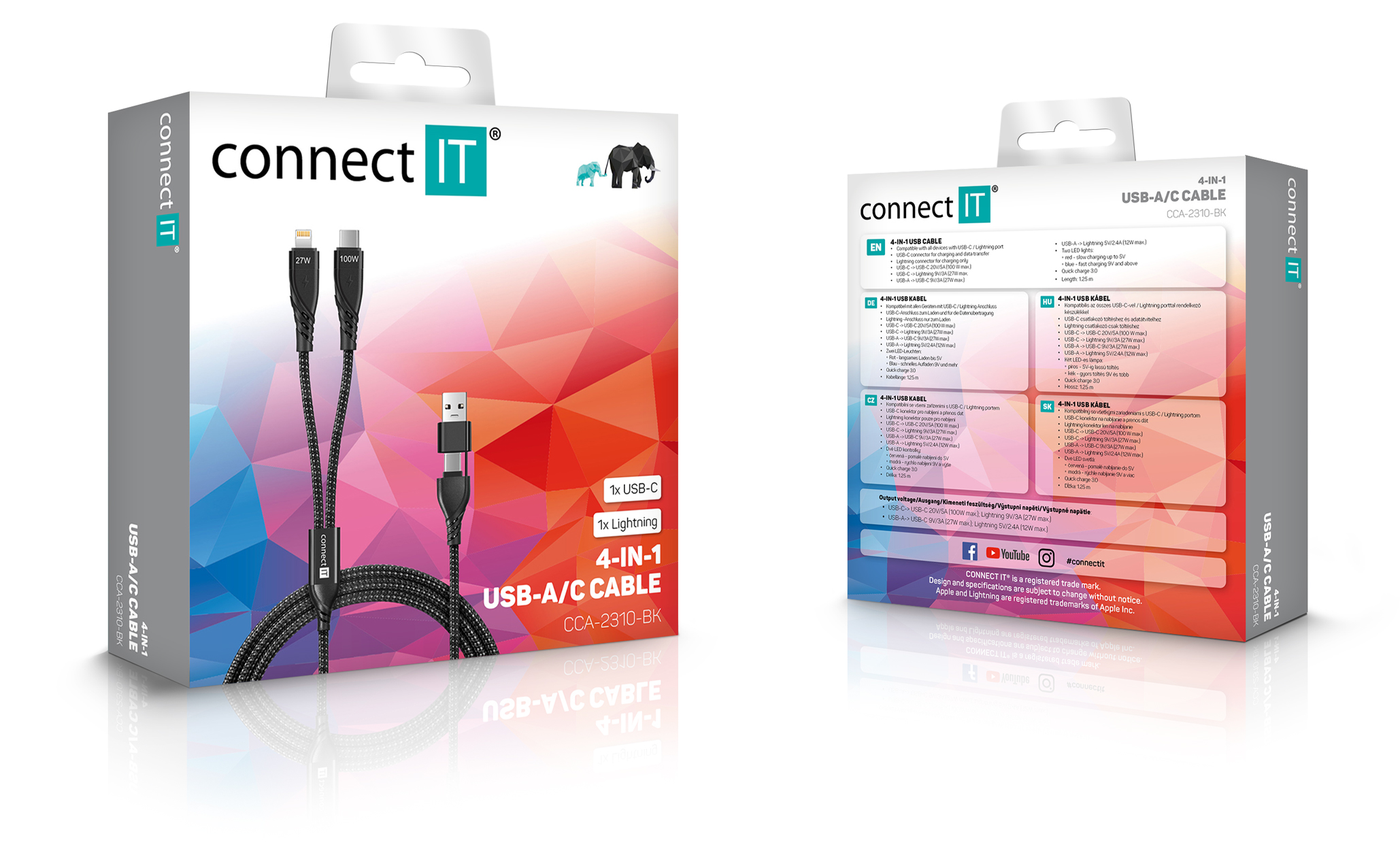 Klíčové vlastnosti: Univerzální nabíjecí kabel 4v1 pro nabíjení zařízení s konektory 1x USB-C a 1x Lightning se vstupním konektrom USB-C a redukcí na USB-A. Umožňuje nabíjení až dvou zařízení současně s podporou rychlého nabíjení pomocí max. proudového toku 5 A. Speciální manžetová nadstavba konektorů zaručuje lepší přístupnost k nabíjecím zdířkám mobilních telefonů v pouzdrech.