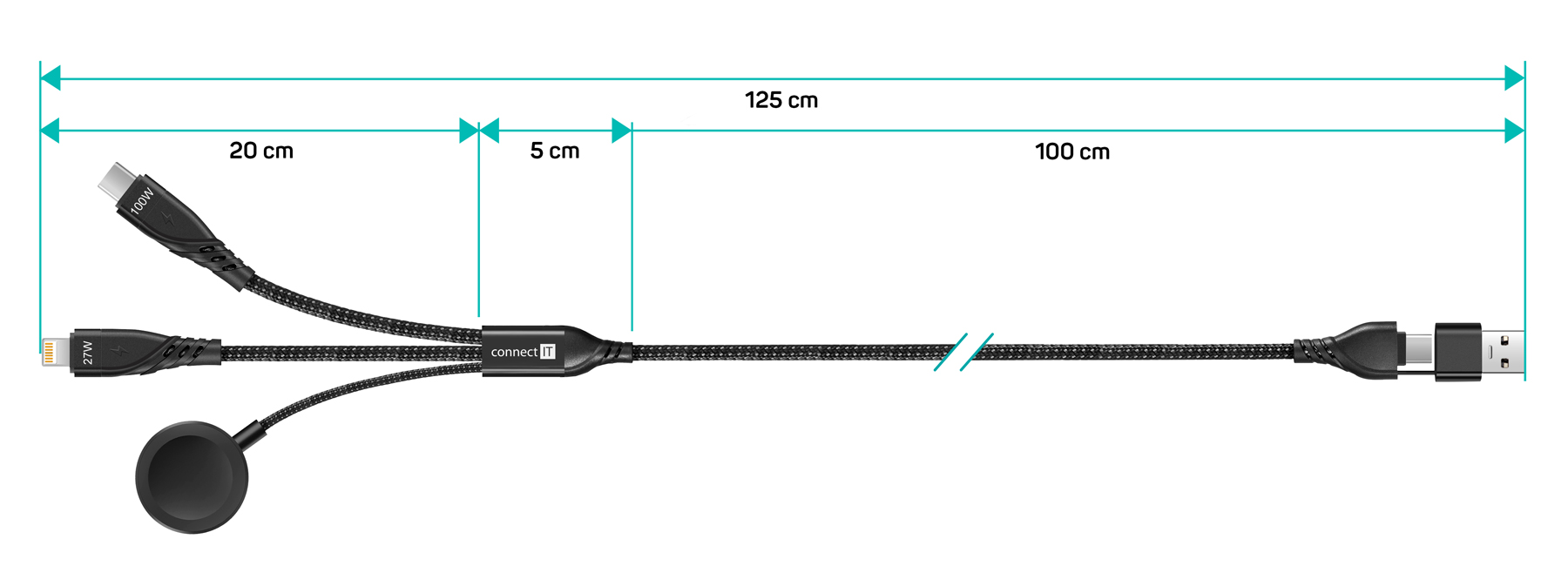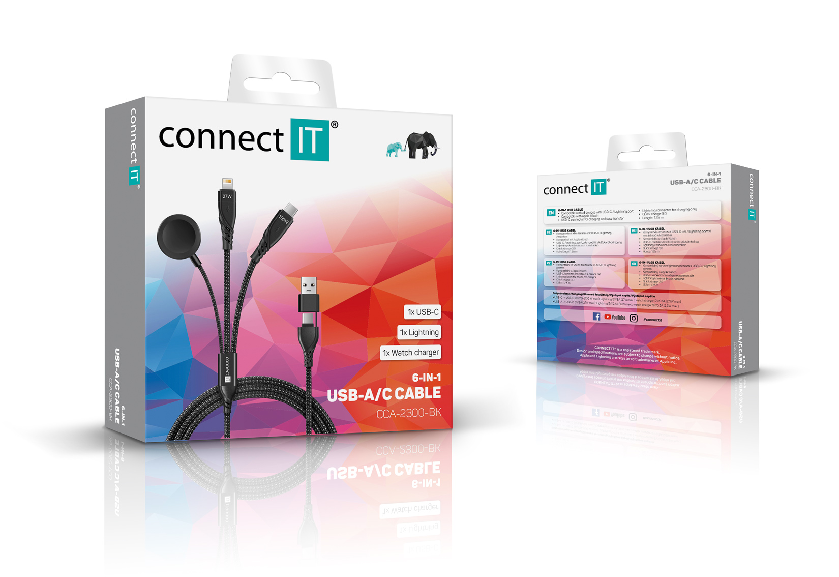 CONNECT IT Wirez 6in1 1x USB-C 1x Lightning 1x Watch charger 1,25 m - Černá